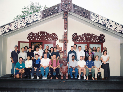 Group photo for NZCSRSC 1999, pictured: Yong Wong, Don Smith, Gordon Paynter, Burkhard Wunsche, Brendon Woodford, David McWha, John Cleary, Steve Jones, Stuart Yeates, Brent Martin, Chu-Kuan Lin, Alvin Yeo, Joe Prachuabmoh, Bin Meng, Simon McCallum, Steve Mills, Richard Littin, Robin Ottee, Mark Staveley, Aaron Roydhouse, David Ferry, Annette Bainbridge, Ian Witten, Yingying Wen, Feng Goo, Jacky Baltes, David Bainbridge, Channa Rajanayaka, Bruce McKenzie, Sasha Rubin, Stuart Marshall
