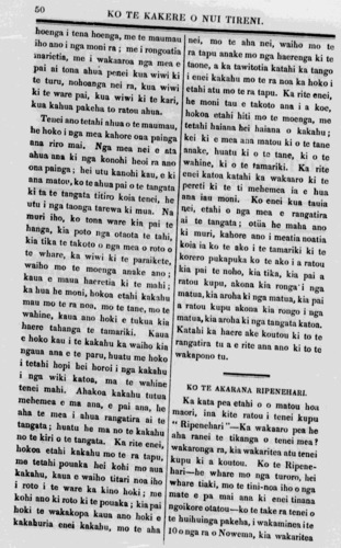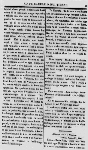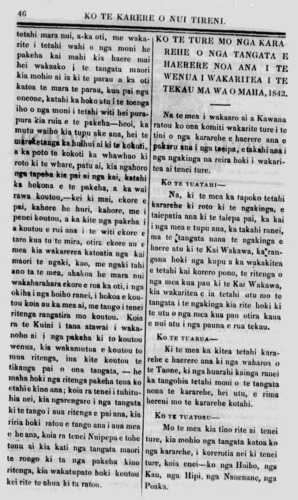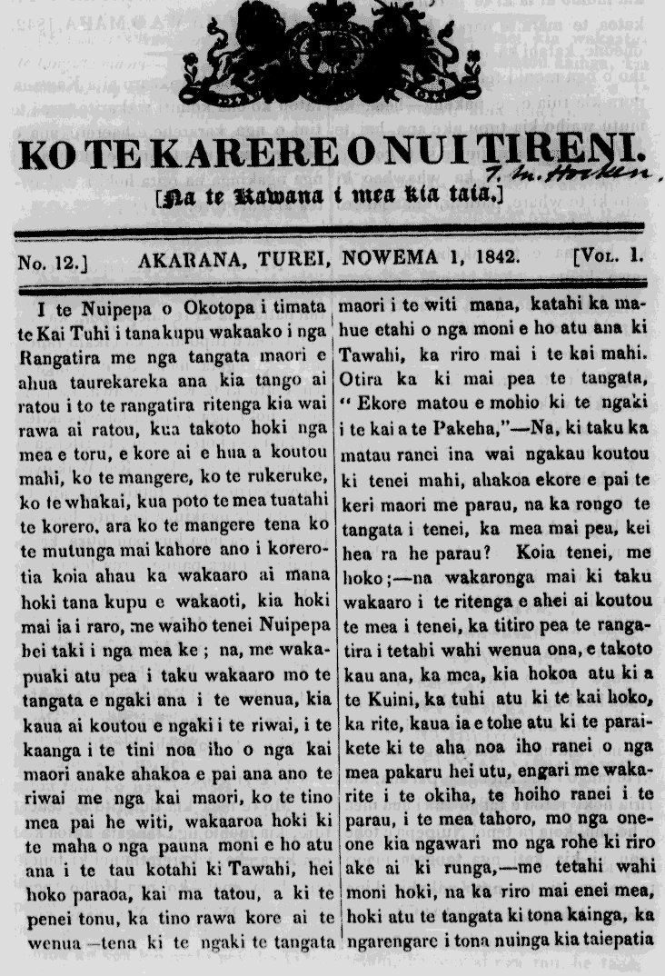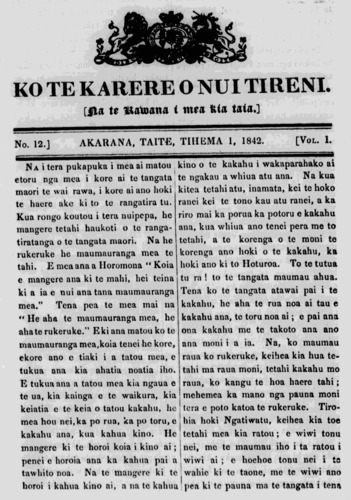 KO TE KARERE O NUI TIRENI. No 12 AKARANA TUREI NOWEMA 1, 1842. VOL. 1. I te Nuipepa e Oketopa timata te Kai tuhi tana kupu wakaako i nga Rangatira me nga tangata maori e ahu, taurekareka ana kia tango ai ratou i to te rangatira ritenga kia wai rawa ai ratou, kua takoto hoki nga mea e toru e kore ai hua e koutou mahi ko te mangere, ko te rukeruke, ko te whakai, kua poto te mea tuatahi te korero ara ko te mangere tena ko te mutunga mai kahore ano i korerotia koia ahau ka wakaaro ai mana hoki tana kupu e wakaoti kia hoki mai ta raro me waiho tenei Nuipepa hei taki i nga mea ke; na, me wakapuaki atu pea taku wakaaro mo te tangata e ngaki ana te wenua, kia kaua ai koutou e ngaki i te riwai, i te kaanga i te tini noa iho o nga kai Maori anake ahakoa e pai ana ano te riwai me nga kai maori, ko te tino mea pai te wai wakaaroa hoki ki te maha o nga patua moni he atu ana te tau kotahi ki Tawahi hei hoko paraoa, kai ma tatou, e ki te penei tonu, ka tino rawa kore ai te wenua tena ki te ngaki te tangata maori i te witi mana, katahi ka mahue etahi o nga moni e ho atu ana ki Tawahi ka riro mai te kai mahi. Otira ka ki mai pea te tangata, Ekore matou e mohio ki te nga h te kai a te Pakeha Na, ki taku ka matau ranei ina wai ngakau koutou. ki tenei mahi, ahakoa ekore e pai te keri maori me Parau, na ka rongo te tangata tenei ka mea mai pea, kei hea ra te parau? Koia tenei me hoko na wakaronga ma, ki taku wakaaro i te ritenga e ahei ai koutou te mea tenei, ka titiro pea te rangatira tetahi wahi wenua tana e takoto kau ana ka mea kia hokoa atu ki a te Kuini ka tuhi atu ki te kai hoko ka rite, ka ia e tohe atu ki te paraikete ki te aha noa iho ranei o nga mea pakaru hei utu engari me wakarite te okiha, te hoiho ranei i te parau i te mea tahoro mo nga oneone kia ngawari rohe ki riro ake ai ki runga me tetahi wahi moni hoki, na ka riro mai enei mea hoki atu te tangata ki tona kainga, ka ngarengare tona nuinga kia taiepatia