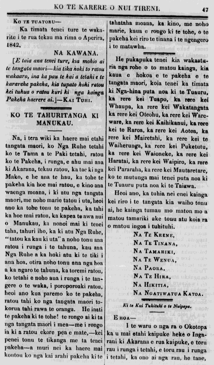 KO TE TUATORU Ka timata tenei ture te wakarite i te rua tekau ma rima o Aperira,, 1842. NA KAWANA. E taia ana tenei ture, kia mohio ai te tangata maori kia tika hoki te ratou, wakaaro ana ka pau te kai a tetahi e te, kararehe pakeha, kia tupato hoki ratou kei tukua e ratou kuri ki nga kainga, Pakeha haerere ai - KaiTuhi KO TE TAHURITANGA KI MANUKAU. Na, tera wiki ka haere mai etahi tangata maori, ko Nga Ruhe tetahi ko te Tama e te Paki tetahi ratou ko te Pakeha i runga, e aku mai ana ki Akarana, tekau ratou, ka tae kia a Mako, he ana te hau, ka tohe te pakea ka kia hoa mai ratou e kino ana waenga moana ki atu nga tangata maori, me noho marie tatou i uta heoi ano ka tohe tonu te pakeha. ka tahi ka hoa mai ratou, ka kapea te awa nui o Manukau, ka nonoi mai ki tenei taha, tahuri iho, ka ki atu Nga Ruhe, E tatou ka kau ki uta e noho tonu ana ratou i runga i te tahuna kau ana Nga Ruhe a ka hoki atu ki te tiki i ana hoa, otira noho tonu ana nga hoa a ka ngaro te tahuna ka toremi ratou, ko tetahi e noho ana i runga i te tangere o te waka i poroporoaki ratou, heoi ano kua paremo ko te pakeha, ratou tahi ko nga tangata maori tokorua tahi rawa te oranga He inati te pakeha ki te tohea te rongo aki ta nga tangata maori i mea, me i rongo ia ki a ratou ekore i pea e mate kei penei tonu te tikanga me ta tenei pakeha a muri nei ka haere mai koutou ko nga kai arahi pakeha ki te tahataha moana, ka kino, me noho marie, kaua e rongo ki te tohe, o te pakeha kei riro te tinana i te ngengero i te matawha. He pukapuka tenei kia wakaaturia nga rohe o to matou kainga kia ka hokoa e te pakeha e te tangata maori, koia tenei timata ki Ngahina puta noa ki te tuauru, ka rere kei Tuapo, ka rere kei Whaupa ka rere kei Wakatangata ka rere kei Oteohu, ka rere kei Wareware ka rere kei Kaihikanui, ka rere kei te Karoa, ka rere kei Aotea, ka rere kei Mairetahi ka rere kei te waiherunga ka rere kei Puketutu, ka rere kei Waioneke, ka rere kei Haratai, ka rere kei Waipiro, ka rere kei Pararaha, ka rere kei mautaretare, ko te mutunga mai tenei puta noa ki te tuauru puta noa ki te Taiawa. Heoi ano ka tuhia nei enei kainga kei riro i te tangata kia waiho tonu au te kainga tumau mo matou mo a matou tamariki ake tonu atu koia ra o matou ingoa i tuhituhi. NA TE KEENE, NA TE TINANA, Na TAMAHIKI, NA TE WENUA, NA PAORA, NA TE HIRA, Na HIKITIA, NA NGATIWATUA KATOA. Ki te Kai tuhituhi o te Nuipepa. E Hoa I te waru o nga ra o Okotopa ka e mai etahi kaipuke heke o Ingarani Akarana e rua kaipuke e toru rau runga i tetahi e toru rau i runga i tetahi, ka ono ai nga rau, he tane,