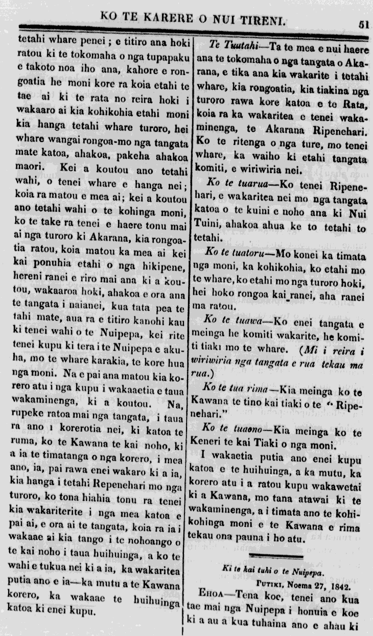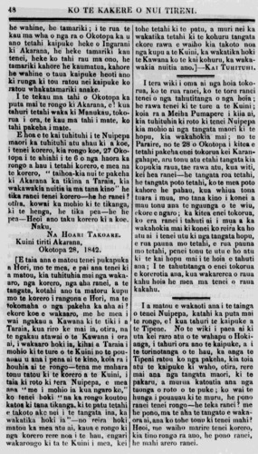 he wahine, te tamariki i te rua te kau ma wha o nga ra e Okotopa ka ano tetahi kaipuke heke Ingarani ki Akarana, he heke tamariki kau tenei heke ko tahi rau ma ono, he tamariki kahore he kaumatua, kahore he wahine o taua kaipuke I heoti ano ki runga ki tou ratou nei kaipuke ko ratou whakatamariki anake I I te tekau ma tahi e Okotopa ka puta mai te rongo ki Akarana, e kua tahuri tetahi waka ki Manukau tokorua i ora te kau ma tahi i mate, ko tahi pakeha i mate " E hoa e te kai tuhituhi i te Nuipepa maori ka tuhituhi atu ahau ki a koe, i tenei korero kia rongo koe, 27 Okotopa i te ahiahi i te 6 o nga haora ka rongo ahau tetahi korero, e mea na te korero taihoa kia nui te pakeha ki Akarana ka tikina e Taraia kia wakawakia nuitia ia ma tana kino he tika ranei tenei korero te he ranei ? otira, kowai ka mohio ki te tikanga, ki te henga te tika pea te he pea. Heoi ano taku korero ki a koe. Naku, NA HOARI TAKOARE. Kuini tiriti Akarana, Okotopa 28, 1842. E taia ana e matou tenei pukapuka a Hori mo te mea e pai ana tenei ki a matou kia tuhituhia mai nga wakaaro nga korero nga aha ranei a te tangata, kotahi ano te Maori kupu mo te korero rangona e Hori ma te tokomaha o nga pakeha ka aha ai? ekore koe e wakaaro me te mea i wi, ngakau e Kawana ki te tiaki i a Taraia kua riro ke mai ia, otira, na te ngakau atawai o te Kawana i ora ai i wakaaro hoki ia kihai a Taraia i mohio ki te ture e te Kuini no te pouauau u ana i pena i ai te kino, koia ra i houhia ai te rongo a tena me mahara tonu tahi ki te korero a te Kuini, i tana ki roto ki tera Nuipepa e mea ana I me i mohio ia kua ngaro ke" ke e tenei, hoki 14 na ka rongo koutou katoa ki taua manga ki te patu tetahi e takoto ake nei i te tangata ina, ka wakatika te hoki iti a no reira hoki matou ka mea atu ai, kaua e rongo ki nga korero rere noa te hau, engari wakarongo ki ta te Kuini i mea, kei tohe tetahi ki te patu a muri nei ka wakatika tetahi ki te kohuru tangata ekore rawa e waiho kia takoto noa nga kupu a te Kuini, ka wakatika hoki te Kawana ko te kai kohuru, ka wakawakia nuitia ano KAI TUHITUHI, I tera wiki i oma ai nga hoia tokorua ko te rua ranei ko te toru ranei tenei o nga tahuritanga o nga hoia he rawa tenei ki te ture a te Kuini, koia ra e Meiha Pumapere i kiia ai, kia tuhituhia ki roto ki tenei Nuipepa kia mohio ai nga tangata Ma maori ki te hopu, kia wakahokia mai no te Paraire,, no te i8 o Okotopa kitea e tetahi pakeha enei tokorua kei Karangahape atu tonu atu etahi tangata kia kopukia raua tae rawa atu, kua witi, kei hea ranei te tangata roa tetahi, te tangata poto tetahi ko te mea poto kahore he pahau, kua tahi tona tuara i mua mo tana kino i konei a mau tonu ana te ngaunga o te wiu, ekore e ngaro ka kitea enei tokorua, ko era ranei tahuti ai i mua a ka wakahokia mai ki konei ko reira ka ho atu ai tenei utu ki nga tangata hopu, e r pauna mo tetahi e rua pauna mo tetahi, penei tonu te utu ho atu ki te kai hopu mai te hoia e tahuti ana i te tahuritanga o enei tokorua e korerotia ana kua wakarerea e raua kahu hoa, he mea ma tenei e raua kakahu. I a matou e wakaoti ana te tanga o tenei Nuipepa epa, katahi ka puta mai te rongo e kua tahuri te kaipuke a te Tipene. No te wiki i paea ai ki uta kei raro atu o te wahapu o Hokianga, tahuri era ano te kaipuke a i te torinotanga o te hau, ka anga te Tipene o ratou ko nga pakeha, kia toia. atu te kaipuke ki waho, otira rere mai ana nga tangata maori ki te pakaru, a murua katoatia ana nga taonga o roto o te puke; ko wai te hunga i pouauau ki te muru te pono ranei tenei, rongo he teka ranei? me he pono, ma te aha te tangata e wakaora ai ana ko tohe tonu ki tenei mahi? Heoi, me waiho marire tenei korero, kia tino rongo ra ano te pono ranei, he mahi arero ranei.