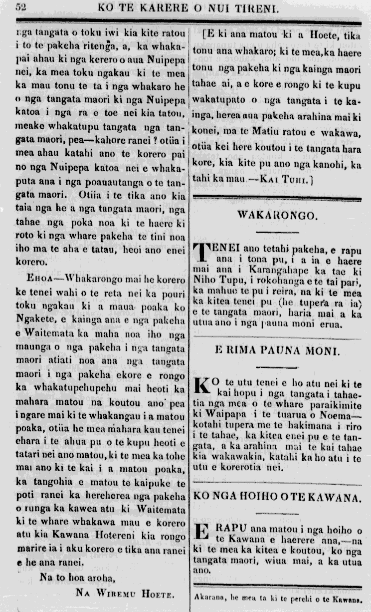 nga tangata o toku iwi kia kite ratou i to te pakeha ritenga, a, ka whakapai ahau ki nga korero a Nuipepa nei, ka mea toku ngakau ki te mea ka mau tonu te tai nga whakaro he o nga tangata maori ki nga Nuipepa katoa i nga ra e toe nei kia tatou, meake whakatupu tangata nga tangata maori, pea, kahore ranei? otiia i mea ahau katahi ano te korero pai no nga Nuipepa katoa nei e whakaputa ana i nga poauautanga o te tangata maori. Otiia i te tika ano kia taia nga he e nga tangata maori nga tahae nga pokanoa ki te haere ki roto ki nga whare pakeha te tini noa iho ma te aha e tatau heoi ano enei korero. EHOA- Whakarongo mai te korero ke tenei wahi o te reta nei ka pouri toku nakau ki a maua poaka ko Ngakete, e kainga ana e nga pakeha e Waitemata ka maha noa iho nga maunga o nga pakeha i nga tangata maori atiati noa ana nga tangata maori i nga pakeha ekore e rongo ka whakatupehupehu mai heoti ka mahara matou na koutou ano pea i ngare mai ki te whakano au i a matou poaka, otiia he mea mahara kau tenei ehara i te ahua pa o te kupu heoti e tatari nei ano matou ki te mea ka tohe mai ano ki te kai i a matou poaka, ka tangohia e matou te kaipuke te potu ranei ka hereherea nga pakeha o runga ka kawea atu ki Waitemata ki te whare whakawa mau e korero atu kia Kawana Hotereni kia rongo marire ia i aku korero e tika ana ranei e te ana ranei. Na to hoa aroha, NA WIREMU HOETE. E ki ana matou ki a Hoete tika tonu ana whakaro ki te mea ka haere tonu nga Pakeha ki nga kainga maori tahae ai a e kore e rongo ki te kupu wakatupato e nga tangata te kainga herea a pakeha arahina mai ki konei ma te Manu ratou e wakawa, otiia kei here koutou i te tangata hara kore kia kite pu ano nga kanohi ka tahi ka mau Kai Tuhi. WAKARONGO. TENEI ano tetahi pakeha e rapu ana tona pu, i a ia e haere mai ana i Karangahape ka tae ki Niho Tupu, rokohanga e te tai pari ka mahue te pu i reira, na ki te mea ka kitea tenei pu (he tupera ra ia) e te tangata maori haria mai e ka utua ano i nga pauna moni erua E RIMA PAUNA MONI. Ko te utu tenei he atu nei ki te kai hopu i nga tangata i tahaetia ma mea e te whare paraikimite ki Waipapa te tuarua o Noema kotahi tupera me te hakimana i riro i te tahae, ka kitea enei pu e te tangata, a ka arahina mate kai tahae kia wakawakia, katahi ka hata i te utu e korerotia nei. KO NGA HOIHO O TE KAWANA. E rapu ana mate i nga hoiho o E te Kawana e haerere ana, na ki te mea ka kitea e koutou, ko nga tangata maori wiua mai, a ka utua ano. Akarana, he mea te ki te perehi o te Kawana.