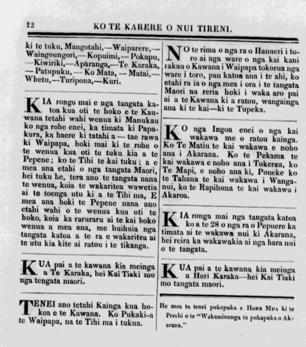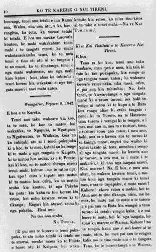 -haurangi, tenei ano tetahi e inu llama \_ana, Waina, -aha noa atu, a ka haurangitia, ka .tutu, ka. wawai tetahi ki tetahi, E hoa ma* meake turorotia koutou, he mahi wakakahore tenei mahi i te tangata maori., he mahi wakataurekareka tenei, ko te mea tenei e tino oti atu ai te tangata i te ao maori, ko te timatanga tenei o nga mahi wakamate, me nga mahi kino katoa; koia ahau ka tuhituhi i tenei korero kia wakakati ai ..ngatan-.. gata maori i anei mahi katoa. Waingaroa, Pepueri 9, .1842. E hoa e te Kareka Tenei ano taku wakaaro kia koe, ta te mea, ko koe to matou hai wakatika, to Ngapuhi, to Ngatipaoa to Ngatiwatua to Waikato, koia au ka tuhituhi atu ai i tenei pukapuka ki a koe, ta te mea katahi au ka rongo ki te mahi a nga tangata o Kaipara, ki to matou hoa aroha, ki a te Potete; kei ki koe, no to matou ritenga maori tenei mahi, hahore, no to ratou nga-kau apo! otira e tupato 'ana matou ki to matou hoa, otira, ko to matou aroha kia koutou, ki nga *Pakeha ka puta: kia kaha ra tou 'korero kia ratou, kei noho kuware ratou ki te tikanga; Engari kia atawai ratou ki nga pakeha. Heoi ano 'Na-tou hoa aroha' NA TIPENE. [E pai ana te -korero -o tenei pukapuka te. ata noho tetahi ki tetahi me te atawai, meake maua ko te Potete -e -haere atu ki Kaipara, hei waka komite kia ratou, ko reira tino kitea ai te take o tenei mahi.-NA TE KAI TUHITUHI Ki te Kai Tuhituhi o te Karere-o Nui Tireni. E. hoa, Tena ra ko koe, tenei ano taku waakaro, mau pea e mea, -kia taia ki roto ki tau pukapuka, ia rongo ai nga tangata maori katoa; he wakaaro kuware ranei naku, tika ranei, otira, e pai ana kia tuhituhia; Na, koia tenei, te kuwaretanga, o nga tangata maori ki o ratou turoro, ina hoki te rongo ai ratou ki te kupu a te Rata kua. rongo ahau ki etahi tangata i penei ki -te Turoro, na te Haterene taua turoro i wangai ki te rongoa, a i 6 0 mea mai ano ia, aua ra e turituri, tena, eturituri tonu ana rat ou, i mea ano, hoki, aua ra e kawea atu te turoro ki te kainga maori, engari me waiho ki konei takoto ai, tena, nonahea i rongo ai nga tangata maori, 'ka kawea ano ID I te turoro, a ora 'noa ia i mate i te makariri, i ki ano nga tangata maori, Kua marere! Na, E hoa, e mea ana ahau, he wakaro kuware tenei, e mohio koia nga -tangata maori ki tenei mea, e ora te tupapaku, e mate ranei ? Kahore! ekore ratou e mohio.,* kei te Atua ano te tino tikanga, otira, me he mea, he mate, nui te mate o te turoro a e pai ana te Rata kia wangai a taua turoro ki tetahi rongoa kaha a e nui haere te mate, kei ki nga tangata, he tohu ka marere te Wairua, Kahore! na te rongoa kaha ano e nui haere ai te mate, otira, he mea pai ano te rongoa kaha mo te tino mate nui o te tangata Tena, ko te mareretanga, o te Wairua