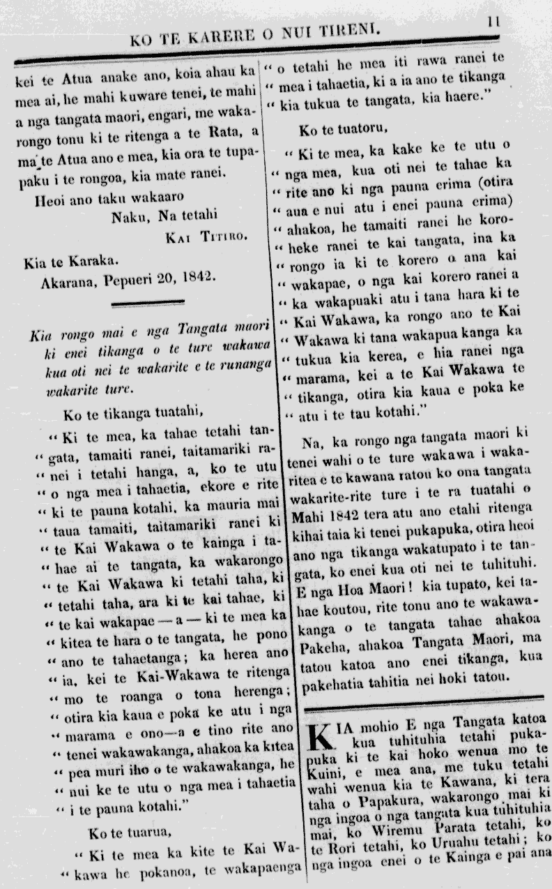 kei -te Atua anake ano, koia ahau ka mea ai, he mahi kuware tenei, te mahi a nga tangata maori, engari, me waka 115 0 rongo tonu ki te ritenga a te Rata, a ma te Atua ano e mea, kia ora te tupapaku i te rongoa, kia mate ranei. Heoi ano taku, wakaaro Naku, Na tetahi KAI TITIRO. Kia te Karaka. Akarana, Pepueri 20, 1842. Kia rongo mai e nga Tangata maori ki enei tikanga o te ture wakawa kiia oti nei te wakarite e te i-unanga Wakarite ture. Ko te tikanga tuatahi, Ki te mea, ka tahae tetahi tangata tamaiti ranei, taitamariki ra nei i etahi hanga a, ko te utu o nga mea i tahaetia, ekore e rite ki te pauna kotahi, ka mauria. mai taua tamaiti, taitamariki ranei ki te Kai Wakawa o te kainga i tahae ai' te tangata, ka wakarongo te Kai Wakawa ki tetahi taha, ki tetahi taha, ara ki te kai tahae, ki te kai wakapae -a -ki te mea ka kitea te hara o te tangata he pono ano te tahaetanga ka herea. ano ia, kei te Kai-Wakawa te ritenga mo te roanga o tona herenga otira kia kaua e pokai ke atu i nga marama e ono, a e tino rite ano tenei wakawakanga, ahakoa ka kitea 0 4 pea muri iho o te wakawakanga he nui ke te utu o nga mea i tahaetia i te pauna kotahi." Ko te tuarua, Ki te mea ka kite te Kai Wa kawa he pokanoa, te wakapaenga o tetahi he mea iti. rawa ranei te mea i tahaetia, ki a ia ano te tikanga kia tukua te tangata, kia haere." Ko te tuatoru, Ki te mea, ka kake ke te utu 0 nga mea, kua oti nei te tahae ka rite ano ki nga paura erima (otira aua e nui atu i enei pauna erima) ahakoa, he tamaiti ranei lie korehere ranei te kai tangata, ina ka rongo ia ki te. korero o. ana kai wakapae, o nga kai korero ranei a ka wakapuaki atu i tana hara ki te Kai Wakawa, ka rongo ano te Kai Wakawa ki tana wakapua kanga ka tukua kia kerea, e hia ranei nga marama, kei a te Kai Wakawa te tikanga otira kia kaua e poka ke atu i te tau kotahi." Na, ka rongo nga tangata maori ki "I 0 tenei wahi o te ture wakawa i waka ritoa e te kawana Tatou. ko ona tangata wakarite-rite ture i te ra tuatahi o Mahi 1842 tera atu ano etahi ritenga kihai taia ki tenei pukapuka, otira heoi ano nga tikanga a wakatupato i te tan ti g tangata ko enei kua oti nei te tuhituhi. E nga Hoa Maori! kia tupato, kei tahae koutou, rite tonu ano te wakawa kanga o te tangata tahae ahakoa 0 Pakeha, ahakoa Tangata Maori, ma tatou katoa ano enei tikanga, kua Pakehatia tahitia nei hoki tatou. Kia mohio E nga Tangata katoa Kkua tuhituhia tetahi pukapuka ki te kai hoko wenua. mo te Kuini, e mea ana, me tuku tetahi wahi wenua kia te Kawana, ki tera taha o Papakura, wakarongo mai ki ngakua tuhituhia ingoa o nga tangata 0 mai, ko Wiremu Parata tetahi ko te Rori tetahi, ko Uruahu tetahi.; ko nga ingoa enei o te Kainga e pai ana ID ngaI
