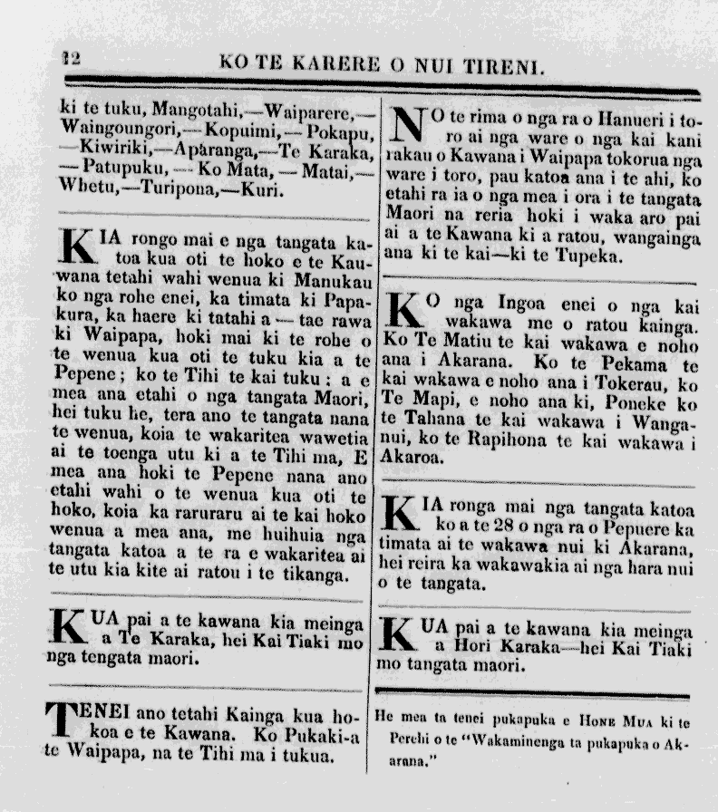ki te tuku., Mangotahi, Waiparere, Waingoungori, Kopuimi, Pokapu, Kiwiriki, Aparanga, Te Karaka, Patupuku, Ko Mata, Matai, Whetu, Ko Mata, Turipona, Kuri. KIA rongo mai e nga tangata katoa kua oti te hoko e te Kauwana tetahi wahi wenua ki Manukau ko nga rohe enei, ka timata ki Papakura, ka haere ki tatahi a tae rawa ki Waipapa, hoki mai ki te rohe o le wenua kua oti te tuku kia a te Pepene, ko te Tihi te kai tuku; a e mea ana etahi o nga -tangata Maori, .hei tuku he, tera ano te tangata nana Ite wenua, koia te wakaritea wawetia ai te toenga utu ki a te Tihi ma, E mea ana hoki te Pepene nana ano etahi wahi o te wenua kua oti te hoko, koia ka raruraru ai te kai hoko wenua a mea ana, me huihuia nga .tangata katoa a te ra e wakaritea ai te utu kia kite ai ratou I te tikanga. KUA pai a te kawana kia meinga a Te Karaka, hei Kai Tiaki mo nga tangata maori. TENEI ano tetahi Kainga kua hokoa e te Kawana. Ko Pukaki, a ,le Waipapa, na te Tihi ma i tukua. NO te rima o nga ra o Hanueri i toro ai nga ' ware o nga kai kani rakau o Kawana i Waipapa tokorua nga ware i toro, pau katoa ana i te ahi., ko etahi ra ia o nga mea i ora i te tangata Maori na reria hoki i waka aro pai ai a te Kawana ki a ratou, wangainga ana ki te kai-ki te Tupeka. 0 nga Ingoa enei o nga kai wakawa me o ratou kainga. Ko Te Matiu, te kai wakawa e noho ana i Akarana. Ko te Pekama te kai wakawa e noho ana i Tokerau, ko Te Mapi, e noho ana ki, Poneke ko te Tahana te kai wakawa i Wanganui ko te Rapihona te kai wakawa i Akaroa. IA ronga mai nga tangata katoa ko a te 28 o nga ra o Pepuere ka timata ai te wakawa nui ki Akarana, hei reira ka wakawakia ai nga hara nui o te tangata. KUA pai a te kawana kia meinga a Hori Karaka, hei Kai Tiaki mo tangata maori. He mea ta tenei pukapuka e HONE MUA ki te Perehi o te "Wakaminenga, ta pukapuka o Akarana."