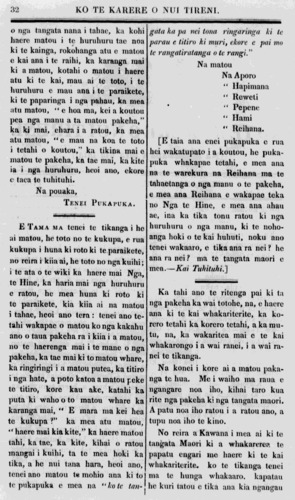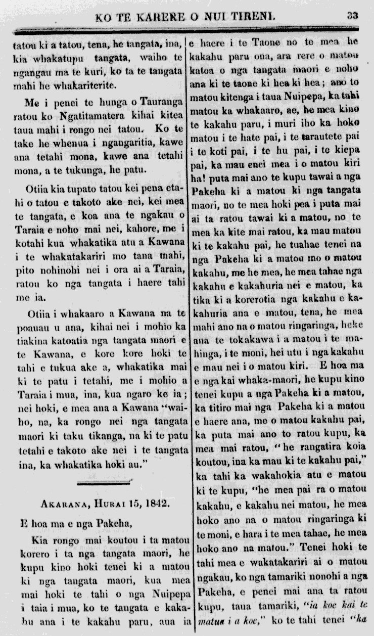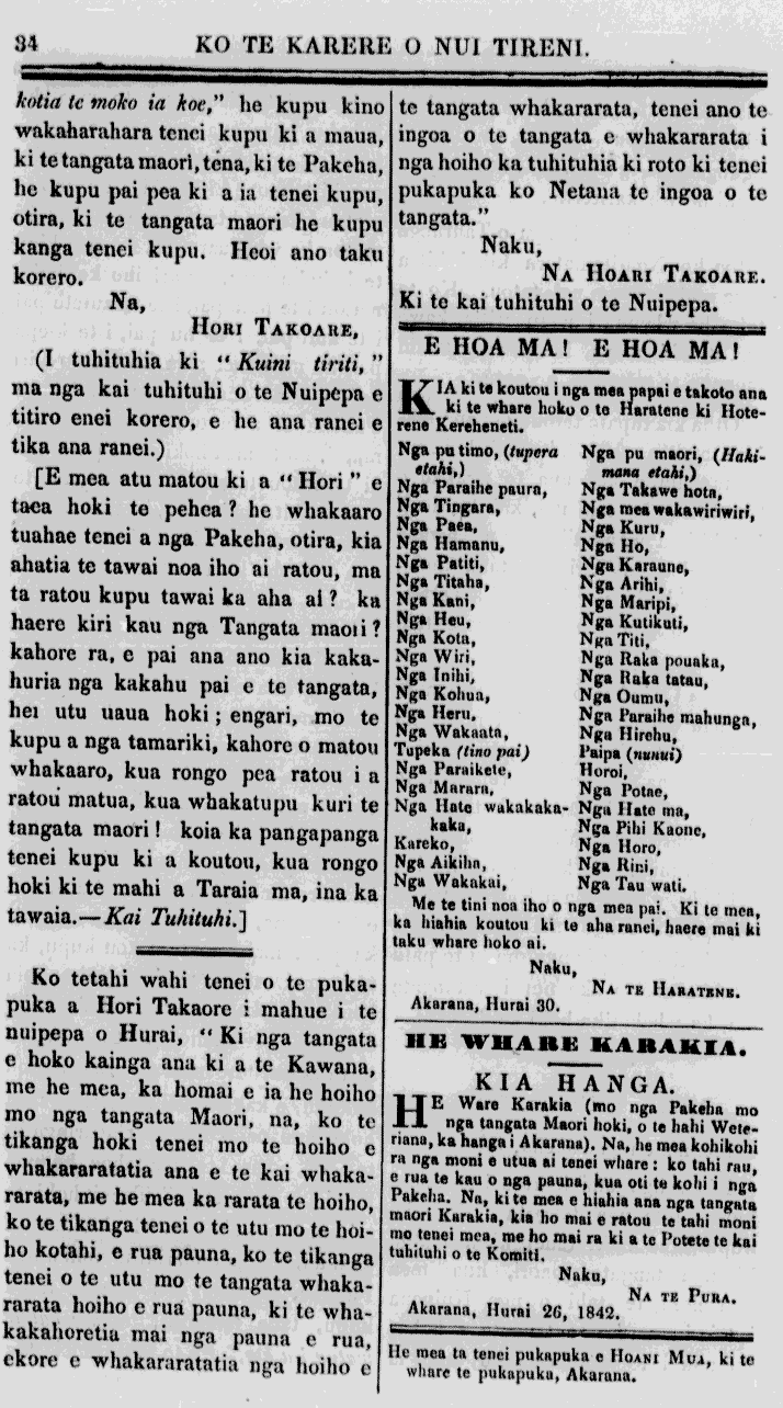 kotia te moko ia koe, he kupu kino wakaharahara tenei kupu ki a maua, ki te tangata maori, tena, ki te Pakeha, he kupu pai pea ki a ia tenei kupu, otira, ki te tangata maori he kupu kanga tenei kupu. Heoi ano taku korero. Na, Hori TAKOARE (I tuhituhia ki Kuini tiriti, ma nga kai tuhituhi o te Nuipepa e titiro enei korero, e he ana ranei e tika ana ranei.) E mea atu matou ki a Hori e taea hoki te pehea ? he whakaaro tuahae tenei a nga Pakeha, otira, kia ahatia te tawai noa iho ai ratou, ma ta ratou kupu tawai ka aha ai ka haere kiri kau nga Tangata maori kahore ra, e pai ana ano kia kakahuria nga kakahu pai e te tangata, hei utu uaua hoki engari, mo te kupu a nga tamariki, kahore o matou whakaaro, kua rongo pea ratou i a ratou matua, kua whakatupu kuri te tangata maori! koia ka pangapanga tenei kupu ki a koutou, kua rongo hoki ki te mahi a Taraia ma, ina ka tawaia. Kai Tuhituhi.] Ko tetahi wahi tenei o te pukapuka a Hori Takaore i mahue i te nuipepa o Hurai, Ki nga tangata e hoko kainga ana ki a te Kawana, me he mea, ka homai e ia he hoiho mo nga tangata Maori, na, ko te tikanga hoki tenei mo te hoiho e whakararatatia ana e te kai whakaako, me mea a rarata te hoiho, ko te tikanga tenei 0 te utu mo te hoiho kotahi, e rua pauna, ko te tikanga tenei 0 te utu mo te tangata wakararata hoiho e rua pauna, ki te whakakaheretia mad. nga pauna e rua, ekore e whakararatatia nga hoiho e te tangata whakararata tenei ano te. ingoa o te tangata e. whakararata, i nga hoiho ka tuhituhia ki roto ki tenei pukapuka ko Netana te ingoa o te tangata. Naku, NA HOARI TAKOARE. Ki te kai tuhituhi o te Nuipepa. E HOA MA! E HOA MA! KIA ki te koutou i nga me papai e takoto ana ki te whare hoko o te Haratene ki Hoterene Kereheneti. Nga pu timo,Nga pu maori, (tupera etahi,)(Hakimana etahi) Nga Paraihe paura, Nga Takawe hota, Nga TingaraNga mea wakawiriwiri Nga Paea,Nga Kuru, Nga Hamanu,Nga Ho, Nga Patiti,Nga Karaune, Nga Titaha,Nga Arihi, Nga Kani,Nga Maripi, Nga Heu,Nga Kutikuti, Nga Kota,Nga Titi, Nga Wiri,Nga Raka pouaka, Nga Inihi,Nga Raka tatau, Nga Kohua,Nga Oumu, Nga Heru,Nga Paraihe mahunga, Nga Wakaata,Nga Hirehu, Tupeka (tino pai)Paipa (nunui) Nga Paraikete,Horoi, Nga Marara,Nga Potae, Nga Hate Nga Hate ma, wakakakakaka Nga Pihi Kaone, Kareko,Nga Horo, Nga Aikiha,Nga Riri, Nga Wakakai, Nga Tau wati. Me te tini noa iho o nga mea pa . Ki te mea, ka hiahia koutou ki te aha ranei, haere mai ki taku whare hoko ai. Naku, NA TE HARATENE. Akarana, Hurai 30. HE WHARE KARAKIA KIA HANGA. HE Ware Karakia (mo nga Pakeha mo nga tangata Maori hoki, o te hahi Weteraina ka hanga i Akarana). Na, he mea kohikohi ra nga moni e utua ai tenei whare ko tahi rau, e rua te kau o nga pauna, kua oti te kohi i nga Pakeha na, ki te mea e hiahia ana nga tangata maori Karakia, kia ho mai e ratou te tahi moni mo tenei mea me ho mai ra ki a te Potete te kai tuhituhi o te komiti. Naku, NA TE PURA. Akarana, Hurai 26, 1 842. He mea ta tenei pukapuka e HOANI MUA, ki te whare te pukapuka, Akarana.