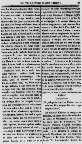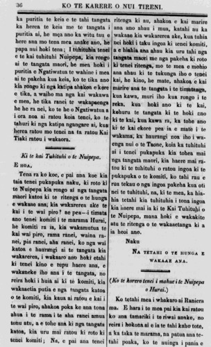 -ka puritia te keia e te tahi tangata ka herea te keia me te tangata i puritia ai, he mea ano ka witu tau e here ana mo tena mea anake ano le, -papa nui hoki tena.;. I. tuhituhia te nei e te kai tuhituhi Nuipepa, i kia rongo ai te, tangata maori, he mea hoki i puritia e Ngatiwatua te wahine i mea ai te pakeha kua keia, ko te tika ano kia rongo ki nga katipa ahakoa el kore e tika, a waiho ma nga kai wakawa mea, he tika ranei te -wakapaenga he he ra nei, ko te he o Ngatiwatua a i ora noa ai ratou koia tenei, ko te tahuri ki nga katipa ngangare ai, kua -.herea. ratou mo tenei na ta ratou. KaiTiaki ratou i, wakaora,., 'Ki te kai- Tuhituhi o Nuipepa. E HOA Una 'ra ko koe;, e pai ana koe kia taia tenei pukapuka! naku, ki roto' ki kia rongo ai fan 'ta te Nuipepanga, tangata maori katoa ki te ritenga 61 te' hunga e wakaae ana-*,, kia wakarerea ika te -kai i te *ai' piro ae'. pea, i timata ano tenei* komiti i te marama'; Hurai, he komiti ra'-, ia, kia wakamutua te* -kai wai piro, rima ranei waina ranei a nei, pia ranei ahi- ranei ko nga wai katoa e haurangi ai te, tangata kia 91 wakarerea i wakaaro ano hoki etahi ki tenei kino e tupu haere- Ana, e wakaneke iho ana i- te tangata no reira hoki i huia ai ki te komiti, -kia wakaaetia putia e nga tangata katoa o te komiti, kia kaua ai ratou e kai i te -wai piro, ahakoa poka ke ana tona ahua i te rarna i te aha ranei amua tonu atu, a -e tohe ana -ki nga tangata -a katoa kiia 'uru 'mai- ratou ki roto ki tenei komiti, Na, e pai Ana tenei ritenga ki au, ahakoa e kai marire ana ano ahau i mua, katahi au ka wakaae kia wakarerea ake, kua tuhia nei hoki -i taku ingoa ki tenei-komiti, a e hiahia ana ahau kia uru tahi i nga ti maori me e nga pakeha i roto ki "te' nei ritenga 'mo te mea e mohio ana ahau ki te tukunga iho o 1 kai, he kino, he mate, ahakoa e kai marire.* ana te:. tangata i, te timatanga. kua kawa, muri iho kua rongo i te reka kua hoki 'ano ki te kai, kohuru te tangata ki te hoki ano ki te kai, kua kawa ra, ka tohe ano ki te. kai ekore pea ia e mate i te ka haurangi noa- iho i wa enga a nui o' te Taone, koia ka tuhituhi ai. i tenei' pukapuka kia: tohea, -mai nga tangata maori, kia haere tou ki te tuhituhi o -ratou ingoa ki te pukapuka o te komiti, ko tahi rau e tua tekau o nga ingoa- pakeha kua- oti nei te tuhituhi na, ki te mea ka hiahia tetahi kia tuhituhia i tona ingoa kia haere mai ia ki te Kai Tuhituhi o .te Nuipepa, mana hoki e wakakite ,atu. te ritenga o te wakaaetanga ki a ia heoi ano. Naku NA TETAHI 0 TE HUNGA E WAKAAE ANA. (Ko o te korero, tenei i mahue i te Nuipepa 0 Hurai.) Ko tetahi mea i whakaro ai Raniera. ma.- E hara i te mea pai kia kai ratou ka ana tamariki -i to riwai anake no reira i hokona ai e ia te tahi kaha tote, a ka taka te marama na patua Ana tetehi poaka ko te nuinga i pania e