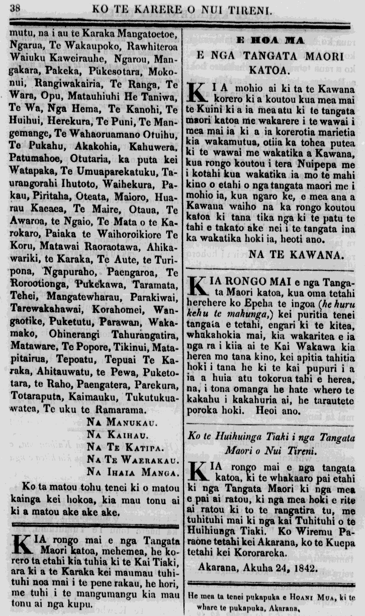 mutu, na i au te Karaka Mangatoetoe, Ngarua, Te Wakaupoko, Rawhiteroa Waiuku Kaweirauhe, Ngarou, Mangakara, Pakeka, Pukesotara, Mokonui, Rangiwakairia, Te Ranga, Te Wara, Opu, Matauhiuhi He Taniwa, Te Wa, Nga Hema, Te Kanohi, Te Huihui, Herekura, Te Puni, Te Mangemange, Te Wahaoruamano Otuihu, Te Pakahu, Akakohia, Kahuwera, Patumahoe, Otutaria, ka puta kei Watapaka Te Umuaparekatuku, Taurangorahi Ihutoto, Waihekura, Pakau, Piritaha, Oteata, Maioro, Huarau Kaeaea, Te Maire, Otaua, Te Awaroa, te Ngaio, Te Mata o te Karokaro, Paiaka te Waihoroikiore Te Koru, Matawai Raoraotanga, Ahikawariki, te Karaka, Te Aute, te Turipona, Ngapuraho, Paengaroa, Te Rorootionga, Pukekawa, Taramata, Tehei, Mangatewharau, Parakiwai, Tarewakahawai, Korahomei, Wangaotike, Puketutu, Parawan, Wakamako, Ohinerangi Tahurangatira, Mataware, Te Popore, Tikinui, Matapitairua, Tepoatu, Tepuai, Te Karaka, Ahitauwatu, te Pewa, Puketotara, te Raho, Paengatera, Parekura, Totaraputa, Kaimauku, Tukutukuawatea, Te uku te Ramarama. NA MANUKAU. NA KAIHAU. NA TE KATIPA. NA TE WAERAKAU. NA IHAIA MANGA. Ko ta matou tohu tenei ki o matou kainga kei hokoa, kia mau tonu ai ki a matou ake ake ake. Kia rongo mai e nga Tangata Maori katoa, Mehemea, he korero ta etahi kia tuhia ki te Kai Tiaki, ara ki a te Karaka kei maumau, tuhituhi noa mai i te pene rakau, he hori, me tuhi i te mangumangu kia mau tonu ai nga kupu. E HOA MA E NGA TANGATA MAORI KATOA Kia mohio ai ki ta te Kawana korero ki a koutou kua mea mai te Kuini ki a ia mea atu ki te tangata maori katoa me wakarere i te wawai i mea mai ia ki a ia korerotia marietia kia wakamutua, otiia ka tohea puta ki te wawai me wakatika a Kawana, kua rongo koutou i tera, Nuipepa me i kotahi kua wakatika ia mo te mahi kino o etahi o nga tangata maori me i mohio ia, kua ngaro ke, e mea ana a Kawana, waiho na ka rongo koutou katoa ki tana tika nga ki te patu te tahi e takato ake nei i te tangata ina ka wakatika hoki ia, heoti ano. NA TE KAWANA. KIA RONGA MAI e nga Tangata Maori katoa kua oma tetahi herehere ke Epeha te ingoa (he huru kehu te mahunga,) kei puritia tenei tangata e tetahi, engari ki te kitea whakahokia mai, kia wakaritea e ia nga ra kiia ai te Kai Wakawa kia herea mo tana kino, kei apitia tahitia hoki i tana te ki te kai pupuri i a ia a huia atu tokorua tahi herea, na, i tona omanga he hate whero te kakahu kakahuria ai, he tarautete poroka hoki. Heoi ano. Ko te Huihuinga tiaki i nga Tangata Maori o Nui Tireni. KIA rongo mai e nga tangata katoa ki te whakaaro pai etahi ki nga Tangata Maori ki nga mea e pai ai ratou, ki nga mea hoki e rite ai ratou ki to te rangatira tu, me tuhituhi mai ki nga kai Tuhituhi o te Huihiunga Tiaki, Ko Wiremu Paraone tetahi kei Akarana, ko te Kuepa tetahi kei Kororareka. Akarana, Akuha 24, 1842.. He mea ta tenei pukapuka e Hoatua MUA, ki te whare te pukapuka, Akarana.