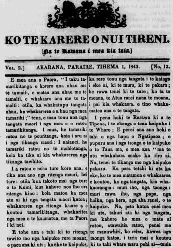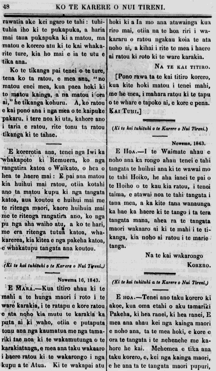 rawatia ake kei ngaro te tahi tuhituhia iho ki te pukapuka, e haria mai taua pukapuka kia matou ma matou ekorero atu ki te kai whakarite ture, kia ho mai e ia te utu e tika ana. Ko te tikanga pai tenei o te ture tena ko ta ratou e mea ana no matou enei mea kua paea hoki ki to matou kainga a na matou i ora ai he tikanga kohuru. A, ko ratou e kai pono ana i nga mea o te kaipuke pakaru i tere noa ki uta, kahore ano i taria e ratou rite tonu ta ratou tikanga ki te tahae. E korerotia ana, tenei nga iwi ka whakapoto ki Remuera ko nga rangatira katoa o Waikato, o hea o hea te haere mai, E pai ana matou kia huihui mai ratou otiia kotahi ano ta matou kupu, ki nga tangata katoa, aua koutou huihui mai me te ritenga maori kahore huihuia mai mea te ritenga rangatira ano, ko nga pu nga aha waiho atu a ko te hari, me era ritenga tutu, katoa, whakarerea, kia kitea e nga pakeha katoa, e whakatupu tangata ana koutou. (Ki te kai tuhituhi o te Karere o Nui Tireni) Nowema 16, 1843. E MARA-Kua titiro ahau ki te mahi a te hunga maori i roto i te ware karakia, i te ratapu e kore ratou e ata noho kia mutu te karakia ka puta ai ki waho otiia e putaputa tonu ana nga kaumatua me nga tamariki tae noa ki te wakamutunga o te karakiatanga, e mea ana taku wakaaro i haere ratou ki te wakarongo i nga kupu a te Atua. Ki te wakapai atu hoki ki a ia mana atawainga, kua riro mae, otiia na te hoa riri i wakararu o ratou ngakau koia te ata noho ai, a kihai i rite te mea i haere ai ratou ki roto ki te ware karakia. NA TE KAI TITIRO. Pono rawa ta te kai titiro korero, kua kite hoki matou tenei mahi, he ,mea i mahara ratou ki te tapa o te whare e tapoko ai e kore e pena. (Ki te kai tuhituhi o te Karere o Nui Tireni.) Nowema, 1843. E HOA. he Waimate ahau e noho ana ka rongo i ahau tenei tahi tangata te huihui ana ki te wawai mo te tahi Hoiko he aha ianei te pai o te Hoiho o te kau kia ratou tenei taima, e atawai noa te tahi tangata i tana mea, a ka kite tana wanaunga ka hae ka haere ki te tango i ta tera tangata mana ahea ra te tangata maori wakaaro ai ki te mahi i tikanga, kia noho ai ratou i te marietanga. Na te kai wakarongo KORERO. (Ki te kai tuhituhi e te Karere o Nui Tireni E HOA. Tenei ano taku korero ki a koe, kua oma etahi aku tamariki Pakeha ki hea ranei ki hea ranei. E mea ana ahau kei nga kainga maori e noho ana ta te mea hoki, e kore e ora te tangata i te nehenete me kahore he kai. Mehemea e tika ana taku korero, e, kei nga kainga maori, he ana ta te tangata maori pupuri