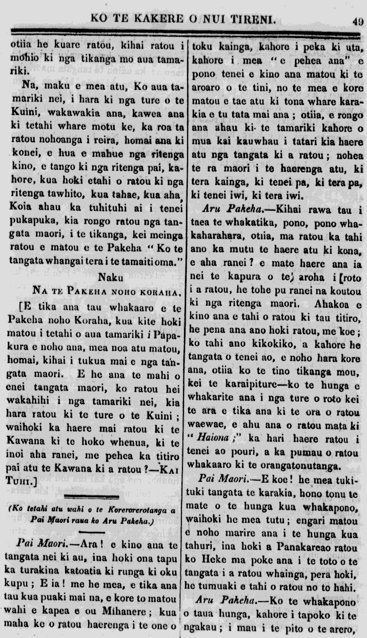 otiia he kuare ratou i mohio ki nga tangata mo aua tamariki. Na maku e mea atu, ko aua tamariki i hara ki nga ture o te Kuini, wakawakia ana, kawea ana ki tetahi whare motu ke ka roa, ta ratou nohoanga i reira, homai ana ki konei, e hua e mahue nga ritenga kino, e tango ki a ka ritenga pai, kahore, kua hoki etahi e ratou, ki nga ritenga tawhito, kua tahae kua aha. Koia ahau ka tuhituhi ai tenei pukapuka kia rongo ratou nga tangata maori, i te tikanga, kei meinga ratou e matou e te Pakeha Ko te tangata whangai tera te tamaiti oma. Naku NA TE PAKEHA NOHO KORAHA. E tika ana tau whakaaro e te Pakeha noho Koraha, kua kite hoki matou i tetahi a tamariki i Papakura e noho ana mea noa atu matou, homai kihai tukua mai e nga tangata maori E ke ana te mahi o enei tangata maori, ko ratou hei wakahihi i nga tamariki nei kia hara ratou ki te ture o te Kuini waihoki ka haere mai ratou ki te Kawana ki te hoko whenua ki te moi aha ranei, me pehea ka titiro pai atu te Kawana ki a ratou ?KAI TUHI (Ko tetahi atu Wai o te Korerorerotanga a Pai Maori raua ko Aru Pakeha.) Pai Maori Ara! e tino ana te tangata nei ki au ma hoki ona tapu ka turakina katoatia ki runga ki oku kupu E ia! me te mea e tika ana tau kua puaki mai na, e kore te matou wahi e kapea e ou Mihanere, kua maha ke o ratou haerenga i te one o toku kainga, kahore i peka ki uta kahore i mea e pehea ana e pono. tenei e kino ana matou ki te aroaro o te tini, no te mea e kore matou e tae atu ki tona whare karakia e tu tata mai ana, otiia e rongo ana ahau ki te tamariki kahore o mua kai kau whau tatari kia haere atu nga tangata ki a ratou nohea te ra te haerenga atu, ki tera kainga ki tenei pa, ki tera pai ki tenei iwi ki tera iwi. Ara Pakeha Kihai rawa au i taea te whakatika, pono, pono whakaharahara, otiiama ratou ka tahi ano ka mutu te haere atu ki kona e aha ? e mate haere ana ia nei te kapura o te aroha i karoto i a ratou, he tohe pu ranei na koutou ki nga ritenga maori. Ahakoa e kino ana e tahi e rat, ou ki tau titiro, he pena ana ano hoki ratou, me koe ke tahi ano kikokiko, a kahore he tangata o tenei ao, e noho hara kore. ana, otiia ko te tino tikanga mou kei te karaipiture ko te hunga e whakarite ana i nga ture e roto kei te ara e tika ana ki te ora e ratou waewae, e k ahu ana e ratou mate ki te Haiona, ka huri haere ratou i tenei ao pouri a ka pumau e ratou whakaaro ki te orangatonutanga. Pa Maori. E koea he mea tukauki tangata te karakia hone tonu te mate o te hunga kua whakapono, waihoki te mea tutu, engari matou. e noho marire ana te hunga kua tahuri ana hoki a Panakareao ratou ko Heke ma poke ana i te toto o te tangata i a ratou whainga pera hoki, te tumuaki e ta hi o ratou no te hahi. Aru Pakeha. Ko te whakapono o taua hunga kahore tapoko ki te ngakau i mau te pito o te arero