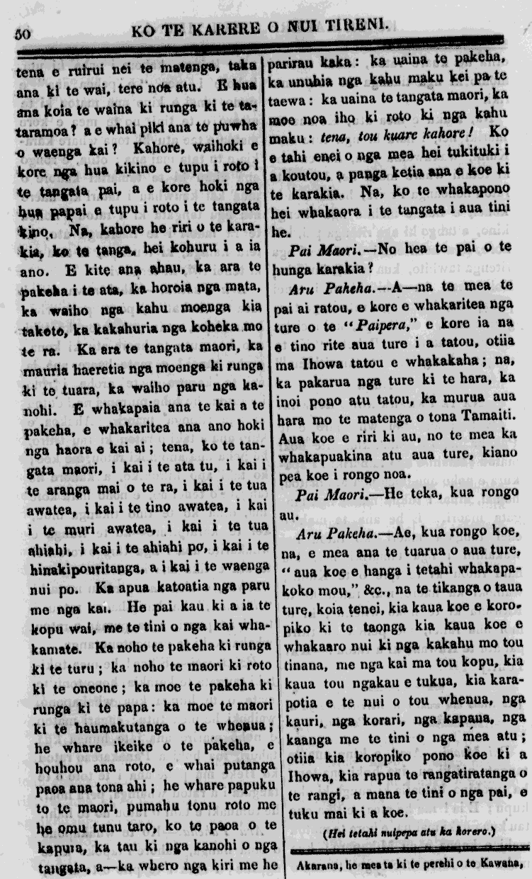 tena e ruirui nei te matenga taka ana ki te wai tere noa atu. E hua ana koia te waina ki runga ki te tataramoa. a e whai piki ana te puwha o waenga kai. Kahore waihoki e kore nga jua kikino e tupu i roto i te tangata pai a e kore hoki nga hua papai e tupu i roto i te tangata kino na kahore he riri o te karakia ko te tanga hei kohuru ia ia ano. E kite ana ahau ka ara te pakeha i te ata ka horoia nga mata ka waiho nga ,kahu moenga kia takoto, ka kakahuriau i koheka mo te ra. Ka ara te tangata maori, ka mauria haeretia nga moenga ki runga ki te tuara, ka waiho paru nga kanohi. E whakapaia ana te kai e te pakeha e whakaritea ana ano hoki nga haora e kai ai tena ko te tangata maori kai i te ata tu, kai i te aranga mai o te ra, kai a te tua awatea kai i te tino awatea, kai ta, muriawatea kai i te tua ai te kai, te., ahiahi pa, kai i te hinaki pouritanga, a kai i te waenga nui po Ka apua katoatia nga paru me nga kai Hei pai kau ki a ia te ko pu wai, me te tini o nga kai whakamate. Kua noho te pakeha ki runga ki te turu ka noho te maori ki roto ki te oneone, ka moe te pakeha ki tau e papa ka moa te maori ki te haummakutanga o te whenua, te whare ikeike e te Pakeha e houhou ana ratou e whai putanga paea ana tona ahi he whare papuku o te maori pumahu tonu roto me he omu tunu taro ko te paoa o te kapura ka tau ki nga kanohi o nga tangata a ka whero nga kiri me he parirau kaka ka uaina te pakeha ka unuhia nga kahu maku kei pa te taewa ka uaina te tangata maori ka moe noa iho ki roto ki nga kahu maku tena tou kuare kahore. Ko e tahi etahi o nga pa i hei tukituki i a koutou a panga ketia ana e koe ki te karakia. na ko te whakapono hei whakaora i te tangata i aua tini he. Pai Maori. No hea te pai o te hunga karakia? Aru Pakeha. a na te mea te pai ai ratou e kore e whakaritea nga ture o te Paipera, e kore ia na e tino rite aua ture i a tatou, otiia ma Ihowa tatou e whakakaha na, ka pakarua nga ture a te hara ka inoi Pono atu tatou, ka murua aua hara mo te matenga o tona tamaiti. Aua koe e riri ki au no te mea ka whakapuakina i atu aua ture kiano pea koe rongo noa Pai Maori. He teka kua rongo au. Ara Pakeha e kua rongo koe, na e mea ana te tuarua o aua ture, aua koe e hanga i tetahi whakapoko mou na te tikanga o taua ture koia tenei, kia ka koa e kore pako ki te taonga kia kaua koe e whakaaro nui ki nga kakahu mo tou tinana me nga kai matou kopu, kia kaua tou ngakau e tukua kia karapotia e te nui o tou whenua nga kauri nga korari nga kapana nga kaanga me te tini o nga mea atu otiia kia koropiko pono koe ki a Ihowa, kia rapua te rangatiratanga o te rangi a mana te tini o nga pai, e tuku mai kia koe. Hei tetahi nuipepa atu ka korero. Akarana he mea ta ki te perehi o te Kawana.
