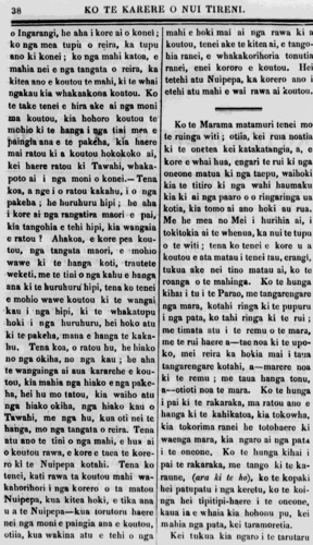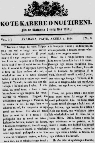 KO TE KARERE 0 NUI TIRENI Na te Kanawa i mea kia taia] Vol 3] AKARANA TAITE AKUHA 1, 1844 [No 8 Ko wai rongo ki taua Nuipepa ina wai e tanga korero horihori kino noa iho ? E penei ana te ki a nga tangata maori, otiia, kua kitea nei he pono te Me Nuipepa, titiro hoki ki te ai wahi korero kia taia ki roto ki te Nuipepa o Aperira, o tera tau kia mame ake nei e whakakino ana i te tatou i kanga hoko, he atu ana e tatou nga moni katoa ki Tawahi hei utu mo nga tini taonga e He ri ki au i reira kua hoki, kia penei tonu, e kore e taro, ka mmioretia nga tangata ka rawakoretia te whenua. Engari kia whakaatua nga taonga Tawahi ki te muka ra nei ki nga hua o to whenua ra nei ka rongoatia ai nga moni ma tatou. He aha oti tenei kua pa mai nei ki a tatou E tie pukapuka kau te moni ma tatou, kahore Ahiriwa, kahore he koura. I te matou rongonga ai, tetehi rangi, ki etahi tangata maori, e whakahe ana i nga moni pukapuka e te Kawana, ka whakaaro matou, ae koia ; koia ano ko te whakaritenga tenei o a Niupepa en na ka tahi pea ka whakaponohia e matou korero whakaaea e te tangata maori. Here ! me i rongo koutou i mua, ki te matou kuia kia haro te muka, thaunga tinga mua parakoku kau, otiia ko nga muku hanihani, kua oti nei te komuru te patupatu ki te wani kia mahi ranei i te wai ia penei, kua utua nga taonga Tangata ki te ua o te tangata, a ko nga moni na hiriwa, me nga koura kua rongoatia ma tatou. Tena, me pehea tatou, me noho tonu ranei tatou ki runga ki nga moni pukapuka kau me kimi ranei e tatou tetehi tikanga e hoki mai ai nga hiriwa nga koura ki a tatou ? Koia ano tenei, me whakaaro tatou kia whakahokia mate rawa ki to tatou Motu Otiia kaua e motu ke nga whakaaro o te pakeha o to maori huatume huihui kia kotahi tonu te ngakau, ahakoa motu ke ana e mahi e tetehi a tetehi ko nga wakaaro kia kotahi. He aha tini ai nga hanga o Tawahi