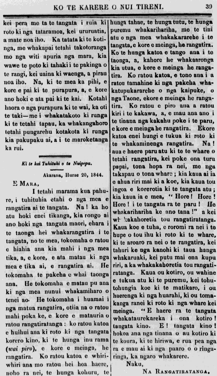 kei pera me ta te tangata rua, ki roto ki nga tataramoa, kei ururuatia, a mate noa iho Ka tatata ki te kotinga, me whakapai tetahi takotoranga me nga wai apuria nga mara, kia wawe te poto ki tahaki i te pakanga o te rangi, kei uaina ki waenga a pirau noa iho Na, ki te mea ka pihi, e kore e pai ki te purapum, a, e kore ano hoki e ata pai ki te kai, Kotahi haora o nga purapua ki te wai, ka oti te taki me i whakatakoto ki runga ki te tetahi tapau ka whakanga horo tetahi pungarehu katakoto ki runga kia pakupaku ai a te maroketanga ka riri. Ki te kai tuhituhi e to Nuipepa Akarana, Hurae 20, 1844 E MARAR i tetahi marama kua pahure, tuhituhia etahi o nga mea e rangatia ai te tangata. Na ka ho atu hoki enei tikanga, kia rongo ai ano hoki nga tangata maori, ehara I te taonga hei whakarangatia te tangata no te mea tokomaha o ratou e hiahia ana kia mahi i nga mea ma a e kore e ata matau ki nga mea e tika ai e rangatira ai He tokomaha te pakeha e whai taonga ana. He tokomaha e matau pu ana ki nga mea nunui whakammaro o tenei ao. He tokomaha i hua mai i nga matua rangatira, otiiana e ratou mahi poka ka, e kore e matauria o ratou rangatiratanga ko ratou katoa e huihui ana ki roto ki nga tangata korero kino, ki te hunga inu rama owai pire, e kore e hein a, he rangatira Ko ratou katoa e whiriwhiri ana mo ratou hei hoa haere, noho ra nei te hunga kohuru, te hunga tahaethunga tutu te hunga puremu whakarihariha me te tini atu o nga mea whakakararehe i te tangata e kore e meinga te rangatira. Ko te hunga katoa e tanga a te taonga, a, kahore te whakaaronga kia utua e kore e meinga he rangatira Ko ratou katoa e tono ana i a ratou tamahine ki nga pakeha whakatupukararete o nga kaipuke o nga Taone, ekore e meinga he rangatira Ko ratou e piro ana e ratou kia te kakawa, a e mau ana ano i te tinana nga kakahu poke te para ekore e meinga te rangatira Ekore katoa enei kunge tukua ki roto ki te whakaminenga rangatira Na! a haere paru atu ki te te whare o tetahi rangatira, kei peke ana turu. papaitona hepa ra nei, me nga takapau o tona whare kia kaua ai ia e ahua riri mai ki a koe, kia kauatou ingoa e korerotia ki te tangata atu, kia kaua a, e mea Hore Hore ! Here a te tangata ra te paru I He whakarihariha ke ano tana I a kei w Ieakaneretia tou rangatiratanga. Ka koe e tuka, e reremi ra nei i te hupa o tou ihu ki roto ki te whare, ki te aroaro ra nei e te rangatira, kei tahuri ke nga kanohi ki taua hanga whakaruake, kei puta mai ona kupu riri a ka whakakahoretia tou rangata ratanga. Ka ou kotiro ou wahine e tukua atu ki te puremu, kei tohutohungia koe ki te mamaro, i ou haerenga ki nga huarahi ki ou kakanga ranei ki roto ki nga whare kei meinga 11 E haere ra te tangata whakataurekareka i ona kotiro tangata kino. E ! tangata kino hokoa ana nga tinana au kotiro ki te kotira, ki te hiriwa rua pea nga ra e mau hti ki nga paaro o o ringarina, ka ngaro whakarere. Naku, Na RANGATIRATANGA,