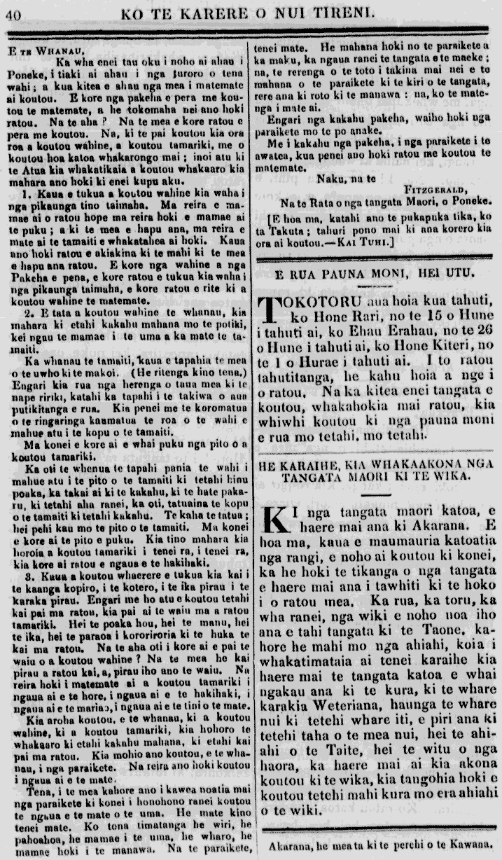 E Te WHANAU. Ka wha enei inu oku i noho ai ahau i Poneke, I tiaki ai ahau i nga turoro e tena wahia kua kitea e au a mea i matemate iti koutou. E kore nga e pera me koutou te matemata, a he te nei ano hoki ratou. Na te aha ? Na te mea e kore ratou e pera me koutou. No ki te pai koutou kia ora roa e koutou wahine, a koutou tamariki, me o koutou hoa katoa whakarongo mai,moi atu ki te Atua kia whakamana a koutou whakaaro kia mahara ano hoki ki enei kupu aku. i Kaua e tukua ta koutou wahine kia waha i nga pakanga tino taimaha. Ma reira e ma. moe ai o ratou hope ma reira hoki a mamae ai te puku a ki te mea a hopu ana ma reira e mate ai te tamaiti kia whakatakea ai hoki, Kaua rre hoki ratou ko okiakina ki te mahi ki te mea e hopu ana ratou Ekore nga wahine e ng ! Pakeha e pena, e kore ratou te tukua kia whiu i nga pikounga taimaha, e kore ratou e rite ki a koutou wahine te matemate. 2 tata a koutou wahine te whanau kia mahara ki etahi kakahu mahana mo te potiki, kei ngau te mamae i te uma ake mate te tamaiti. Ka whanou te tamaiti kaua e tapahia te taea o te uwhokite mokoi tHe ritenga kino tena ) Engari kia rua nga herenga o tutia mea ki te nape ririki, kotahi ka tapahi i te takiwa o oun pumitanga erua Kia penei me te koromatua o te ringaringa kaumatua te roa o te wahi e mahue atu te kupu o te tamaiti, kia konei e kore ai e whai puou nga pao o ta koutou tamariki. Ka oti te whenua te tapahi,mana, te wahi i mahue mo te pito e ai e ia tu ki tetahi hinu poaka, ka takui ai ki te kakahu, ki te hate paka ia ki tetahi aha ranei, ka oti tatuaina te kopu o te tamaiti ki te ata kakahu Te kaha te tatua, hei pehi kau mo te pito o te tamaiti Ma konei e kore ai te pito e puku. Kia tino mahara kia horoia a koutou tamariki i tenei ra teitei ra, kia kore ai ratou e ngaua ko te hakitaki S. Ka a koutou whaerere a tukua kia kai i te kaanga kopiro i te korero, te ika pirau te karaka pirau. Engari me ho atu e koutou tetahi kai pai mo ratou kia pai ai te waiu run a ratou tamariki. Hei te poaka hou hei te manu hei te ika, hei te paremo kororareria ki te huka te kai ma ratou. Na te aha oti i kore ai e pai te waiu a koutou wahine E Na te mea he kai parau a ratou kei a pirau iho ano te waiu. Na reira hoki matemate i, a koutou taman i i nga ai e te kore i nga ui e te hakitiaki i ngatia ai e te mariea, i nga ai e te tini o te mate. Kia aroha koutou e te whanau ki a koutou wahine ki a koutou tamariki, kia hohoro te whakaaro ki etahi kakahu mahana kie the kai pai mo ratou. Kia mohio ano koutou e te whanau i nga paraikete. Na teira ano nuki koutou rgaia ai e te mate. Tena i te mea kahore ane kawea noatia mai nga paraikete ki konei i honohono ranei koutou te nghua e te mate o te uma te mate kino tenei mate. Ko tona timatanga he wiri pahoahoa, he mamae i te una he wharo he mamae hoki te manawa. Na te paraikete, tenei mate te mahana hoki no te paraikete a ka maku, ka nga ranei te tangata e te maeke, na te rerenga o te toto tukino mai nei e to mahana e te paraikete ki te kiri o te tangata, rere ki roto ki te manawa, ita ko te matenga i mikai ai. Engari nga kakahu pakeha, waiho huki nga paraikete mo te po tmake. Me kakahu nga pakeha, i nga paraikete te awatea kua penei ano hoki ratou me koutou te matemate. Naku, ma te FITZGERALD Na te Rata o nga tangata Maori o Poneke. te hoa ma katahi ano te pukapuka mau ko te rakuta tahuri pono miki ki ana korero kia. ora ai koutou. KAI TUHI ] E RUA PAUNA MONI HEI UTU. TOKOTORU aua hoia kua tahuti ko Hone kuri, no te 15 o Hune tahuti ai, ko Ehau Erahau no te 26 o Hune tahuti ai, ko Hone Kaeri no te o Hurae i tuatahi ai. I to tatou tahutitanga he kaha hoia a nge i o ratou, Na ka kitea enei tangata e koutou whakahokia mai ratou kia whiwhi koutou ki nga pauna moni rua mo tetahi mo tetahi. HE KARAIIHE, KIA WHAKAAKONA NGA TANGATA MAORI KI TE WIKA. KI nga tangata maori katoa, e haere mai ana ki Akarana. E hoa ma kaua e maumauria katoatia nga rangi te noho ai koutou ki konei, ka he hoki te tikanga e utua tangata e haere mai ana tawhiti ki te hoko i o ratou mea, Ka rua, ka toru, ka wha ranei, nga wiki e noho noa iho ana e tahi tangata ki te Taone, kahore he mahi mo nga ahiahi, koia i whakatimataia ai teitei karaihe kia haere mai te tangata katoa e whai ngakau ana ki te kura, ki te whare karakia Weteriana, haunga te whare nui ki tetehi whare m e piri ana ki tetahi taha o te mea nui hei to ahiahi te Taua, hei te wau e nga haora ka haere mai ai kia akona koutou ki te wika, kia tangohia hoki e koutou tetehi mahi kura me oa ahiahi o te wiki. Akarana, he mea tu ki te herehi o te Kawana