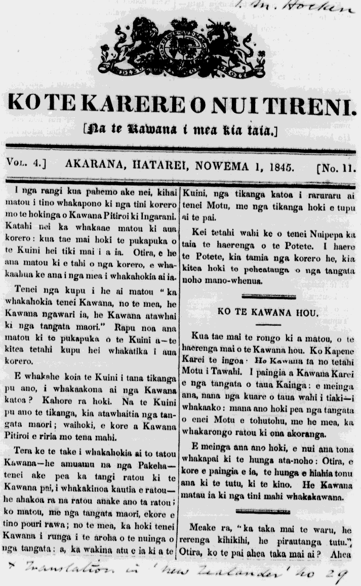 KO TE KARERE 0 NUI TIRENI, [Na te Kawana i mea kia taia] Vol 4] AKARANA, HATAREI NOWEMA 1, 1845. No 11 I nga rangi kua pahemo ake nei, kihai otatou tino whakapono ki nga tini korero mo te hokinga o Kawana Pitiroi Ingarani. Katahi iwi ka whakitaki matou ki aua korero kua tae mai hoki te pukapuka o te Kuini hei tiki mai i a ia. Otira, he aha matou ki te tahi o nga korero, e whakaahua ke ana i nga mea i whakahokia ai ia. Tenei nga kupu i ke ai matou ka whakahokia tenei Kawana, no te mea he Kawana ngawari ia te Kawana atawhai ki nga tangata maori. Rapu noa ana matou ki te pukapuka o te Kuini uto kitea tetahi kupu hei whakatika i aua korero. E whakahe koia te Kuini taua tikanga pu ano i whakaakona ai nga Kawana kawa ? Kahore ra hoki. Na te Kuini hu ano te tikanga, kia atawhaitia nga tan trata maori waihoki, e kore e Kawana Pitiroi rira, mo tena mahi. Tera ko te take i whakahokia ai to tatou Kawana te amuamu na nga pakeha tenei ake pea ka tangi ratou ki te Kawana pai, i whakakinoa kautia e ratou he ahakoa ra na ratou anake ano ta ratou, ko matou me nga tangata maori, ekore e tino pouri rawa no te mea ka hoki tenei Kawana i runga i te aroha o te nuinga o nga tangata a ka wakina atu e ia ki a te Kuini nga tikanga katoa i raruraru ai tena motu, me nga tikanga hoki e tupu iti te pai. Kei tetahi wahi ke o tenei Nuipepa ka tana te haerenga o te Potete. I haere te Potete, kia tanua nga korero he kia kitea hoki te peheatanga o nga tangaa noho mano whenua. KO TE KAWANA HOU. Kua tae mai te rongo ki a matou o to haerenga mai o te Kawana hou. Ko Kapene karei te ingoa. he Kawana ra no tetahi Motu i Tawahi i paingia a Kawana Karei e nga tangata o taua Kainga e meinga ana, nana nga kuare e taua wahi tiaki i whakaako mana ano hoki pea nga tangata o enei motu e tohutohu mo te mea ka whakarongo ratou ki otia akoranga. E meinga ana ano hoki, e nui ana tona whakapai ki te hunga ata noho Otira e kore e paingia e ia te hunga e hiahia tonu ana ki te tutu, ki te kino. He Kawana matau ia ki nga tini mahi whakakawana. Meake ra ka taku mai te waru, ate rerenga kihikihi he pirautanga tutu." Otira, ko te pai ahea taka mai ai? Ahea