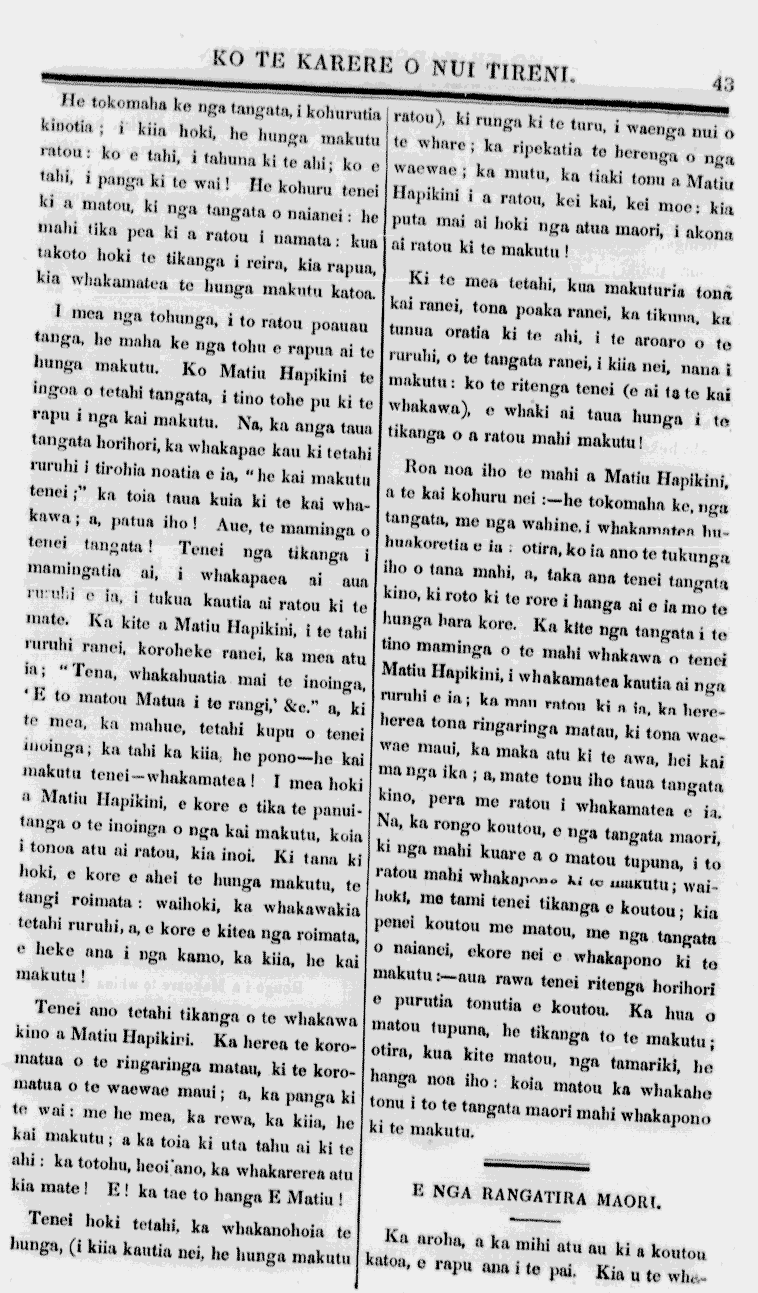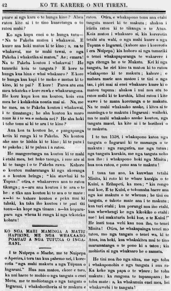 puare ai nga karu o te kainga kino. Ahea ratou kite ai te tino kuaretanga o to ratou mahi? Ko nga kupu enei o te hunga tutu Na te Pakeha matou i whakawai. E kuare ana hoki matou ki te kino i te whakawa me te mahi tawai o nga Pakeha i whakatika ai matou. Ae emara Na te Pakeha koutou I whakawai i Te tamariki koia te tangata. E kore te hanga kua hua i ui kai whakaaro. E kore te hunga ana kapi i it moko e matau ki te kino ki te pai ? E kore Parea atu ena mea tekateka e kore rawa e whakarangona. He kore kupu koa ma koutou koia eha mea he kohikohia noatia mai ai. Na me he mea na te Pakeha koutou i whakawai te timatanga te aha koutou ka maro tonu ta i a wa nohoia hei He aha hoki i te ae tonu ai ki te ara i te kino? Aua koa ta koutou he, e pangapanga ketia ki runga ki te Pakeha. na koutou ake ano te hiahia ki te kino, ki te patu i te pakeha ki te pahua i a ratou. He mangeretanga na koutou ki te mahi i etahi mea, hei hoko taonga i rere atu ai ki te tango i o te pakeha rawa. Kahore o koutou maharatanga ki nga akoranga a o koutou heinga, kia atawhai ki to Tupua, otira e whakarerea ana to ratou tikanga a aru ana koutou i te ara o te he, e tika ana koutou ki te ara o te mate a ki te kahore koutou e peka mai ki tahaki ka taka iho koutou i te pari titi tonu ka kope nga tinana a ka koparuparu nga whenua ki runga ki nga tekoteko kohatu. KO NGA MAHI MAMINGA A MATIU HAPIKINI ME NGA WHAKAARO POAUAU A NGA TUPUNA O INGARANI. I te Nuipepa e Maehe, me te Nuipepa o Aperiha, tera tau kua pahemo nei i korerotia nga mahi makutu a nga Tupuna o Ingarani Hua noa matou ekore e taro ka nui haere te mohio o nga tangata o enei Motu me te mohiotanga o nga tangata o Ingarani i whakahorihoria ai te makutu e ratou.Otira, e whakapono te mana etahi maori ki te makutu ahakoa i iririia tatou ki te tikanga o te Atua. Koia matou i whakaaro ai, kia korerotia tetahi atu mahi o nga mahi kuare a nga tetahi o Ingarani, e kahore akao korerotia era Nuipepa kia horohoro ai nga tamariki o tenei whakapaparanga te wakarere i nga ra nga he o te Maketu. Kei ki nga tangata tae riri kino ta matou ki te ratou whakapono ki te makutu kahore e mahara marie tini noatia te tini o nga tata i piri mai ai enei whakaaro kuare ki ta mate k apiha ahakoa i nui noa atu to ratou mahi ki te karakia kihai ratou i ki te wawe i te mana koretanga o te makutu, Na te mahi whakaako anake, i kitea ai te maminga o te makutu i Ingarani waihoki, m ma te mahi whakaako anake koutou nga tangata maori, ka kite ai te horihori e makutu. I te tau 1558 i whakapono katoa nga tangata o Ingarani ki te mananga o te makutu nga rangatira me nga tutua nga tangata karakia, me nga tangata noho noa iho, i whakapono hoki nga Minitia nui noa ratou e hono ana te makutu ! I taua tini ano ka kauwhaa whani minita ki roto Ui te whare karakia o te Kuini a Erihapeti ka mea kia rongo mai koe te Kuini o tokomaha haere ana maki, nmatua o te whenua, He tini oti tangata e takoto mate aha makutu kua turi etahi kua porangi noa iho etahi kua whewhengi ke nga kikokiko o etahi tine i kei makuturia hoki koe, o te Kuini He inati tona wehi kau noa iho, to tenei Minita. otira, he whakapainga tenei mo tatou mo nga tangata o tenei wa ki te Atua, mta hoki kata whakakitea mai te tino maramatanga o te pono ki a tatou kia mohiotiatia nga whakaaro he o namata. He tini noa iho nga aitua me nga tohu i whakaponohia e ratou tangata i aua ra. Ka koke nga papa o te whare, tae tonu makutu ka rangona te tupanapana, he tohu mate , a, ka whakanuia enei mea hei whakawehi i te tangata.