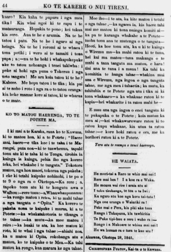 kaaro. Kia kaha te pupuru i nga mea tika. Kia whai ngoi ki te rapu i te matauranga. Hopukia, te pono, kei tukua kia rere. Aua te he e arumia. Na te he tatou i patu. Na te he i ngaro ai nga heinga. Na te ke roromi ai te whaea I tona potiki i werai te tamaiti tona papa na te he hoki i whakapukepuke aake te tatou nohoanga tenei takiwha i peke ai hoki nga puna Tokerau i nga tote tangata! Me ara koia tatou ki te he ? Kahore, Me hopu tatou i te tika kia pai ai te noho i roto i nga ra o to tatou oranga, kia heke mamae kore ai tatou ki te wharua o te mate. KO TO MATOU HAERENGA TO TE POTETE MA. I ki mai a te Karaka raua ko te Kawana, ka te matou hoa, ki a te Potete, Haere mi haere e tika koe i te taku te Ma rangai puta noa ki te tuawhenua tapahi tonu atu ki te taha ki te Tonga tirohia ia kainga ia kanga pehia iho nga korero toku hei whakahe i te tangata. Tokotoru ratou nga hoa maori tokorua nga pakeha, I eke ki tetahi kaipuke nohinohi i te po o te 9 o nga ra o Oketopa. Ka rere a, tapoko tonu atu ki te kongutu awa o Waihou, rere tona a Whauwhauponamu ma ka rongo matou reta e ia te mate tahae a nga tangata e tapita Ka korero te pakeha nona te kaipuke murua ki a te Potete, ka whakatakotoria te tikanga o te tahao, ka mutu ika moe matou i reira ka huaki te ata ka hoe matou ki roto ki te whai i nga tahae ahiahi noa, ka e matou ki Opita rokohanga atu e matou, ko te kaipuke o te Mea Ka tahi matou ka rongo kua marama ke nga tahae. Moe iho i te ata ka kite matou i tetahi o nga tak ae ka ngarea ia kia haere tahi mai me matou ki tona nuinga komiti ai ki pa te karanga whakahe a te Potete tuohu tonu ana te matenga o te tangata Heoti, ka hoe tonu atu ka u ki te kainga o Wiremu ma ka mahi ratou ki te kainga hei kai ma matou tima makanga o te Mahi e taua tangata ma matou, e hara i tini ana te tuna i a ma Ka tahi ka komaitia te hanga tahae whakina mai ana e Wiremu nga ingoa o nga tangata tahae me nga mea tahae tiaki me k a tuhituhia e te Potete nga uta i tika ai ki tona whakaaro a ka whakaae ratou i te kapia. He whakarite i te ratou mahi na he. E mau ana nga ingoa o enei tangata ki te pukapuka o te Potete, koia matou ki, mea ai kei whakawareware ratou ki he ratou kupu whakaae kia utua ta ratou tahara e kore hoki ratou e ona me ka horihori ratou ki a te Potete. Tera atu te roanga e tenei haerenga. HE WAIATA. He muritai, a Raro te whio mai nei! Rere mai hea ? I a koe ra e Waka. He moana marire i ara e atu ai I toku tirohonga, te tonu tewi. Ka ngaro ata koe nga kore tai tata Ngaoneuranga e Paiariki ra ! Peke mai e Pera, kia piki ake taua Runga i Takapuna, kia tawhiritia Te Puke tipi hau rere i waho ra Rongo i a Makoare te whiua mea nei He wa huaino ra e taea te kau atu ? Akarana, Oketopa 28, 1845 CHRISTOPHER FULTON, Kai ta o te Kawana