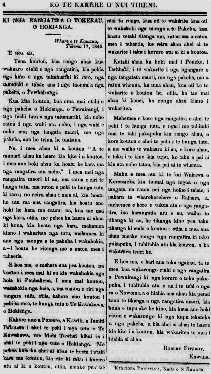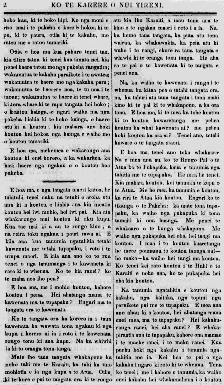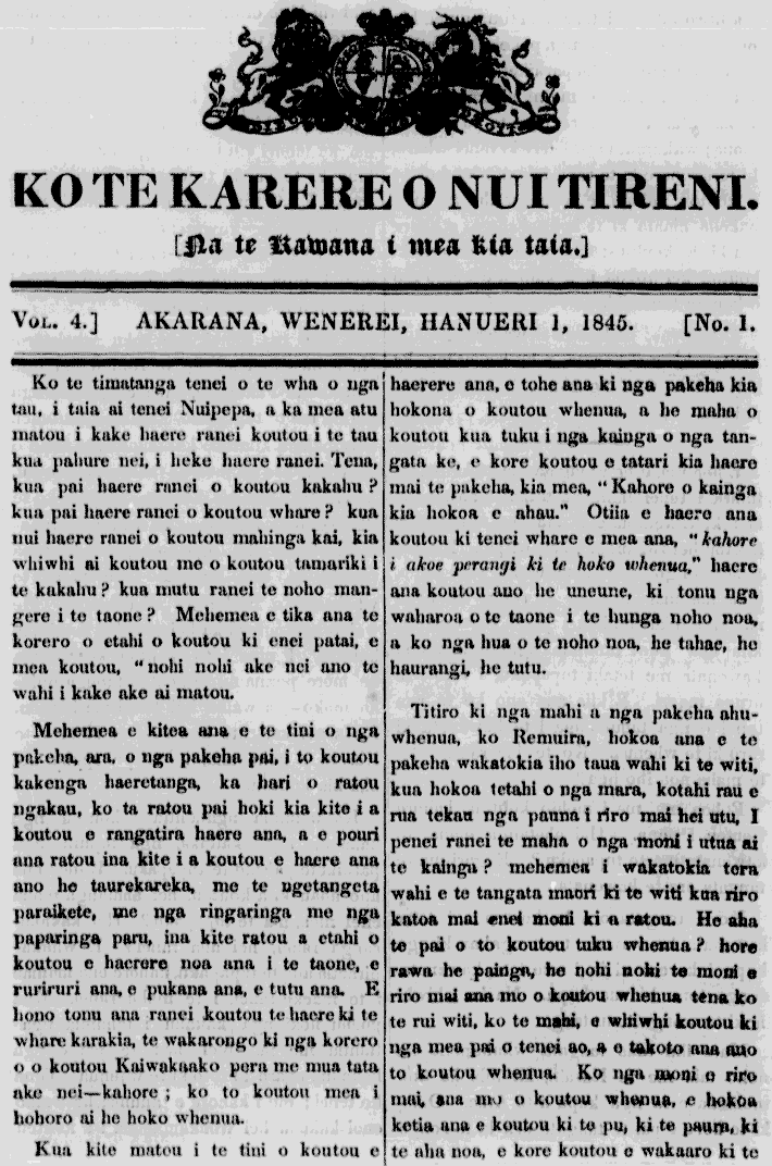 KO TE KARERE 0 NUI TIRENI. [Na te kawana i mea kia taia] Vol 4] ] AKARANA, WENEREI HANUERI 1, 1845. [No. 1. Ko te timatanga tenei e te wha o nga tau i taia ai teitei Nuipepa a ka mea atu matou kake haere ranei koutou i te tau kua pahure nei i heke haere ranei, Tena, kua pau haere ranei o koutou kakahu ? kua pai haere ranei o koutou whare ? kua nui haere ranei o koutou mahinga kai, kia whiwhi ai koutou tae o koutou tamariki i te kakahu ? kua mutu ranei te noho na gere i te taone ? Mehemea e tika ana te korero o etahi o koutou ki enei patai,e mea koutou, noku noku ake nei ano te wahi i kake ake ai matou. Mehemea e kitea ana e te tini o nga pikiia, ara, e nga pakeha pai, i to koutou kakanga haeretanga, ka hari o ratou ngakau, ko ta ratou pai hoki kia kite i a koutou rangatira haere ana, ae pouri ana ratou ina kite i a koutou e haere ana ano te taurekareka, me te ngetangeta paraikete, me nga ringaringa me nga paparinga paru, kia kite ratou e etahi o koutou e haerere noa ana te taone, e ruriruri ana, e pukana ana e tutu ana a hone tonu aua ranei koutou te haere ki te whare karakia te wakarongo ki nga korero a o koutou Kaiwakaako pera me mua tata ake nei kahore ko to koutou mea i hohoro ai te hoko whenua. Kua kite matou i te taha o koutou e haerere ana e tohe ana ki nga hokona o koutou whenua, a he maha o koutou kiia tuku i nga kainga o nga tangata ka, e kore koutou e tatari kia haere mai te pakeha kia mea, Kahore e kainga kia hoko a e ahau Otiia e haere ana koutou ki tenei whare e mea ana kahore i akoa perangi ki te hoko whenua haere ana koutou ano he unouna, ki tonu nga waharoa o te taone i te hunga noho noa, a ke nga hua o te noho noa te tahae, he haurangi he tutu. Titiro ki nga mahi i nga pakeha ahu whenua, ko Remuira hokoa ana e te Pakeha wakatokia iho taua wahi ki te witi, kua hokoa tetahi o nga mara, kotahi rau e na tekau nga pauna i aro mai hei utu I penei ranei te maha o nga moni i Ut ai te kainga. E mehemea i wakatokia tera wahi e te tangata maori ki te wai kua riro katoa mai ena moni ki a ratou. He aha te pai a to koutou taku whenua? kore rawa te painga, te nohinohi te meau e riro mai ana mo o koutou whenua tena ko te rui witi, ko te mahi e whiwhi koutou ki nga mea pai o tenei ao, a e takoto ana mo to koutou whenua. Ko nga moni e riro mai ana mo, o koutou whenua e hokoa ketia ana e koutou ki te pu, ki te pauna ki te aha noa, e kore koutou e wakaaro ki te