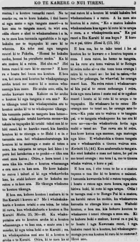 hoko kau ki te hoko hipi. Ko nga moni e riro mai te pakeha e kore e hoko ki te pu ki te paura, otiia ki te kakahu mo ratou me o ratou tamariki. Otiia e hoa ma kua pahure tenei tau, kia titiro tatou ki tenei kua timata nei, kia penei haere tatou me nga pakeha rangatira, wakamutua te kakahu paraikete i te awatea, wakamutua te haere me nga kakahu paru, wakamutua te haere noa te tu noa i te taone wakamutua te haere ki tenei whare, ki tera whare ki te rapu tangata hei hoko i u Jketutou kainga e ngari waiho ma nga Pakeha hiahia ki te hoko kainga, e haere atu ki a koutou kia mahara ano ataki koutou kei hokoa nga kainga e tama me o koutou tamariki. E hoa ma, mehemea e wakarongo ana koutou ki enei korero, a ka wakaritea ka hari haere nga ngakau o o koutou hoa Pakeha. E hoa ma e nga tangata maori katoa he tuhituhi tenei naku na tetahi e aroha atu ana ki a koutou e hiahia ana kia maatu koutou hei iwi mohio hei ite pai, Kia ata whakarongo mai koutou ki atu kupu Kua tae mai ki e au te rongo kino a na reira toku ngakau i pouri rawa ai. E kiia min ka. tanuma, ngatahitia tetahi kawenata rite tetahi tupapaku i roto i te umpa maori. E kiia ana ano ko te rua tenei o nga tanumanga i te kawanete ki raro ki te whenua. Ko teha ranei a ko te maha noa iho pea ? E hoa ma, me mohio koutou, kahore koutou i pe ua Hei ahauinga mana te kawenata ma te tupapaku ? Engari ma te tangata ora te kawenata. Ko te tangata ora ka korero ia taua kawenata ka wawata tona ngakau ki nga kupu korero ai ia i roto i te kawenata, rongo tonu ki aua kupu. Na ka witiwhi ia ki te oranga tonu tanga. Mate iho taua tangata whakapono ka noho tahi me te Karaiti, ka tahi ka tino mohiotia e ia nga kupu a te Atua Otiia aka te kore e rni te tangata ora ki te rongo atu kia Ihu Karaiti, ka mau tonu ana te kino o te ngakau maori i roto i a ia. Na, ka hemo taua tangnoa ka puta atu tona, wairua kia whakawakia ka pea atu ki withe te rangi ekore ra taua tangata e whiwhi ki te oranga tonu tanou He aha ta te pai o te kawenata ki te tangata e penei ana. Na, ka waiho te kawenata i runga i te whenua kia kitea pea e tatahi tangata ora, na ka tahuri ma ta matrata i tana mahi kino ki te pai ki te whina, pono, a ka ora tonu. E hoa ma ki te mea ka tohe koutou ki to koutou kuwaretanga me pehea koutou ka whai tawenata m E me pehea raua koutou kia ora ai ? Tenei ano tetahi kuware o te tangata maori. E hoa ma, tenei ano toku whakaaro. Na e mea ana au, ko te Rongo pai o te Atua ko te pukapuka kaua e tanumia nga tahitia me te tupapaku. He mea he tenei. Kia mahi ta koutou, kei taminga te kopu e te Atua. Me he mea ka tanumia e koutou, ka riri te Atua kia koutou. Engari ko te tikanga o te Pakeha ka mate tona tupapaku, ka waiho iwi pukapuka ki tona tamaiti ki erikananga. He penei to whakaaro o te hunga whakapono. Me waiho nga pukapuka hei oha hei tangi ma koutou mua i to koutou kuaretanga he mere pounamu te koutou taonga nui he mako ka waiho hei tangi inu koutou. Ko tenei kei roto koutou i te riri o te Karaiti e noho ana ko te pukapuka hei otu kia koutou. Ka tanumia e ngatahitia e koutou nga kakahu nga kauaka nga topuni nga paraikete pai mo te tupapaku. E mea ana ano ahau ki a koutou, hei ahatanga mana enei mea ma te tupapaku? Hei kakahu ranga ranei, hei aha ranei E whaka pirautia ana te tupapaku, kahore ona mamae i te maeke ranei te maku ranei. Kua puehu hoki nga kakahu tanumia nga tahitia me ia. Kei hea te pai o nga kakahu i ngaro ki roto ki te whenua. Tena ko tenei, me kahore e tanuimia waiho enei kakahu hei whakamahana i o koutou