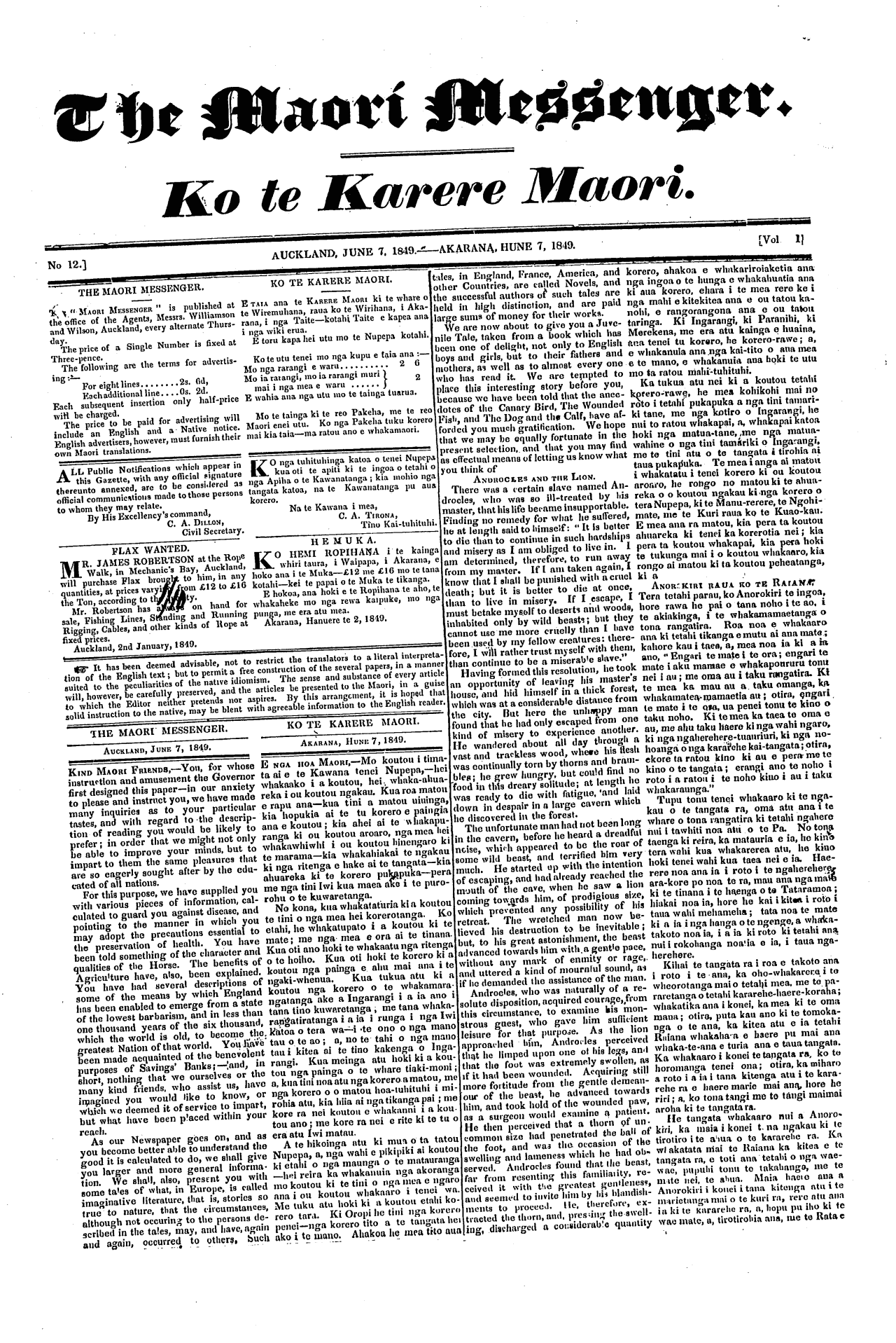 The Maori Messenger - Ko te Karere Maori 1849-1854: Volume 1, Number 12. 07 June 1849