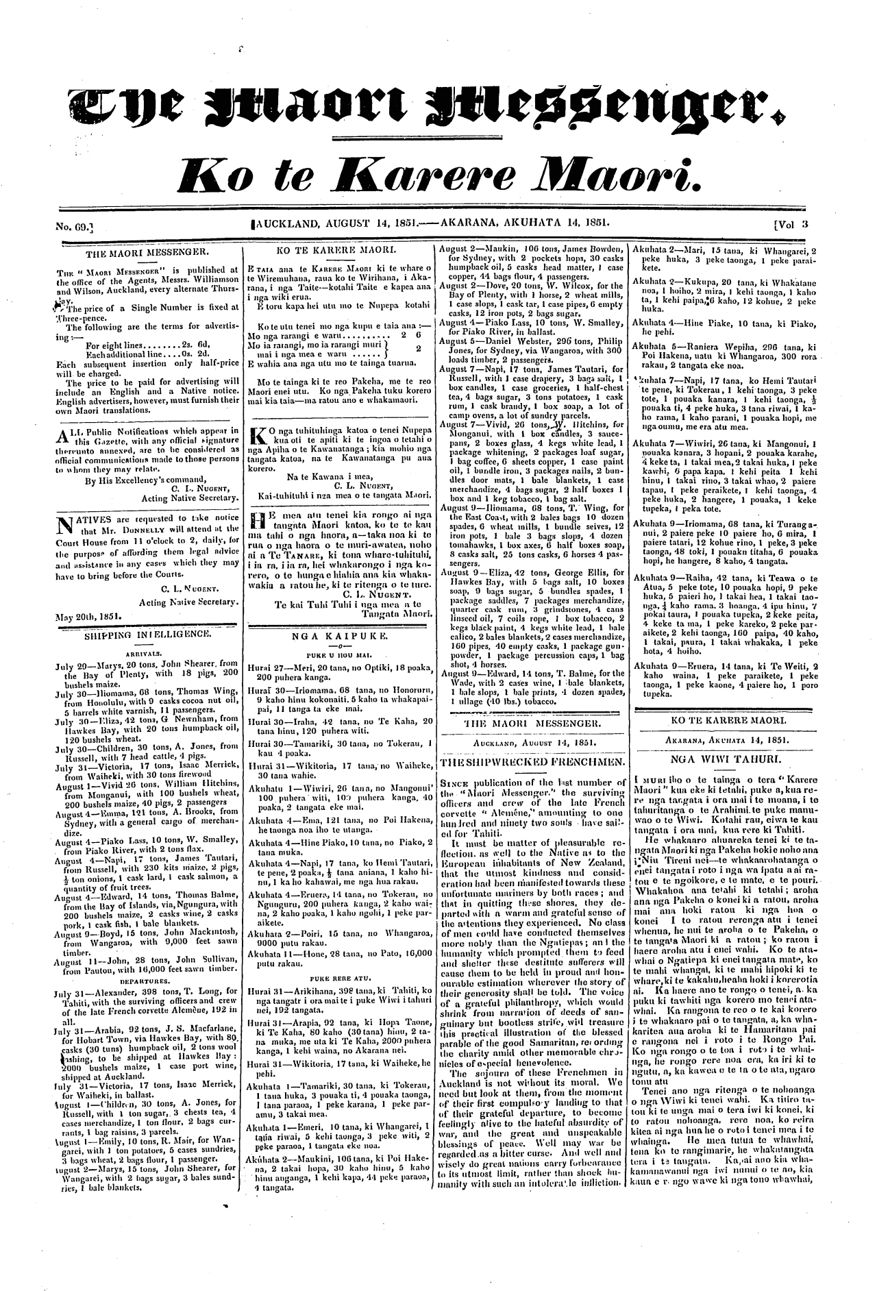 The Maori Messenger - Ko te Karere Maori 1849-1854: Volume 3, Number 69. 14 August 1851