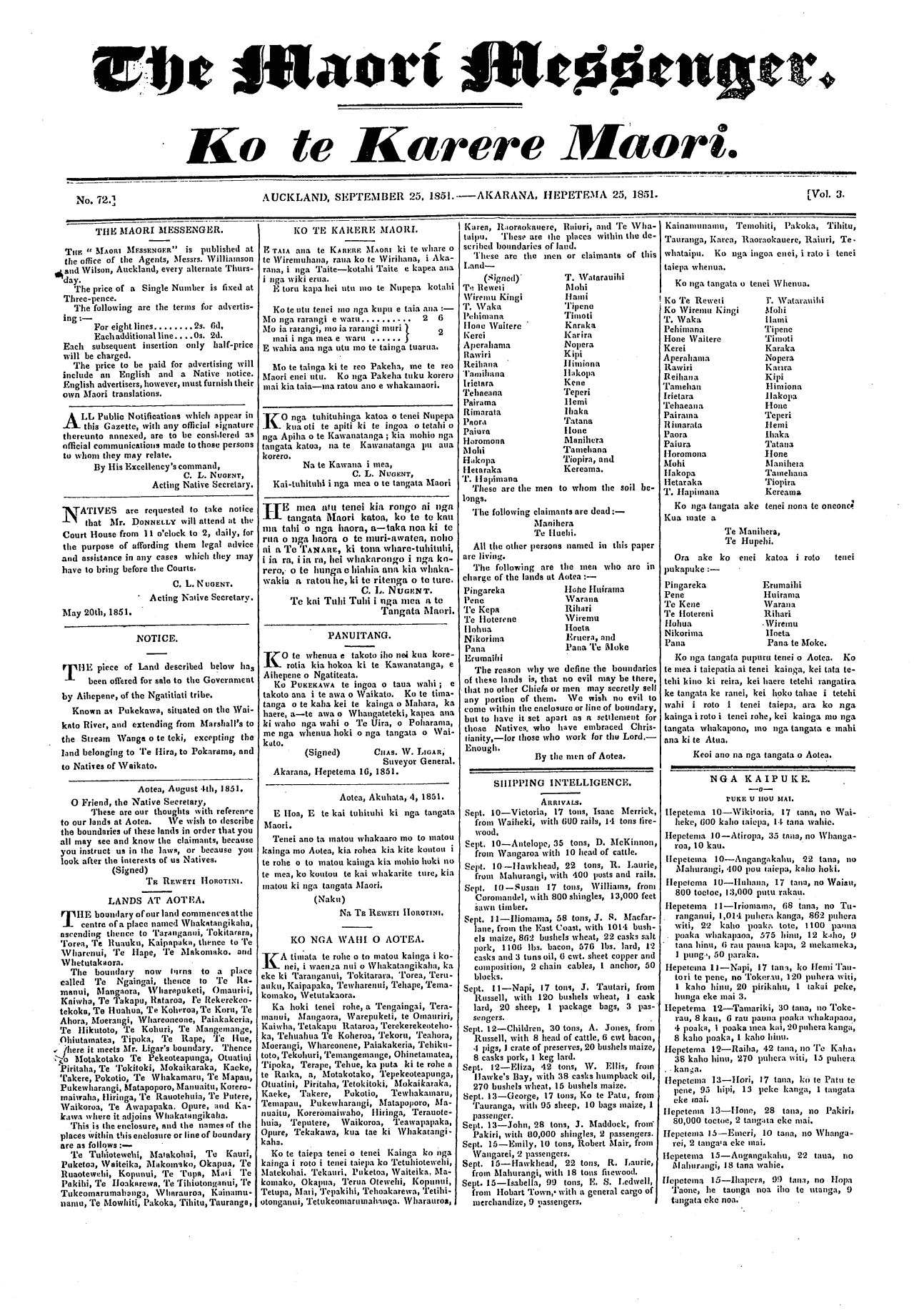 The Maori Messenger - Ko te Karere Maori 1849-1854: Volume 3, Number 72. 25 September 1851