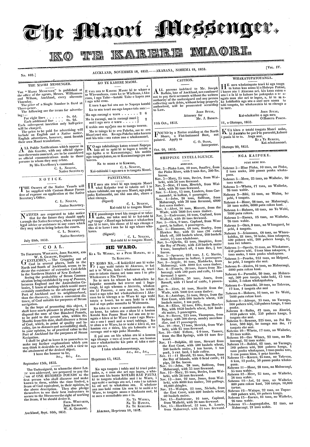 The Maori Messenger - Ko te Karere Maori 1849-1854: Volume 4, Number 102. 18 November 1852