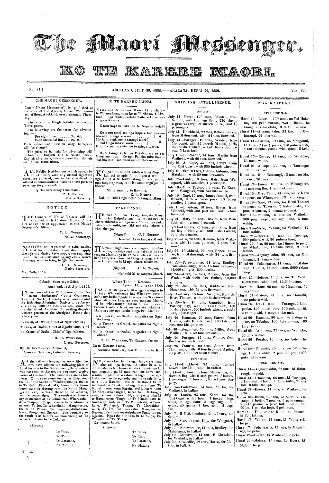 The Maori Messenger - Ko te Karere Maori 1849-1854: Volume 4, Number 94. 29 July 1852