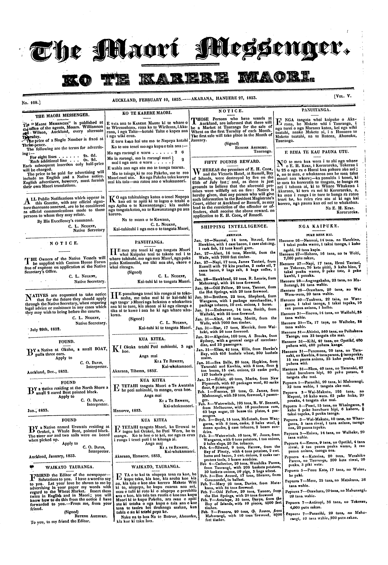 The Maori Messenger - Ko te Karere Maori 1849-1854: Volume 5, Number 108. 10 February 1853