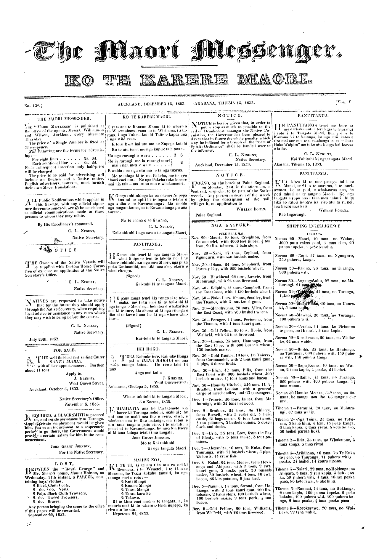 The Maori Messenger - Ko te Karere Maori 1849-1854: Volume 5, Number 130. 15 December 1853