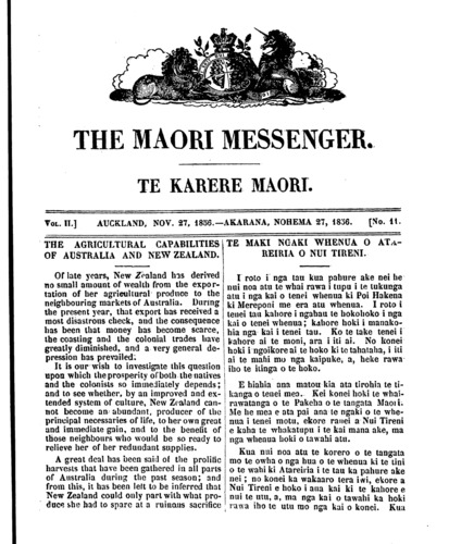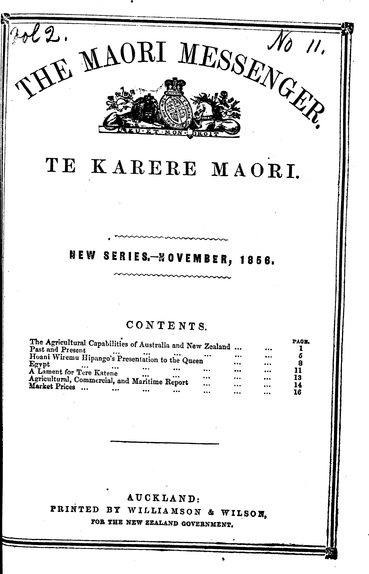 The Maori Messenger - Ko te Karere Maori 1855-1860: Volume 2, Number 11. 27 November 1856 |