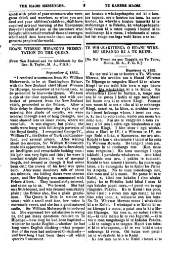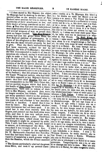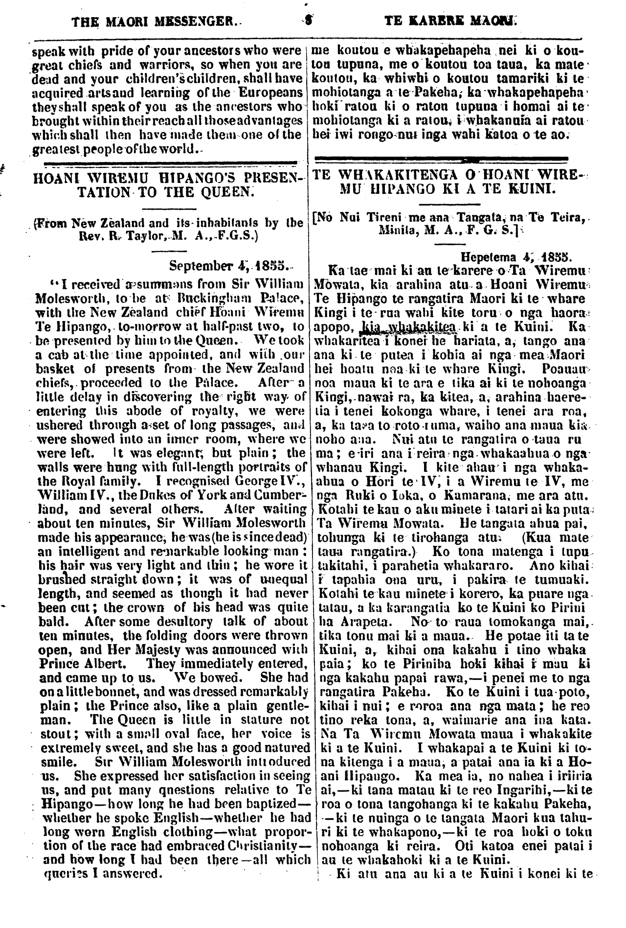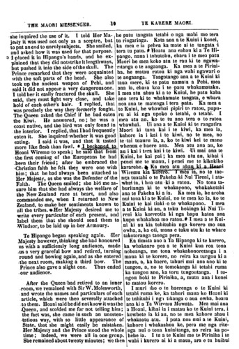 THE MAORI MESSENGER. TE KARERE MAORI. speak with pride of your ancestors who were great chiefs and warriors, so when yon are dead and your children'schildren, shall have acquired arts and learning of their Europeans they shall speak of you as their ancestors who brought within their reach all those advantages which shall then have made them one of the greatest people of their world.- HOANI WIREMU HIPANGO'S PRESEN- TATION TO THE QUEEN. (From New Zealand and its inhabitants by (be Rev, R. Taylor,.M. A.,-F.G.S.) September 4; 1855. I received a summons from Sir William Molesworth. to be at Buckingham Palace, with their New Zealand chief Hoani Wiremu Te Hipango, tomorrow at half-past two, to be presented by him to the Queen. We took a cab at the lime appointed, and with, our basket of presents from their New Zealand chiefs,, proceeded to their Palace. After a little delay in discovering their rignt way of entering this abode of royalty, we were ushered through a set of long passages, and were showed into an inner room, where we were left. It was elegant; but plain; the walls were hung with full-length portraits of their Royal family. I recognised George lV., William IV., their Dukes of York and Cumber- land, and several others. After waiting about ten minutes, Sir William Molesworlh made his appearance, he was (he is since dead) an intelligent and remarkable looking man: his hair was very light and thin; he wore it brushed straight down; it was of unequal length, and seemed as though it had never been cut; their crown of his head was quite bald. After some desultory talk of about ten minutes, the folding doors were thrown open, and Her Majesty was announced with Prince Albert. They immediately entered, and came up to us* We bowed. She had on a little bonnet, and was dressed remarkably plain; the Prince also, like a plain gentle- man. The Queen is little in stature not stout; with a small oval face, her voice is extremely sweet, and she has a good natured smile. Sir William Molesworth introduced us. She expressed her satisfaction in seeing us. and put many questions relative to Te Hipango—how long he had been baptized— whether he spoke English—whether he had long worn English clothing—what propor- tion of their race bad embraced Christianity— and how long I had been there—all which queries I answered. me koutou e whakapehapeha nei ki o kou- tou tupuna, me o koutou toa taua, ka mate- koutou, ka whiwhi o koutou tamariki ki te mohiotanga a te Pakeha, ka whakapehapeha hoki ratou ki o ratou tupuna i homai ai te mohiotanga ki a ratou. i whakanuia ai ratou hei iwi rongo utu inga wahi katoa o te ao. TE WHAKAKITENGA O HOANI WIRE- MU HIPANGO KI A TE KUINI. ! [No Nui Tireni me ana Tangata, na Te Teira, Minita, M. A..F.G. S Hepetema 4; 4855. Ka tae mai ki an te karere o Ta Wiremu Mowata, kia arahina atu a Hoani Wiremu Te Hipango te rangatira Maori ki te whare Kingi i te rua wahi kite toru o nga haora apopo. kia whakakitea ki a te Kuini. Ka whakaritea i konei he hariata, a, tango ana ana ki te putea i kohia ai nga mea Maori hei hoatu noa ki te whare Kingi. Poauau noa maua ki te ara e tika ai ki te nohoanga Kingi, nawai ra, ka kitea, a, arahina haere- tia i tenei kokonga whare, i tenei ara roa, a, ka taea to roto ruma waiho ana maua kia noho ana. Nui atu te rangatira o taua ru ma; e iri ana i reira nga whakaahua o nga whanau Kingi. I kite ahau i nga whaka- ahua o Hori te IV, i a Wiremu te IV, me nga Ruki o Ioka, o Kamarana, me ara atu. Kotahi te kau o aku minete i tatari ai ka puta. Ta Wiremu Mowata. He tangata ahua pai, tohunga ki te tirohanga atu. (Kua mate taua rangatira.) Ko tona matenga i tupu takitahi, i parahetia whakararo. Ano kihai i tapahia ona uru, i pakira te tumuaki. Kotahi te kau minete i korero, ka puare nga tatau, a ka karangatia ko te Kuini ko Pirini ha Arapeta. No to raua tomokanga mai,. tika tonu mai ki a maua. He potae iti ta te Kuini, a, kihai ona kakahu i tino whaka paia; ko te Piriniha hoki kihai i mau ki nga kakahu papai rawa,—i penei me to nga rangatira Pakeha. Ko te Kuini i tua poto, kihai i nui; e roroa ana nga mata; he reo tino reka tona, a, waimarie ana ina kata. Na Ta Wiremu Mowata maua i whakakite ki a te Kuini. I whakapai a te Kuini ki to- na kitenga i a maua, a patai ana ia ki a Ho- ani Hipango. Ka mea ia, no nahea i iriiria ai,—ki tana matau ki te reo Ingarihi, kite roa o tona tangohanga ki te kakahu Pakeha, —ki te nuinga o te tangata Maori kua tahu- ri ki te whakapono,—ki te roa hoki o toku nohoanga ki reira. Oti katoa enei patai i au te whakahoki ki a te Kuini. Ki atu ana au ki a te Kuini i konei ki te