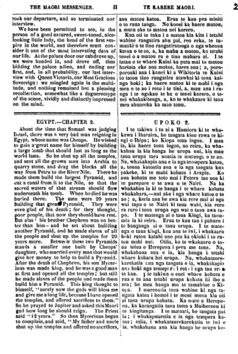THE MAORI MESSENGER. 11 TE KARERE MA0RI. took our departure, and so terminated our interview. We have been permitted to see, in their person of a good natured, sweet-toned, nice- looking little lady, their head of the first em- pire in their world, and therefore must con- sider it one of the most interesting days of our life. At their palace door our cab drove up, we were handed in, and drove off, thus bidding their palace adieu, and ending our first, and, in all probability, our last inter- view with Queen Victoria, our Most Gracious Sovereign: we mingled again in the multi- tude, and nothing remained but a pleasing recollection, somewhat like a daguerreotype of the scene, vividly and distinctly impressed on the mind. EGYPT.—CHAPTER 2. About the time that Samuel was Judging Israel, there was a very bad man reigning in Egypt, whose name was Cheops. He wished to gain a great name for himself by building a large tomb that should last as long as their world lasts. So he shut up all their temples, and sent all their grown men into Arabia to quarry stone, and drag the blocks all the way from Petra to the River Nile. There he made them build their largest Pyramid, and I «ml a canal from it to the Nile, so that the sacred waters of that stream should flow underneath his tomb. When he died he was buried there. The men were 20 years building that great Pyramid, They were even glad of his death; for they thought, poor people, that now they should have rest. But alas his brother Chephren was no bet- ter than him and he set about building another Pyramid, and he made slaves of all their people and shut up the temples for 20 years more. Between these two Pyramids stands a smaller one built by Cheops' daughter, who married every man that would give her money to help to build a Pyramid. After the death of Chephren, his son Mycer- inus was made king, and he was a good man at first and opened all their temples; but still be made slaves of the people and made them build him a Pyramid. This king thought to himself, "surely now their gods will bless me and give me a long life, because I have opened the temples, and offered sacrifices to them." So he prayed to Jupiter and asked this Maori god how long he should reign. The Priest said 12 years." So then Mycerinus began to complain, and said, "My father and uncle shut up their temples and offered no sacrifices, ana matou katoa. Erua te kau pea miniti o to raua tunga. No konei ka haere matou, a mutu ake to matou nei korero . Kua oti te tuku i a matou kia kite i tetahi wahine rangatira ahu pai, reo reka. te tu- muaki o te tino rangatiratanga o nga whenua katoa o te ao, a, ka maha a matou, ko tetahi tenei o a matou ra e tino mahara ai. I te tatau o te whare Kuini ka puta mai to matou hariata eke ana matua, haere ana; a, poro- poroaki ana i konei ki a Wikitoria te Kuini to tatou tino rangatira atawhai ki tona kai- nga hoki; ka haere matou ki te mahi i nga mea o te ao i roto i te tini, a, mau ana i ru- nga i te ngakau te ha o tenei korero, o te- nei whakakitenga, a, ko te whakaaro ki taua mea ahuareka ka mau tonu. UPOKO 2; I te takiwa i tu ai a Hamiora ki te wha- kawa i Iharaira, he tangata kino rawa te ki- ngi o Ihipa; ko Kiopa tona ingoa. I mea ia, kia haere tona ingoa, no reira, ka wha- kahau ia kia hanga be urupa nui, kia mau taua urupa taea noatia te mutunga o te ao. Na, whakakapia ana e ia nga temepera katoa, a, tonoa katoatia ana e ia nga tangata kua pakeke, ki te mahi kohatu i Arapia. Ko aua kohatu me toto mai i Petera tae noa ki te parepare o te awa o te Nairi. Na ka whakahau ia ki te hanga i te whare kohatu whakahara,—nui ake i nga whare katoa o te ao; a, keria ana he awa kia rere mai ai nga wai tapu o te Nairi ki taua wahi, kia rere ra raro i tona urupa nga wai o taua awa ta- pu. I te matenga ai o taua Kingi, ka tanu- mia ia ki reira. Erua te kau tau i pahure i te hanganga ai o taua urupa. I te mate- nga o taua kingi, koa ana te iwi, i whakaaro hoki ratou katahi ano pea ka okioki i to ra- tou mahi nui. Otiia, ko te wkakaaro o to- na teina o Herepena i pera me tona. Na, whakahaua ana e ia, kia hanga i tetahi whare kohatu hei urupa. Na, whakataure- karekatia ana nga tangata e ia, whakakapia ana hoki nga temepara i roto i nga tau erua te kau. I te takiwa o enei whare kohatu e rua e tu ana tetahi urupa kohatu iti iho o era; he mea hanga mo te tamahine o Ki- opa. I marenatia taua wahine ki nga ta- ngata katoa i homai i te moni mona kia oti ai famine urupa kohatu. Ka mate a Herepe- na, ka karangatia, famine tama a Maiherenu ki te kingitanga. I te mataati, he tangata pai ia; i whakapuaretia e ia nga tempera ka- toa; otiia, i whakataurekarekatia te iwi e i ia, whakahaua ana kia hanga he urupa ko-