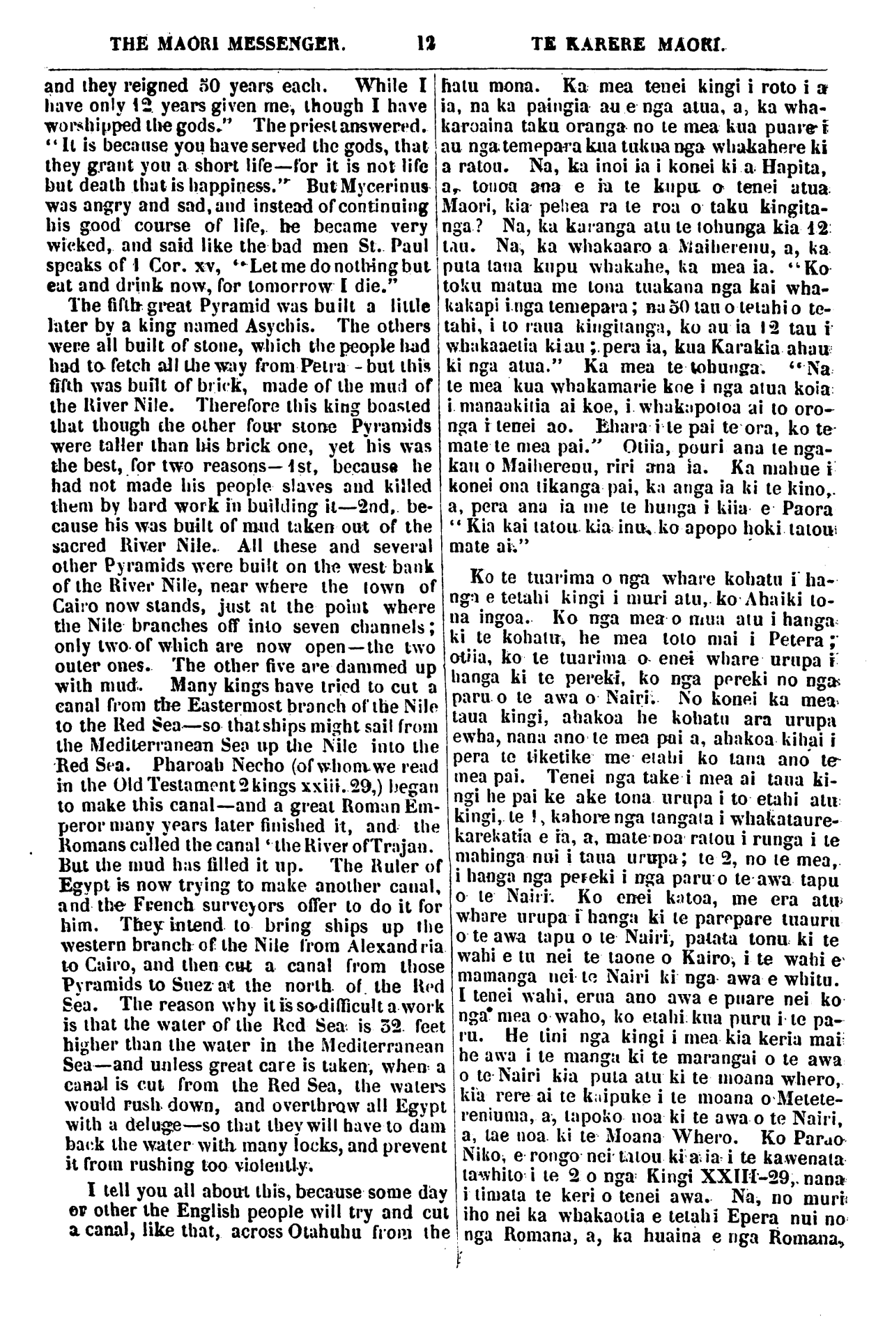 THE MAORI MESSENGER. 12 TE KARERE MAORI. and they reigned 50 years each. While I have only 12 years given me, though I have worshipped the gods," The priest answered. " lt is because you have served the gods, that they grant you a short life—for it is not life but death that is happiness." But Mycerinus was angry and sad, and instead of continuing his good course of life, be became very wicked, and said like the bad men St. Paul speaks of I Cor.xv, " Let me do nothing but eat and drink now, for tomorrow I die." The fifth great Pyramid was built a little later by a king named Asychis. The others were all built of stone, which their people had had to fetch all the way from Petra -but this fifth was built of brick, made of the mud of their River Nile. Therefore this king boasted that though the other four stone Pyramids were taller than his brick one, yet his was the best, for two reasons— 1st, because he had not made his people slaves and killed them by hard work in building it—2nd. be- cause his was built of mud taken out of the sacred River Nile. All these and several other Pyramids were built on the west bank of their River Nile, near where the town of Cairo now stands, just at the point where the Nile branches off into seven channels; only two of which are now open—the two outer ones. The other five are dammed up with mud. Many kings have tried to cut a canal from their Easter most branch of the Nile to the Red Sea—so that ships might sail from the Mediterranean Sea up their Nile into the Bed Sea. Pharoah Necho (of whom we read in the Old Testament 2 kings xxiii. 29,) began to make this canal—and a great Roman Em- peror many years later finished it, and the Romans called the canal the River of Trajan. But the mud has filled it up. The Ruler of Egypt is now trying to make another canal, and the French surveyors oner to do it for him. They Intend to bring ships up the western branch of the Nile from Alexandria to Cairo, and then cut a canal from those Pyramids to Suez at the north of. the Red Sea. The reason why it is so-difficult a work is that the water of the Red Sea is 52 feet higher than the water in the Mediterranean Sea—and unless great care is taken, when a canal is cut from the Red Sea, the waters would rush down, and overthrow all Egypt with a deluge —so that they will have to dam back the water with many locks, and prevent it from rushing too violently. I tell you all about this, because some day or other the English people will try and cut a canal, like that. across Otahuhu from the ham mona. Ka mea tenei kingi i roto i a ia, na ka paingia au e nga atua, a, ka wha- karoaina taku oranga no te mea kua puare i au nga temepara kua tukua nga whakahere ki a ratou. Na, ka inoi ia i konei ki a Hapita, a, tonoa ana e ro te kupu & tenei atua Maori, kia pehea ra te roa o taku kingita- nga? Na, ka karanga atu te tohunga kia 12 tau. Na, ka whakaaro a Maiherenu, a, ka puta tana kupu whakahe, ka mea ia. "Ko toku matua me tona tuakana nga kai wha- kakapi i nga temepara; na 50 tau o tetahi o te- tahi, i to raua kingitanga, ko au ia 12 tau i whakaaetia ki au; pera ia, kua Karakia ahau ki nga atua." Ka mea te tohunga. "Na te mea kua whakamarie koe i nga atua koia i manaakitia ai koe, i whakapotoa ai to oro- nga i tenei ao. Ehara i te pai te ora, ko te mate te mea pai." Otiia, pouri ana te nga- kau o Maiherenu, riri ana ia. Ka mahue i konei ona tikanga pai, ka anga ia ki te kino,. a, pera ana ia me te hunga i kiia e Paora " Kia kai tatou kia inu ko apopo hoki tatou mate ai." Ko te tuarima o nga whare kohatu i ha- nga e tetahi kingi i muri atu, ko Ahaiki to- na ingoa. Ko nga mea o mua atu i hanga ki te kohatu, he mea toto mai i Petera; otiia, ko te tuarima o enei whare urupa i hanga ki te pereki, ko nga pereki no nga paru o te awa o Nairi. No konei ka mea taua kingi, ahakoa he kohatu ara urupa ewha, nana ano te mea pai a, ahakoa kihai i pera te tiketike me etahi ko tana ano te mea pai. Tenei nga take i mea ai taua ki- ngi he pai ke ake tona urupa i to etahi atu kingi, te kahore nga tangata i whakataure- karekatia e ia, a, mate noa ratou i runga i te mahinga utu i taua urupa; te 2, no te mea. i hanga nga pereki i nga paru o te awa tapu o te Nairi. Ko enei katoa, me era atu whare urupa i hanga ki te parepare tuauru o te awa tapu o te Nairi, patata tonu ki te wahi e tu nei te taone o Kairo, i te wahi e mamanga nei te Nairi ki nga awa e whitu. I tenei wahi, erua ano awa e puare nei ko nga mea o waho, ko etahi kua puru i te pa- ru. He tini nga kingi i mea kia keria mai he awa i te manga ki te marangai o te awa o te Nai ri kia puta atu ki te moana whero, kia rere ai te kaipuke i te moana o Metete- reniuma, a, tapoko noa ki te awa o te Nairi, a, tae noa ki te Moana Whero. Ko Paroa Niko, e rongo nei tatou ki a. ia i te kawenata tawhito i te 2 o nga Kingi XXIII-29,. nana i timata te keri o tenei awa. Na, no muri! iho nei ka whakaetia e tetahi Epera nui no e nga Romana, a, ka huaina e nga Romana,