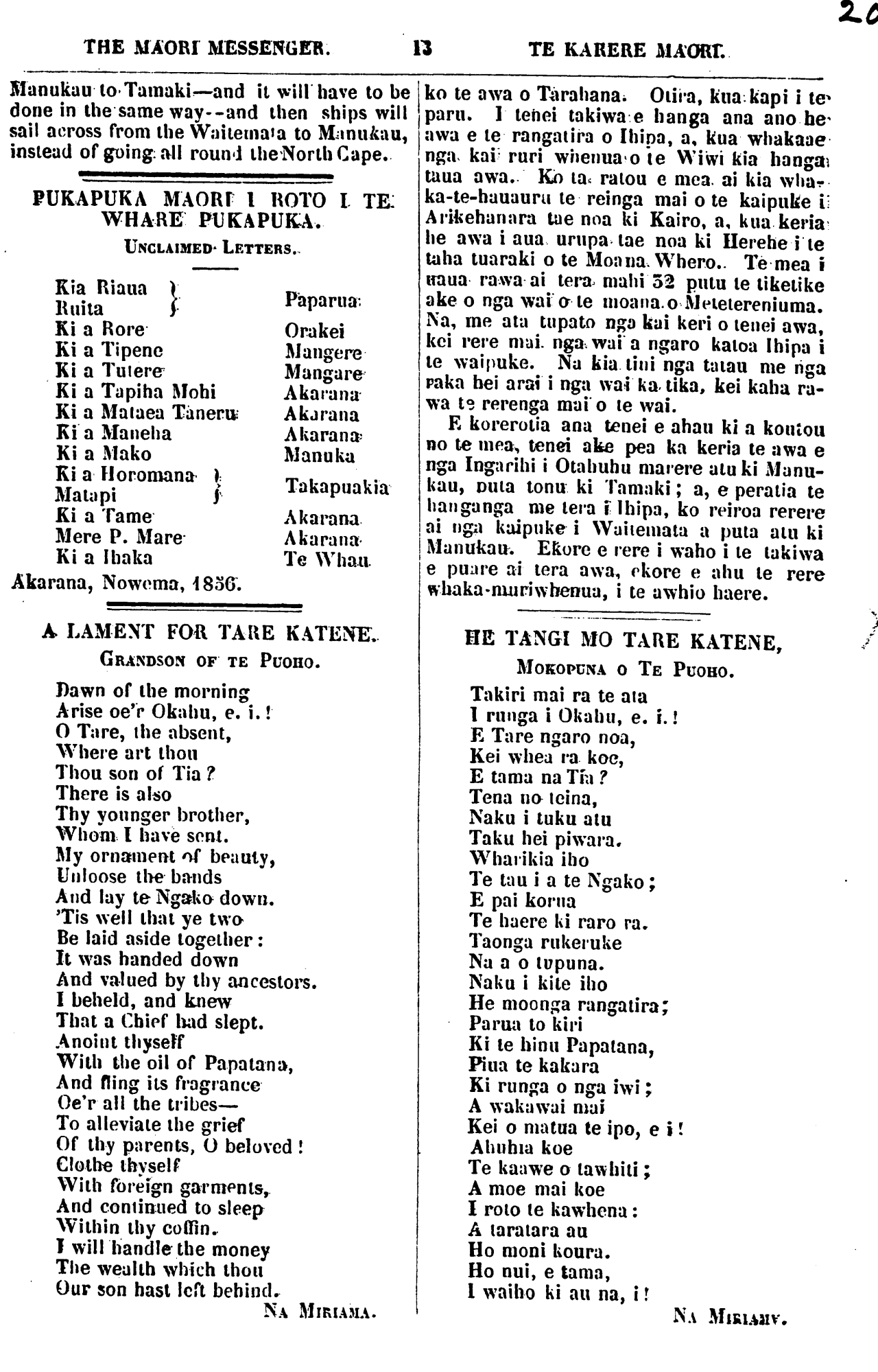 THE MAORI MESSENGER. TE KAKERE MAORI. Manukau to Tamaki—and it will have to be done in their same way and then ships will sail across from their Waitemata to Manukau, instead of going, all round the North Cape. PUKAPUKA MAORI I ROTO I TE: WHARE PUKAPUKA. UNCLAIMED LETTERS. Kia Riaua) Riuta * Ki a Rore Orakei Ki a Tipene Mangere Ki a Tutere Mangare Ki a Tapiha Mohi Akarana Ki a Mataea Taneru Akarana Ki a Maneha Akarana Ki a Mako Manuka Ki a Horomana Takapuakia, Ki a Tame Akarana Mere P. Mare Akarana Ki a Ihaka Te Whau Akarana, Nowema, 1856. A LAMENT FOR TARE KATENE, GRANDSON OF TE PUOHO. Dawn of the morning Arise oe'r Okahu, e. i.! O Tare, the absent, Where art thou Thou son of Tia? There is also Thy younger brother, Whom I have sent. My ornament of beauty, Unloose the bands And lay te Ngako down. 'Tis well that ye two Be laid aside together: It was handed down And valued by thy ancestors. I beheld, and knew That a Chief had slept. Anoint thyself With the oil of Papatana, And fling its fragrance Oe'r all the tribes— To alleviate the grief Of thy parents, 0 beloved! Clothe thyself With foreign garments, And continued to sleep Within thy coffin. I will handle the money The wealth which thou Our son hast left behind. NA MIRIAMA. ko te awa o Tarahana. Otira, kua kapi i te paru. I tenei takiwa e hanga ana ano he awa e te rangatira o Ihipa, a, kua whakaae nga kai ruri whenua o te Wiwi kia hanga taua awa. Ko ta ratou e mea. ai kia wha- ka-te-hauauru te reinga mai o te kaipuke i Arikehanara tae noa ki Kairo, a, kua keria he awa i aua urupa tae noa ki Herehe i te taha tuaraki o te Moa na. Whero. Te mea i uaua rawa ai tera. mahi 52 putu te tiketike ake o nga wai a te moana o Metetereniuma. Na, me ata tupato nga kui keri o tenei awa, kei rere mai. nga, wai a ngaro katoa Ihipa i te waipuke. Na kia tini nga tatau me nga paka hei arai i nga wai ka tika, kei kaha ra- wa te rerenga mai o te wai. E korerotia ana tenei e ahau ki a koutou no te mea, tenei ake pea ka keria te awa e nga Ingarihi i Otahuhu marere atu ki Manu- kau, puta tonu ki Tamaki; a, e peratia te hanganga me tera i Ihipa, ko reiroa rerere ai nga kaipuke i Waitemata a puta atu ki Manukau. Ekore e rere i waho i te takiwa e puare ai tera awa, ekore e ahu te rere whaka-muriwhenua, i te awhio haere. HE TANGI MO TARE KATENE, MOKOPUNA o TE PUOHO. Takiri mai ra te ata I runga i Okahu, e. i.! E Tare ngaro noa, Kei whea ra koe, E tama na Tia? Tena no teina, Naku i tuku atu Taku hei piwara. Wharikia iho Te tau i a te Ngako; E pai korua Te haere ki raro ra. Taonga rukeruke Na a o tupuna. Naku i kite iho He moonga rangatira; Parua to kiri Ki te hinu Papatana, Piua te kakara Ki runga o nga iwi; A wakawai mai Kei o matua te ipo, e i ! Ahuhia koe Te kaawe o tawhiti; A moe mai koe I roto te kawhena: A taratara au Ho moni koura. Ho nui, e tama, I waiho ki au na, i ! NA MIRIAMA.