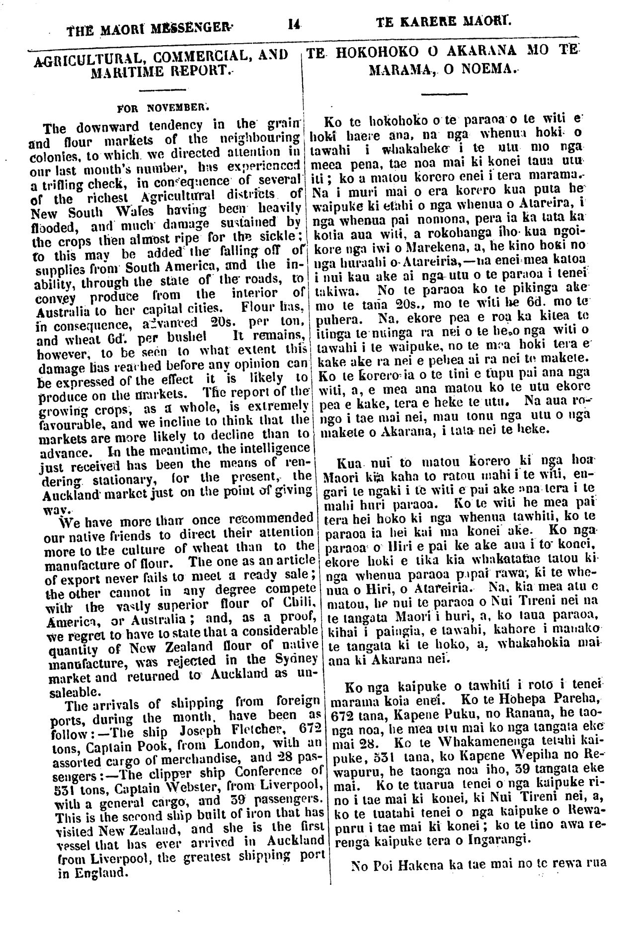 THE MAORI MESSSENGER. 14 TE KARERE MAORI. AGRICULTURAL, COMMERCIAL. AND MARITIME REPORT. FOR NOVEMBER. The downward tendency in the grain and flour markets of their neighbouring colonies, to which we directed attention in our last month's number, has experienced a trifling check, to consequence of several of their richest Agricultural districts of New South Wales having been heavily flooded, and much damage sustained by their crops then almost ripe for the sickle; to this may be added the falling off of supplies from South America, and the in- ability, through their state of the roads, to convey produce from their interior of Australia to her capital cities. Flour has, in consequence, advanced 20s. per ton, and wheat 6d. pep bushel It remains, however, to be seen to what extent this damage lias reached before any opinion can be expressed of the effect it is likely to produce on the markets. The report of the growing crops, as a whole, is extremely favourable, and we incline to think that the markets are more likely to decline than to advance. In the meantime, the intelligence just received has been the means of ren- dering stationary, for the present, the Auckland market just on the point of giving way. We have mere than once recommended our native friends to direct their attention more to the culture of wheat than to the manufacture of flour. The one as an article of export never fails to meet a ready sale; the other cannot in any degree compete wilth the vastly superior flour of Chili, America, or Australia; and, as a proof, we regret to have to stale that a considerable quantity of New Zealand flour of native manufacture, was rejected in the Sydney market and returned to Auckland as un- saleable. The arrivals of shipping from foreign ports, during the month, have been as follow:—The ship Joseph Fletcher, 672 tons, Captain Pook, from London, with an assorted cargo of merchandise, and 28 pas- sengers:—The clipper ship Conference of 531 tons, Captain Webster, from Liverpool, with a general cargo, and 39 passengers. This is the second ship built of iron that has visited New Zealand, and she is the first vessel that has ever arrived in Auckland from Liverpool, the greatest shipping port in England. TE HOKOHOKO O AKARANA MO TE MARAMA, O NOEMA. Ko te hokohoko o te paraoa o te witi e hoki haere ana, na nga whenua hoki o tawahi i whakaheke i te utu mo nga meea pena, tae noa mai ki konei taua mu iti; ko a matou korero enei i tera marama. Na i muri mai o era korero kua puta he I waipuke ki etahi o nga whenua o Atareira, i nga whenua pai nomona, pera ia ka tata ka kotia aua witi, a rokohanga iho kua ngoi- kore nga iwi o Marekena, a, he kino hoki no nga huraahi o Atareiria,—na enei mea katoa i nui kau ake ai nga utu o te paraoa i tenei takiwa. No te paraoa ko te pikinga ake mo te taria 20s., mo te witi he 6d. mo te puhera. Na, ekore pea e roa ka kitea te itinga te nuinga ra nei o te he o nga witi o tawahi i te waipuke, no te mea hoki tera e kake ake ra nei e pehea ai ra nei te makete. Ko te korero ia o te tini e tupu pai ana nga witi, a, e mea ana matou ko te utu ekore pea e kake, tera e heke te utu. Na aua ro- ngo i tae mai nei, mau tonu nga utu o nga makete o Akarana, i tata nei te heke. Kua nui to matou korero ki nga hoa Maori kia kaha to ratou mahi i te witi, en- gari te ngaki i te witi e pai ake ana tera i te mahi huri paraoa. Ko te witi he mea pai tera hei hoko ki nga whenua tawhiti, ko te paraoa ia hei kai ma konei ake. Ko nga paraoa o Hiri e pai ke ake ana i to konei, ekore hoki e tika kia whakatatae tatou ki nga whenua paraoa papai rawa, ki te whe- nua o Hiri, o Atareiria. Na, kia mea atu e matou, he nui te paraoa o Nui Tireni nei na te tangata Maori i huri, a, ko taua paraoa, kihai i paingia, e tawahi, kahore i manako te tangata ki te hoko, a; whakahokia mai ana ki Akarana nei. Ko nga kaipuke o tawhiti i roto i tenei marama koia enei. Ko te Hohepa Pareha, 672 tana, Kapene Puku, no Ranana, he tao- nga noa, he mea utu mai ko nga tangata eke mai 28. Ko te Whakamenenga tetahi kai- puke, 531 tana, ko Kapene Wepiha no Re- wapuru, he taonga noa iho, 39 tangata eke mai. Ko te tuarua tenei o nga kaipuke ri- no i tae mai ki konei, ki Nui Tireni nei, a, ko te tuatahi tenei o nga kaipuke o Rewa- puru i tae mai ki konei; ko te tino awa re- renga kaipuke tera o Ingarangi. No Poi Hakena ka tae mai no te rewa rua