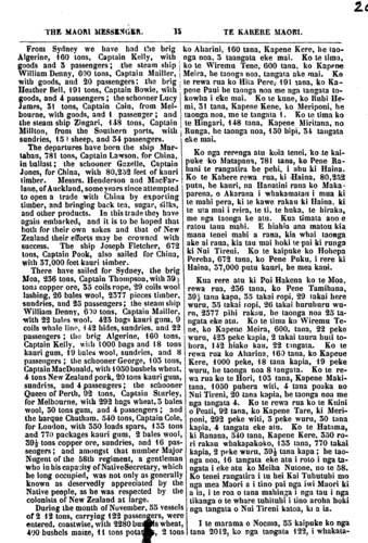THE MAORI MESSENGER. I5 TE KARERE MAORI. From Sydney we have had the brig Algerine, 160 tons, Captain Kelly, with goods and 3 passengers;, the steam ship William Denny, 600 tons, Captain Mailler, with goods, and 20 passengers; the brig Heather Bell, 191 tons, Captain Bowie. with goods, and 4 passengers ; the schooner Lucy James, 31 tons, Captain Cain, from Mel- bourne, with goods, and 1 passenger; and the steam ship Zingari, 148 tons, Captain Milton, from the Southern ports, with sundries, 15 sheep, and 34 passengers. The departures have been the ship Mar- taban, 781 tons, Captain Lawson, for China, in ballast; the schooner Gazelle, Captain Jones, for China, with 80, 252 feet of kauri timber. Messrs. Henderson and MacFar- lane, of Auckland, some years since attempted to open a trade with China by exporting timber, and bringing back tea, sugar, silks, and other products. In this trade they have again embarked, and it is to be hoped that both for their own sakes and that of New Zealand their efforts may be crowned with success. The ship Joseph Fletcher, 672 tons, Captain Pook, also sailed for China, with 57, 000 feel kauri timber. There have sailed for Sydney, the brig Moa, 236 tons, Captain Thompson, with 39 ½ tons copper ore, 35 coils rope, 29 coils wool lashing, 26 bales wool, 2377 pieces timber, sundries, and 25 passengers; the steamship William Denny, 600 tons. Captain Mailler, with 22 bales wool, 425 bags kauri gum, 9 coils whale line, 142 hides, sundries, and 22 passengers; the brig Algerine, 160 tons, Captain Kelly, with 1000 bags and 18 tons kauri gum, 19 bales wool, sundries, and 8 passengers; the schooner George, 103 tons, Captain MacDonald, with 1050 bushels wheat, 4 tons New Zealand pork, 20 tons kauri gum, sundries, and 4 passengers; the schooner Queen of Perth, 92 tons, Captain Sturley, for Melbourne, with 292 bags wheat. 5 bales wool, 30 tons gum, and 4 passengers; and their barque Chatham, 540 tons, Captain Cole, for London, with 350 loads spars, 153 tons and 770 packages kauri gum, 2 bales wool, 39½ tons copper ore, sundries, and 16 pas- sengers; and amongst that number Major Nugent of the 58th regiment, a gentleman who in his capacity of Native Secretary, which he long occupied, was not only as generally known as deservedly appreciated by the Native people, as he was respected by the colonists of New Zealand at large. During the month of November, 55 vessels of 2 12 tons, carrying 122 passengers, were entered, coastwise, with 2280 bushels wheat, 400 bushels maize, 11 tons potatoes, 2 tons ko Aharini, 160 tana, Kapene Kere, he tao- nga noa, 3 taangata eke mai. Ko te lima, ko te Wiremu Tene, 600 tana, ko Kapene I Meira, he taonga noa, tangata ake mai. Ko te rewa rua ko Hita Pere, 191 tana, ko Ka- pene Paui he taonga noa me nga tangata to- kowha i eke mai. Ko te kune, ko Kuhi He- mi, 31 tana, Kapene Kene, ko Meriponi, he taonga noa, me te tangata 1. Ko te tima ko te Hingari, 148 tana, Kapene Miritana, no Runga, he taonga noa, 150 hipi, 54 tangata eke mai. Ko nga rerenga atu kuia tenei, ko te kai- puke ko Matapona, 781 tana, ko Pene Ra- hani te rangatira he pehi, i ahu ki Haina. Ko te Kahere rewa rua, ki Haina, 80, 252 putu, he kauri, na Hanatini raua ko Maka- parena, o Akarana i whakamatau i mua ki te mahi pera, ki te kawe rakau ki Haina, ki te uta mai i reira, te ti, te huka, te hiraka, me nga taonga ke atu. Kua timata ano e ratou taua mahi. E hiahia ana matou kia mana tenei mahi a raua, kia whai taonga ake ai raua, kia tau mai hoki te pai ki runga ki Nui Tireni. Ko te kaipuke ko Hohepa Pereha, 672 tana, ko Pene Puku, i rere ki Haina, 57, 000 putu kauri, he mea kani. Kua rere atu ki Poi Hakena ko te Moa, rewa rua, 256 tana, ko Pene Tamihana, 393- tana kapa, 35 takai ropi, 29 takai here wuru, 35 takai ropi, 26 takai huruhuru wu- ru, 2377 pihi rakau, he taonga noa 25 ta- ngata eke atu. Ko te tima ko Wiremu Te- ne, ko Kapene Meira, 600. tana, 22 peke wuru, 423 peke kapia, 2 takai taura huti to- hora, 142 hiako kau, 22 tangata. Ko (e rewa rua ko Aharina, 160 tana, ko Kapene Kere, 1000 peke, 18 tana kapia, 19 peke wuru, he taonga noa 8 tangata, Ko te re- wa rua ko te Hori, 103 tana, Kapene Maki- tana, 1050 puhera witi, 4 tana poaka no Nui Tireni, 20 -tana kapia, he taonga noa me nga tangata 4. Ko te rewa rua ko te Kuini o Peati, 92 tana, ko Kapene Tare, ki Meri- poni, 292 peke witi, 5 peke wuru, 30 tana kapia, 4 tangata eke atu. Ko te Hatama, ki Ranana, 540 tana, Kapene Kere, 550 ro- ri rakau whakapakoko, 133 tana, 770 takai kapia, 2 peke wuru, 39½ tana kapa; he tao- nga noa, 16 tangata eke atu i roto i nga ta- ngata i eke atu ko Meiha Nutone, no te 58. Ko tenei rangatira i tu hei Kai Tuhituhi mo nga mea Maori a i tino pai nga iwi Maori ki a ia, i te roa o tana mahinga i nga tau i nga tikanga 6 te whare tuhituhi i tino aroha hoki nga tangata o Nui Tireni katoa, ki a ia. I te marama o Noema, 55 kaipuke ko nga tana 2012, ko nga tangata 122, i whakata-