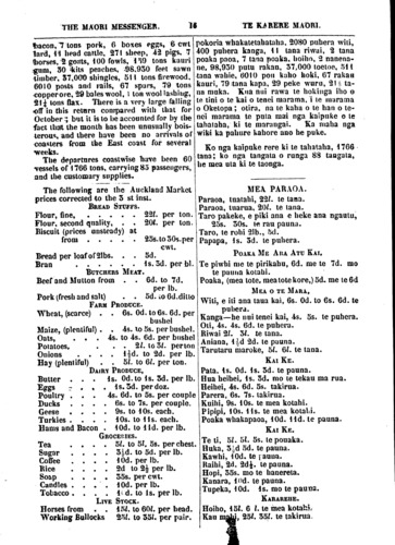THE MAORI MESSENGER. TE KARERE MAORI. bacon, 7 tons pork, 6 boxes eggs, 6 cwt lard, 11 head cattle, 271 sheep, 42 pigs, 7 horses, 2 goats, 100 fowls, 159 tons kauri gum, 50 kits peaches, .98, 950 feet sawn timber, 37, 000 shingles, 511 tons firewood, 6010 posts and rails. 67 spars, 79 tons copper ore, 29 bales wool, 1 ton wool lashing, 21¼ tons flax. There is a very large falling off in this return compared with that for October ; but it is to be accounted for by the fact that the month has been unusually bois- terous, and there have been no arrivals of coasters from the East coast for several weeks, The departures coastwise nave been 60 vessels of 1766 tons, carrying 85 passengers, and their customary supplies. The following are the Auckland Market prices corrected to the 3 st inst. BREAD STUFFS. Flour, fine, . . . 221 per ton. Flour, second quality, . . 201. per ton. Biscuit (prices unsteady) at from ..... 25s.to30s.per cwt. Bread per loaf of 2lbs. . . 5d. Bran ...... ls.3d.per bl. BUTCHERS MEAT. Beef and Mutton from . . 6d. to 7d. per Ib. Pork (fresh and salt) . . 5d. to 6d.ditto FARM PRODUCE. Wheat, (scarce) . . 6s.0d.to6s.6d.per bushel Maize, (plentiful) . . 4s. to 5s. per bushel. Oats, ... 4s. to 4s. 6d. per bushel Potatoes, . . . 21. to 31. per ton Onions . . . . 1½ to 2d. per Ib. Hay (plentiful ) . . 51 to 61 per ton. DAIRY PRODUCE, Butter . . Is. Od.to Is. 3d. per Ib. Eggs -, . Is. 3d. per doz. Poultry . . 4s. 6d. to 5s. per couple Ducks . . . 6s. to 7s. per couple. Geese . . . 9s. to 10s. each. Turkies . . . 10s. to Us. each. Hams and Bacon lOd. to 11d. per Ib. GROCERIES. Tea . . . 5 1 to 51 5s. per chest. Sugar . . . 3½d. to 5d. per Ib. Coffee . . . 1Od.per lb. Bice . . . 2d to 2½ per Ib. Soap . . . 55s. per cwt. Candles . . . 10d. per Ib. Tobacco . . . 10 d. to Is. per Ib. LIVE STOCK. Horses from . . 151 to 601 per head. Working Bullocks 251 to 351 per pair. pokoria whakatetahataha, 2080 puhera witi, 400 puhera kanga, 11 tana ri wai, 2 tana poaka paoa, 7 tana poaka, hoiho, 2 nanena- ne. 98, 930 putu rakau, 57, 000 toetoe, 511 tana wahie, 6010 pou kaho hoki, 67 rakau kauri, 79 tana kapa, 29 peke wuru, 21½ ta- na muka. Kua nui rawa te hokinga iho o te tini o te kai o tenei marama, i te marama o Oketopa; otira. na te kaha o te han o te- nei marama te puta mai nga kaipuke o te tahataha, ki te marangai. Ka maha nga wiki ka pahure kahore ano he puke. Ko nga kaipuke rere ki te tahataha, 1766 tana; ko nga tangata o runga 88 tangata, he mea uta ki te taonga. MEA PARAOA. Paraoa. tuatahi, 221 te tana. Paraoa, tuarua, 20 1 te tana. Taro pakeke, e piki ana e heke ana ngautu, 25s. 50s, te rau pauna. Taro, te rohi 21b., 5d. Papapa, 1s. 3d. te puhera. POAKA ME ARA ATU KAI, Te piwhi me te pirikahu, 6d. me te 7d. mo te pauna kotahi. Poaka, (mea tote. mea tote kore,) 5d, me te 6d MEA o TE MARA, Witi, e iti ana taua kai, 6s. 0d. to 6s. 6d. te puhera. Kanga—he nui tenei kai, 4s. 5s. te puhera. Oti, 4s. 4s. 6d. te puhera. Riwai 21. 31. te tana, Aniana, 1½d 2d. te pauna. Tarutaru maroke, 51. 61. te tana. KAI KE. Pata, is. Od. Is. 3d. te pauna. Hua heihei, Is. 3d mo te tekau ma rua. Heihei, 4s 6d. 5s. taki rua. Parera, 6s. 7s. takirua. Kuihi, 9s. 10s. te mea kotahi. Pipipi, 10s. 11s. te mea kotahi. Poaka whakapaoa, 10d. 11d. te pauna. KAI KE. Te ti, 51 51. 5s. (e pouaka. Huka, 3½d 5d. te pauna. I Kawhi, 10d. te pauna. I Raihi, 2d. 2d½. te pauna. I Hopi, 55s. mo te hanereta. Kanara, 10d. te pauna. I Tupeka, 10d. 1s. mo te pauna. KARAREHE. Hoiho, 15 1 6 I. te mea kotahi Kau mahi, 25 1 351 te takirua.