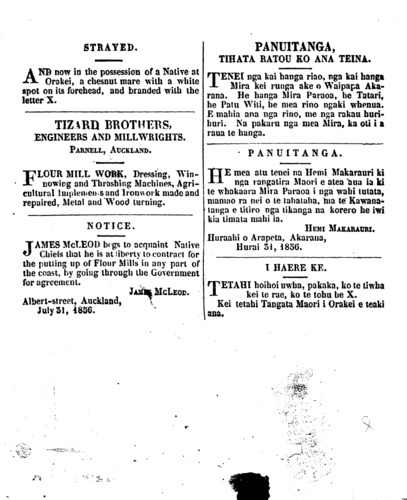 STRAYED. AND now in the possession of a Native at Orakei, a chestnut mare with a while spot on its forehead, and branded with the letter X. TIZARD BROTHERS, ENGINEERS AND MILLWRIGHTS. PARNELL, AUCKLAND. FLOUR MILL WORK, Dressing, Win- nowing and Thrashing Machines, Agri- cultural implements and Ironwork made and repaired, Metal and Wood turning. NOTICE JAMES McLEOD begs ( to acquaint Native Chiefs that he is at liberty to contract for the pulling up of Flour Mills in any part of the coast, by going through the Government for agreement. JAMlE McLEOD. Albert-street, Auckland, July 51, 1856. PANUITANGA, TIHATA RATOU KO ANA TEINA. TENEI nga kai hanga nao, nga kai hanga Mira kei runga ake o Waipapa Aka- rana. He hanga Mira Paraoa, he Tatari, he Patu Witi, he mea rino ngaki whenua. E mahia ana nga rino, me nga rakau huri- huri. Na pakaru nga mea Mira, ka oti i a raua te hanga. PANUITANGA. HE mea atu tenei na Hemi Makarauri ki nga rangatira Maori e atea aua ia ki te whakaaru Mira Paraoa i nga wahi tutata, mamao ra nei o te tahataha, ma te Kawana- tanga e titiro nga tikanga na korero he iwi kia timata mahi ia. HEMI MAKARAURI. Huraahi o Arapeta, Akarana, Hurai 3 i, 1856. I HAERE KE. TETAHI hoihoi uwha, pakaka, ko te tiwha kei te rae, ko te tohu he X. Kei tetahi Tangata Maori i Orakei e teaki ana.