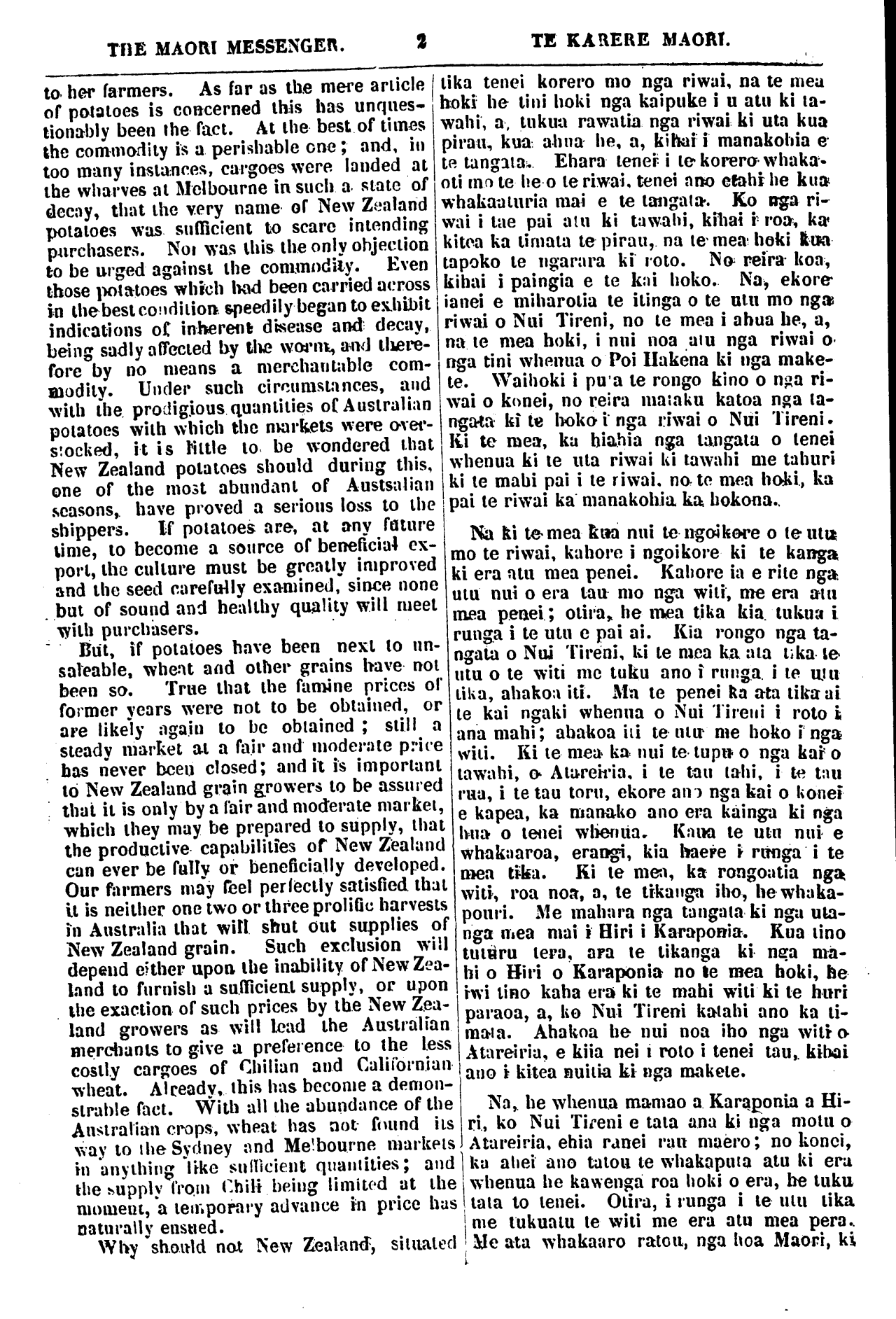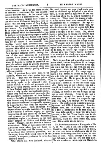 THE MAORI MESSENGER. 2 TE KARERE MAORI. to her farmers. As far as the mere article of potatoes is concerned this has unques- tionably been the fact. At the best of times the commodity is a perishable one; and, in too many instances, cargoes were landed at the wharves at Melbourne in such a state of decay, that the very name of New Zealand potatoes was sufficient to scare intending purchasers. Not was this the only objection to be urged against the commodity. Even those potatoes which had been carried across in the best condition- speedily began to exhibit indications of inherent disease and decay, being sadly affected by the worm, and there- fore by no means a merchantable com- modity. Under such circumstances, and with the prodigious quantities of Australian potatoes with which the markets were over- stocked, it is little to be wondered that New Zealand potatoes should during this, one of the most abundant of Australian seasons, have proved a serious loss to the shippers. If potatoes are, at any future time, to become a source of beneficial ex- port, the culture must be greatly improved and the seed carefully examined, since none but of sound and healthy quality will meet With purchasers. But, if potatoes have been next to un- saleable, wheat and other grains have not been so. True that the famine prices of former years were not to be obtained, or are likely again to be obtained; still a steady market at a fair and moderate price has never been closed; and it is important to New Zealand grain growers to be assured thai it is only by a fair and moderate market, which they may be prepared to supply, that the productive capabilities or New Zealand can ever be fully or beneficially developed. Our farmers may feel perfectly satisfied that it is neither one two or three prolific harvests in Australia that will shut out supplies of New Zealand grain. Such exclusion will depend either upon the inability of New Zea- land to furnish a sufficient supply, or upon the exaction of such prices by the New Zea- land growers as will lead the Australian merchants to give a preference to the less costly cargoes of Chilian and Californian wheat. Already, this has become a demon- strable fact. With all the abundance of the Australian crops, wheat has not; found its way to the Sydney and Melbourne marker in anything like sufficient quantities; and the supply from Chili being limited at the moment, a temporary advance in price ha naturally ensued. Why should not New Zealand, situated tika tenei korero mo nga riwai, na te mea hoki he tini hoki nga kaipuke i u atu ki ta- wahi, a, tukua rawatia nga riwai ki uta kua pirau, kua ahua he, a, kihai i manakohia e te tangata, Ehara tenei i te korero whaka- oti mo te he o te riwai, tenei ano etahi he kua whakaaturia mai e te tangata. Ko nga ri- wai i tae pai atu ki tawahi, kihai i roa, ka kitea ka timata te pirau, na te mea hoki kua tapoko te ngarara ki roto. No reira koa, kihai i paingia e te kai hoko. Na, ekore- ianei e miharotia te itinga o te utu mo ngai riwai o Nui Tireni, no te mea i ahua he, a, na te mea hoki, i nui noa atu nga riwai o nga tini whenua o Poi Hakena ki nga make- te. Waihoki i puta te rongo kino o nga ri- wai o konei, no reira mataku katoa nga ta- ngata ki te hoko i nga riwai o Nui Tireni. Ki te mea, ka hiahia nga tangata o tenei whenua ki te uta riwai ki tawahi me tahuri ki te mahi pai i te riwai. nate mea hoki, ka pai te riwai ka manakohia ka hokona. Na ki te mea kua nui te ngoikore o te utu mo te riwai, kahore i ngoi kore ki te kanga ki era atu mea penei. Kahore ia e rite nga utu nui o era tau mo nga will, me ero atu mea penei; otira, he mea tika kia. tukua i runga i te utu e pai ai. Kia rongo nga ta- ngata o Nui Tireni, ki te mea ka ata tika te utu o te witi me tuku ano i runga, i te utu tika, ahakoa iti. Ma te penei ka ata tika ai te kai ngaki whenua o Nui Tireni i roto i ana mahi; ahakoa ui te utu me hoko i nga will. Ki te mea ka nui te tupu o nga kai o tawahi, o Atareiria, i te tau tahi, i te tau rua, i te tau toru, ekore ano nga kai o konei e kapea, ka manako ano era kainga ki nga hua o tenei whenua. Kaua te utu nui e whakaaroa, erangi, kia haere i runga i te mea tika. Ki te mea, ka rongoatia nga witi, roa noa. a, te tikanga iho, he whaka- pouri. Me mahara nga tangata ki ngu uta- nga mea mai i Hiri i Karaponia. Kua tino tuturu tera, ara te tikanga ki nga ma- hi o Hiri o Karaponia no Ie mea hoki, he iwi tino kaha era ki te mahi will ki te huri paraoa, a, ko Nui Tireni katahi ano ka ti- mata. Ahakoa he nui noa iho nga witi o Atareiria, e kiia nei i roto i tenei tau,. kihai ano i kitea nuitia ki nga makete. Na, he whenua mamao a Karaponia a Hi- ri, ko Nui Tireni e tata ana ki nga motu o Atareiria, ehia ranei rau maero; no konei, ka ahei ano tatou te whakaputa atu ki era whenua he kawenga roa hoki o era, ne tuku tata to tenei. Otira, i runga i te utu tika me tukuatu te will me era atu mea pera. Me ata whakaaro ratou, nga hoa Maori, ki