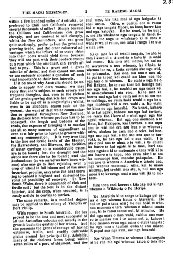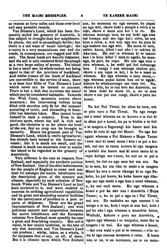 THE MAORI MESSENGER. 4 TE KARERE MAORI. so remote as forty miles and those over level and easy passable rounds. Van Diemen's Land, which has been fre- quently styled the granary of Australia, is less subject to drought than her neighbours. In places, the soil is exceedingly fertile; but there is a sad want of water carriage; the country is a very mountainous one and the roads, in consequence, are rugged and diffi- cult. The finest lands are heavily timbered. and the soil is only rendered fit for the plough at a very large outlay of money. The island is but a small one its whole extent not being equal to that of the province of Auckland. And whilst almost all the lands of Auckland are convertible to the service of man, there is at least four fifths of Van Diemen's Land which never can be turned to account. There is but a belt that traverses the island which may be considered habitable. Towards the West Coast, mountain towers above mountain; the intervening valleys being filled with marshes only fit for the summer pasturing of cattle, and abounding in beau- tiful but desolate lakes. Man cannot locate himself in such a country. Even in the choicest spots, where the soil is rich and good. the situation is so far above the level of the sea, that no crop can be brought to maturity. Hence the greatest part of Van Diemen's Land, which is really agricultural, has already been turned to the farmers ac- count; but it is much loo small, and the ( climate is much too uncertain ever to entitle the island to be regarded as the granary o Australasia. Very different is the case as respects New Zealand, and especially the northern portion of New Zealand. One of the chief inducement for the people of England to come and cast their lot amongst the native inhabitants wa the description given of the country am climate, especially by such colonists of New South Wales and Van Diemen's Land as ha been attracted to it, and were enabled to contrast its sinking agricultural capabilities and its great and abounding natural facilities for the conveyance of produce to a port or ports of shipment. These are the grand characteristics of New Zealand; and with judicious concert arid cooperation between the native inhabitants and the European colonists New Zealand must speedily become a great and flourishing country. Her soil equal, in her choice localities, to the best of any that Australia and Van Diemen's Land can produce; whilst, taken as a whole, it far surpasses that of any, or all, of then But it is climate upon which New Zealand ana, he momona no nga oneone, he papai no nga witi. ekore hoki e pangia a reira e te raki, ekore e mate ana kai i te ra. He whenua maunga tera, he nui hoki nga awa hei hoenga mai mo nga kai; otira, he ara kino o reira, a, nui noa nga utu ka puta ki nga makete mo nga witi. He motu iti tera awhio katoa, kihai i nui ake i te takiwa ki Akarana. He nui te whenua ki te takoto kau i te kino kihai: i taea te ngaki he mau- nga, he pari, he repo. He nui nga roto o tera whenua, a, he wahi pai hei nohoanga kau. I runga i aua maunga ahakoa pai, ekore e ata tupu te kai, i te he o tenei tu whenua. Ko nga whenua o taua motu— nga whenua papai katoa kua oti te ngaki, kahore be whakaaronga mo taua iwi. Na, ekore e kiia, ko te rua tera mo Atareiria, no te mea hoki he motu iti, a, no te mea ekore e ata pai ona rangi, ekore e pera me konei. Na kei Nui Tireni, he ahua ke tana, ara te pito raro o Nui Tireni. Na nga rongo nui o tenei whenua na te korero o te tini ki te ahua pai o konei, ka pa te hiahia o te tini o te tangata o Ingarangi kia haere mai kia noho ki roto ki nga iwi Maori. No nga kai ngaki whenua o Poi Hakena o Hopa Taone i rere mai ki tenei motu i kite i te pai o ko- nei, nui atu to ratou korero ki nga tangata o tawhiti kia haere mai ki tenei motu ki te rapu kainga mo ratou, he nui no te pai o konei, he tini no nga mea hei uta atu. Na ki te mea, ka ata tika te mahi o te tangata Maori ka uru o ratou tikanga ki to nga Pa- keha, ka pai haere, ka kake haere nga tika" nga mo nga mahi o nga hua o tenei whenua, a, ka nui enei motu. Ko nga whenua o konei e pai ke ake ana i Atareiria i Hopa Taone; a, ko te pai o nga ra i Nui Tireni nui atu. He makuku no nga oneone i te uanga o te ua, koia i tupu ai ana kai, koia i pai ke ake i nga whenua o Atareiria katoa Waihoki, kahore e pera me Atareiria, e ngaro nga whenua i te waipuke, mate iho te tangata i te wai. Ko nga whenua o konei, —kei ona wahi e pai ai te oneone,—rite to- nu ki nga oneone momona o reira. E. hono ana te ua, te ua matamua, me te ua mata-