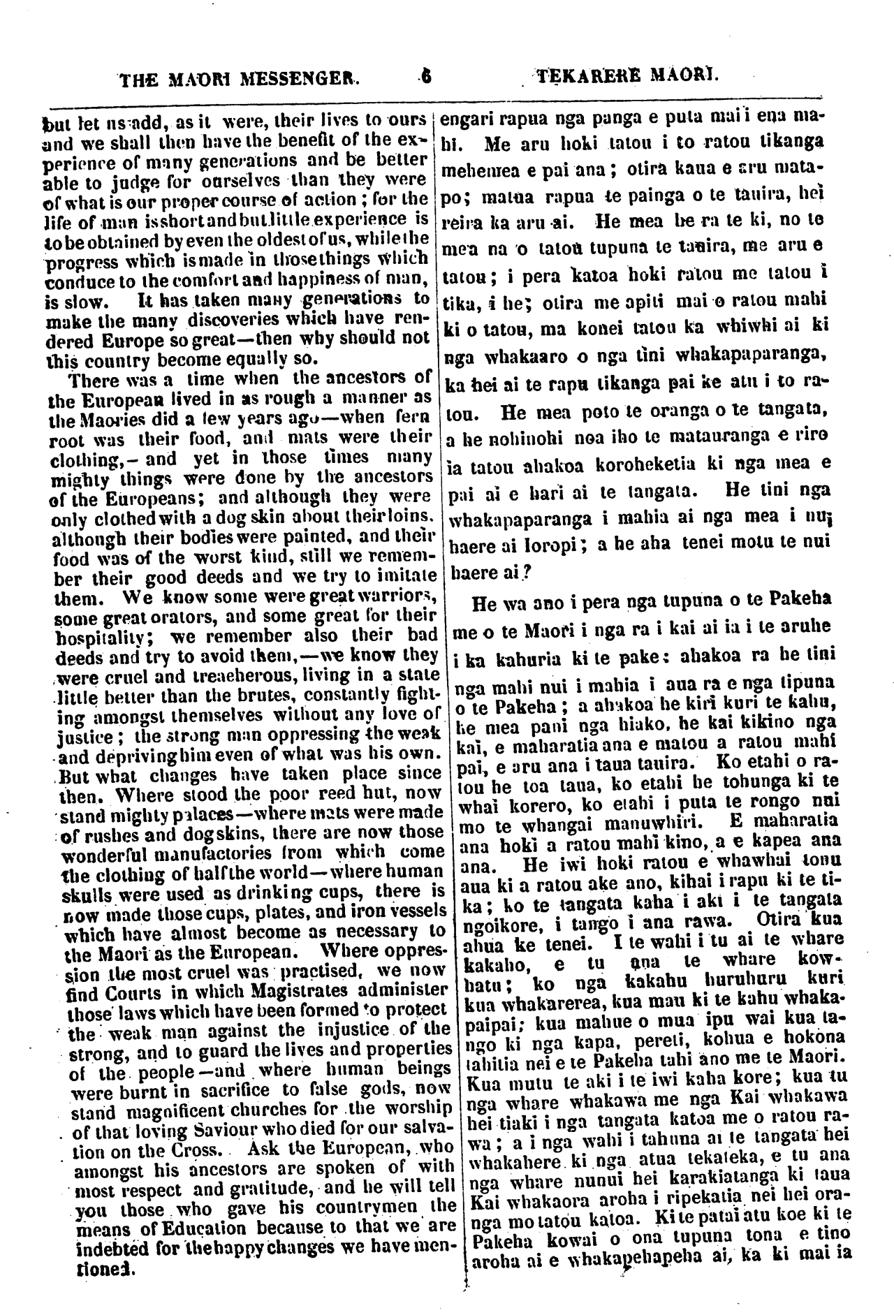 THE MAORI MESSENGER. but let us add, as it were, their lives to ours find we shall then have the benefit of the ex-- perience of many generations and be better able to judge for ourselves than they were of what is our proper course of action; for the life of man is short and but little experience is to be obtained by even the oldest of us. whi Ie the progress which is made in those things which conduce to the comfort and happiness of man, is slow. It has taken many generations to make the many discoveries which have ren- dered Europe so great then why should not this country become equally so. There was a lime when the ancestors of the European lived in as rough a manner as the Maories did a few years ago—when fern root was their food, and mats were their clothing,- and yet in those tunes many mighty things were done by the ancestors of the Europeans; and although they were only clothed with a dog skin about their loins. although their bodies were painted, and their food was of the worst kind, still we remem- ber their good deeds and we try to imitate them. We know some were great warriors, some great orators, and some great for their hospitality; we remember also their bad deeds and try to avoid them,—we know they , were cruel and treacherous, living in a stale little better than the brutes, constantly fight- ing amongst themselves without any love of justice; the strong man oppressing the weak and depriving him even of what was his own. But what changes have taken place since then. Where stood their poor reed hut, now stand mighty palaces—where mats were made of rushes and dog skins, there are now those wonderful manufactories from which come the clothing of half their world—where human skulls were used as drinking cups, there is now made those cups, plates, and iron vessels which have almost become as necessary to the Maori as the European. Where oppres- sion the most cruel was practised, we now find Courts in which Magistrates administer those laws which have been formed to protect the weak man against the injustice of the strong, and to guard their lives and properties of the people—and where human beings were burnt in sacrifice to false gods, now stand magnificent churches for the worship of that loving Saviour who died for our salva- . tion on the Cross. Ask the European, who amongst his ancestors are spoken of with most respect and gratitude, and he will tell you those who gave his countrymen their means of Education because to that we are indebted for the happy changes we have men- tioned. | engari rapua nga panga e puta mai i ena ma- hi. Me aru hoki tatou i to ra tou tikanga mehemea e pai ana; otira kaua e aru mata- po; matua rapua te painga o te tauira, hei reira ka aru ai. He mea Ire ra te ki, no te mea na o tatou tupuna te tauira, ma aru e tatou; i pera katoa hoki ratou me tatou i tika, i he; otira me apiti mai o ratou mahi ki o tatou, ma konei tatou ka whiwhi ai ki nga whakaaro o nga tini whakapaparanga, ka hei ai te rapu tikanga pai ke atu i to ra- tou. He mea polo te oranga o te tangata, a he nohinohi noa iho te matauranga e riro ia tatou ahakoa koroheketia ki nga mea e pai ai e hari ai te tangata. He tini nga whakapaparanga i mahia ai nga mea i nui haere ai loropi; a he aha tenei motu te nui haere ai.? He wa ano i pera nga tupuna o te Pakeha me o te Maori i nga ra i kai ai ia i te aruhe i ka kahuria ki te pake: ahakoa ra he tini nga mahi nui i mahia i aua ra e nga tipuna o te Pakeha; a ahakoa he kiri kuri te kahu, he mea pani nga hiako, he kai kikino nga kai, e maharatia ana e matou a ratou mahi pai, e aru ana i taua tauira. Ko etahi o ra- tou he toa taua, ko etahi he tohunga ki te whai korero, ko etahi i puta te rongo utu mo te whangai manuwhiri. E maharatia ana hoki a ratou mahi kino, a e kapea ana ana. He iwi hoki ratou e whawhai tonu aua ki a ratou ake ano, kihai i rapu ki te ti- ka; ko te tangata kaha i aki i te tangata ngoikore. i tango i ana rawa. Otira kua ahua ke tenei. I te wahi i tu ai te whare kakaho, e tu ana te whare ko- hatu; ko nga kakahu huruhuru kuri kua whakarerea, kua mau ki te kahu whaka - paipai; kua mahue o mua ipu wai kua ta- ngo ki nga hapa, pereti, kohua e hokona tahitia nei e te Pakeha tahi ano me te Maori. Kua mutu te aki i te iwi kaha kore; kua tu nga whare whakawa me nga Kai whakawa hei tiaki i nga tangata katoa me o ratou ra- wa; a i nga wahi i tahuna ai te tangata hei whakahaere ki nga atua tekateka, e tu ana nga whare nunui hei karakiatanga ki taua Kai whakaora aroha i ripekatia nei hei ora- nga mo tatou katoa. Ki te patai atu koe ki te Pakeha kowai o ona tupuna tona e tino aroha ai e whakapehapeha ai, ka ki mai ia