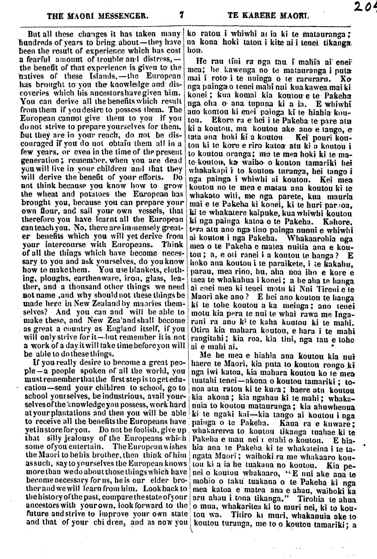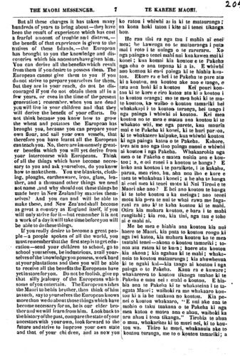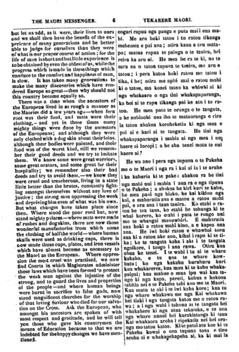 THE MAORI MESSENGER. TE KARERE MAORI. But all these changes it has taken many hundreds of years to bring. about— they have been the result of experience which has cost a fearful amount of trouble and distress, their benefit of Chat experience is given to their natives of these Islands.—the European has brought to you the knowledge and dis- coveries which his ancestors have given him. You can derive all their benefits which result from them if you desire to possess them. The European cannot give them to you if you do not strive to prepare yourselves for them, but they are in your reach, do not be dis- couraged if you do not obtain them all in a few years, or even in their time of the present generation;. remember. when you are dead you will live in your children and that they will derive the benefit of your efforts. Do not think because you know how to grow their wheat and potatoes the European has brought you, because you can prepare your own flour, and sail your own vessels, that therefore you have learnt all the European can teach you. No, there are. immensely great- er benefits which you will yet derive from your intercourse with Europeans, Think of all their things which have become neces- sary to you and ask yourselves, do you know how to make them. You use blankets, cloth- ing, ploughs, earthen ware, iron, glass, lea- ther, and a thousand other things we need not name, and why should not these things be made here in New Zealand by maories them- selves? And you can and will be able to make these, and New Zealand shall become as great a country as England itself, if you will only strive for it—but remember it is not a work of a day it will take time before you will be able to do these things. If you really desire to become a great peo- ple—a people spoken of all their world, you must rememher that the first step is to get edu- cation—send your children to school, go to school yourselves. be industrious, avail your- selves of their knowledge you possess, work hard at your plantations and then you will be able to receive all their benefits their Europeans have yet in store for you. Do not be foolish, give up that silly jealousy of the Europeans which some of you entertain. The European, wishes the Maori to be his brother, then think of him as such, say to yourselves their European knows more than we do about those things which have become necessary for us, he is our elder bro- ther and we will learn from him. Look back to Ihe history of their past, compare the state of your ancestors with your own, look forward to their future and strive to improve your own state and that of your children, and as now you ko ratou i whiwhi ai ia ki te matauranga; na kona hoki tatou i kite ai i tenei tikanga hou. He rau tini ra nga tau i mahia ai enei mea; he kawenga no te matauranga i puta: mai i roto i te nuinga o te raruraru. Ko nga painga o tenei mahi nui kua. kawea mai ki konei; kua komai kia koutou e te Pakeha nga. oha o ana. tupuna ki a ia. E whiwhi ano komou ki enei painga ki te hiahia kou- tou. Ekore ra e hei i te Pakeha te pare atu ki a koutou, ma koutou ake ano e tango, e tata ana Iroki ki a koutou Kei pouri kou- tou ki te karu e riro katoa atu ki u koutou i to koutou oranga; mo te mea hoki ki te ma- te koutou, ka waiho o koutou tamariki hei whakakapi i to koutou. turanga, hei tango i nga painga i whiwhi ai koutou. Kei mea koutou no te mea e matau ana koutou ki te whakato will, me nga parete, kua mauria mai e te Pakeha ki konei, ki te huri paraoa. ki te whakatere kaipuke, kua whiwhi koutou ki nga painga katoa» o te Pakeha. Kahore, tepa atu ano nga tino painga nunui e whiwhi ai koutou i nga Pakeha. Whakaarohia nga me» o te Pakeha e matea nuitia ana e kou- tou; a, e oti ranei I a koutou te hanga? E hoko ana koutou i te paraikete, i te kakahu, parau. mea rino. hu, aha noa iho e kore e taea te whakahua i konei; a he aha te hanga ai enei mea ki tenei motu ki Nui Tireni e te Maori ake ano? E hei ano koutou te hanga ki te tohe koutou a ka meinga; ano (enei motu kia pera te nui te whai rawa me Inga- rani ra ano ki te kaha koutou ki te mahi. Otira kia mahara koutou, e hara i te mahi rangitahi; kia roa, kia tini, nga tau e tohe ai e mahi ai.* Me he mea e hiahia ana koutou kia nui haere te Maori, kia puta to koutou rongo ki nga iwi katoa, kia mahara koutou ko (e mea tuatahi tenei—akona o koutou tamariki; to- noa atu ratou ki te kura; haere atu koutou kia akona; kia ngahau ki te mahi; whaka- nuia to koutou matauranga; kia ahuwhenua ki te ngaki kai—kia tango ai koutou i nga painga o te Pakeha. Kaua ra e kuware; whakarerea to koutou tikanga tuahae ki te Pakeha e mau nei i etahi o koutou. E hia- hia ana te Pakeha ki te whakateina i te ta- ngata Maori; waihoki ra me whakaaro kou- tou ki a ia he tuakana no koutou. Kia pe- nei o koutou whakaaro, "E nui ake ana te mohio o taku tuakana o te Pakeha ki nga mea katoa e matea ana e ahau. waihoki ka aru ahau i tona tikanga." Tirohia te ahua o mua, whakaritea ki to muri nei, ki to kou- tou wa. Titiro ki muri. whakanuia ake to i koutou turanga, me to o koutou tamariki; a