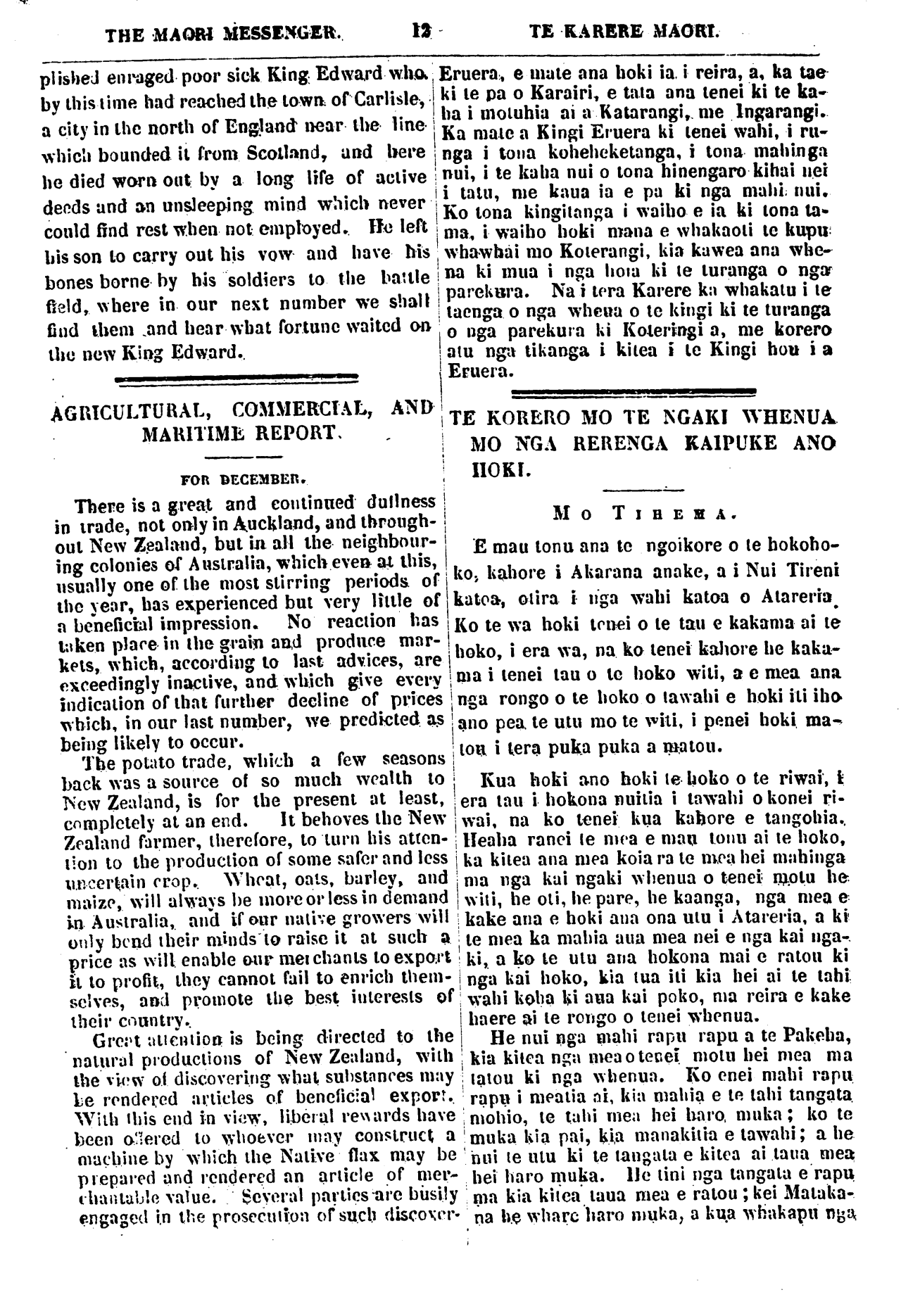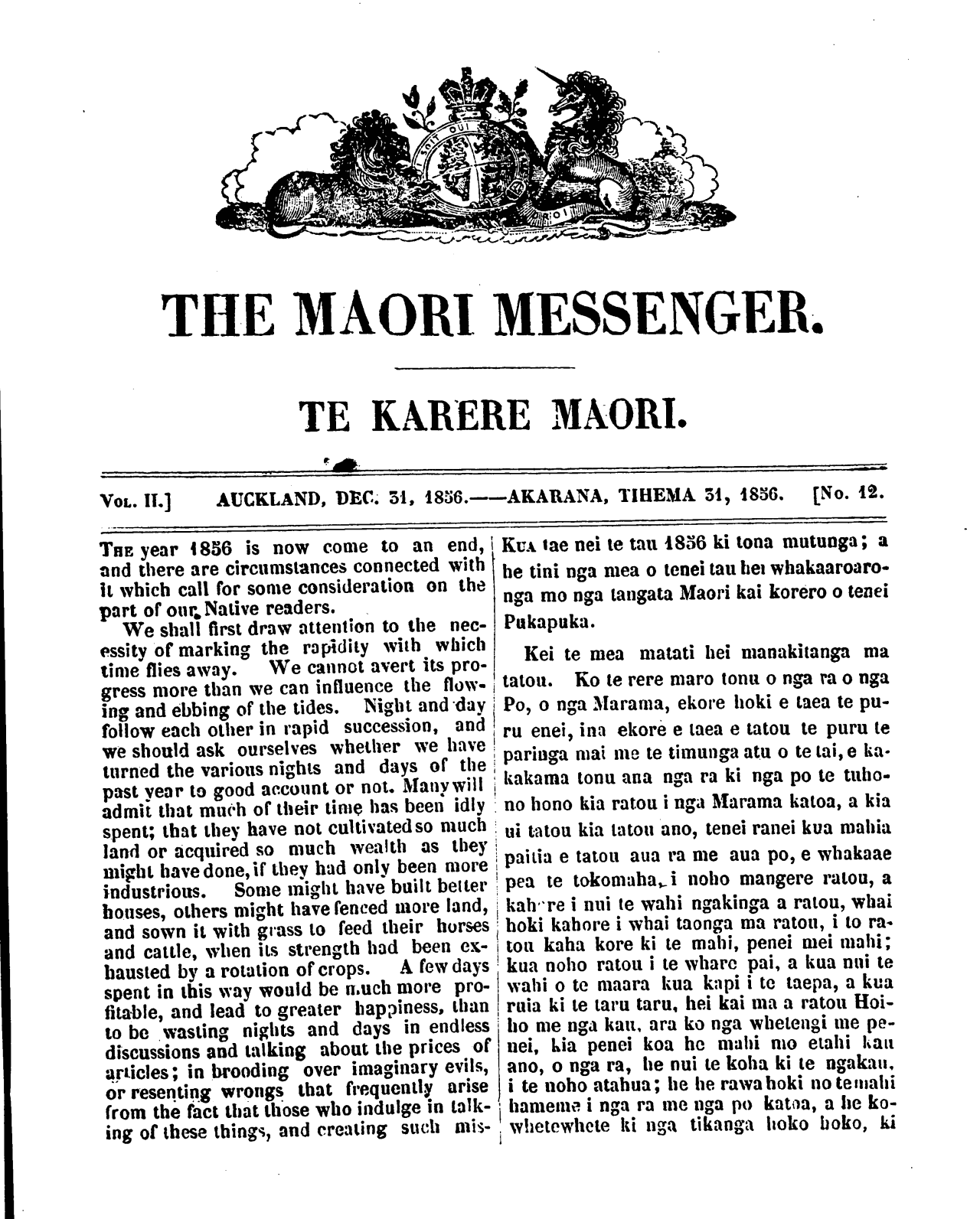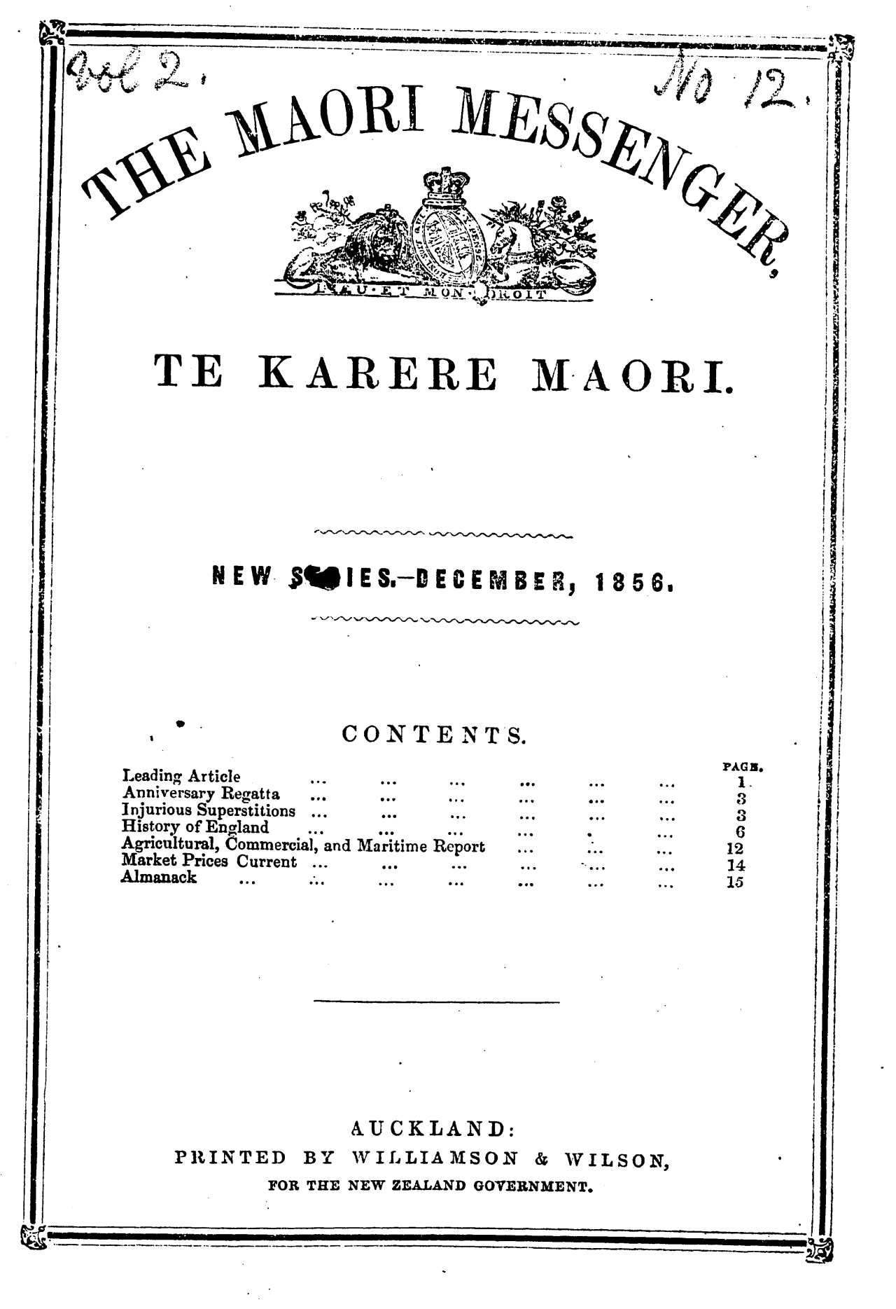 The Maori Messenger - Ko te Karere Maori 1855-1860: Volume 2, Number 12. 31 December 1856 |