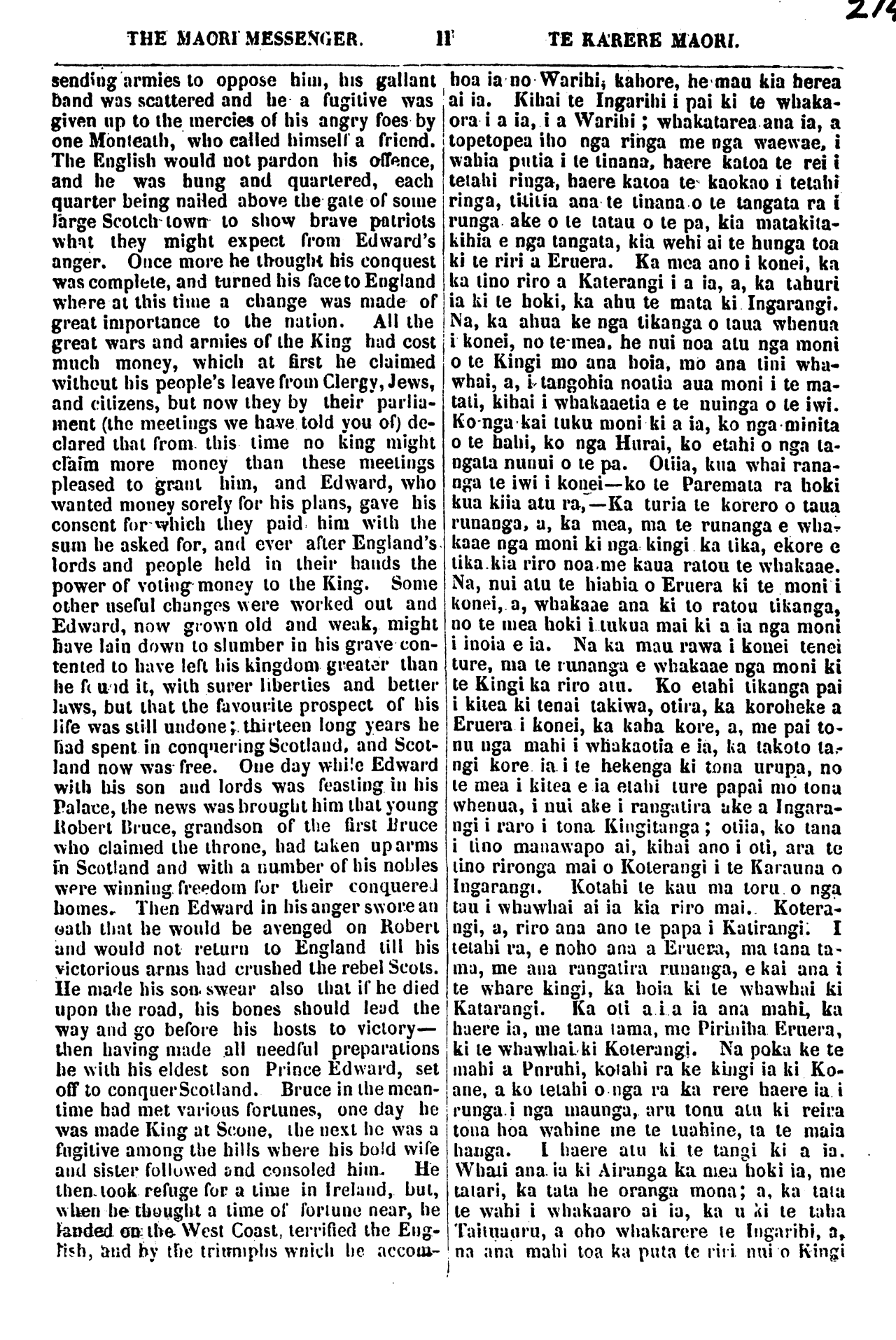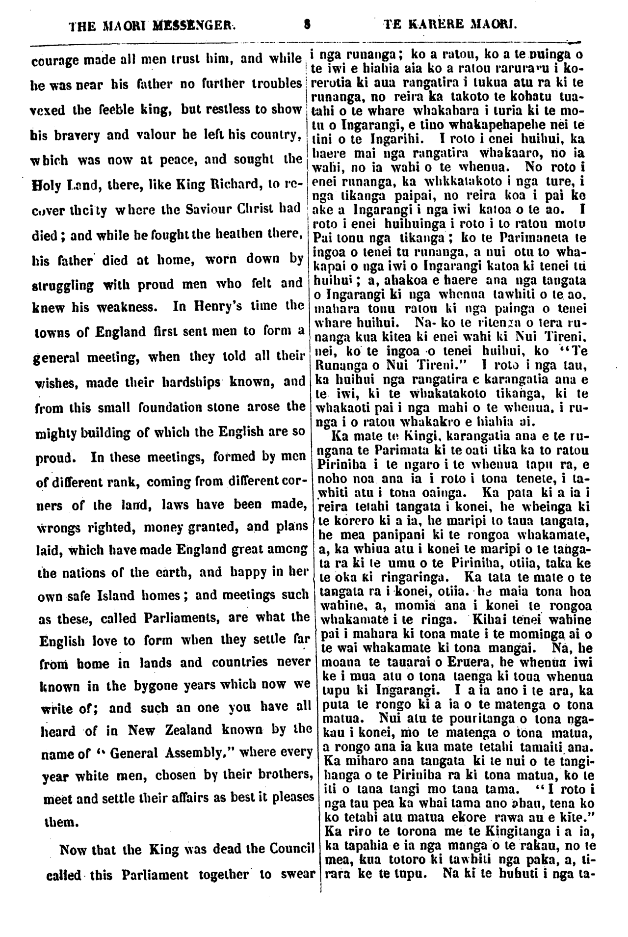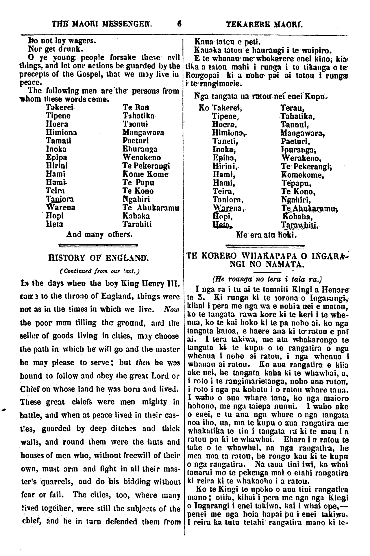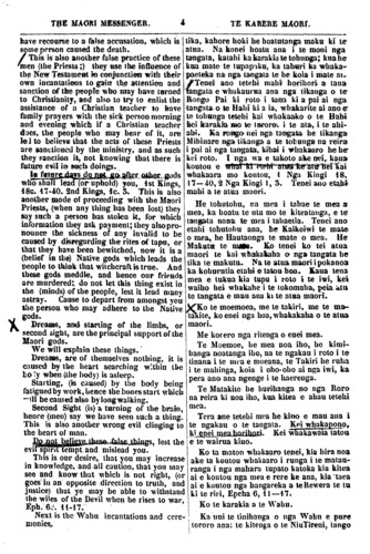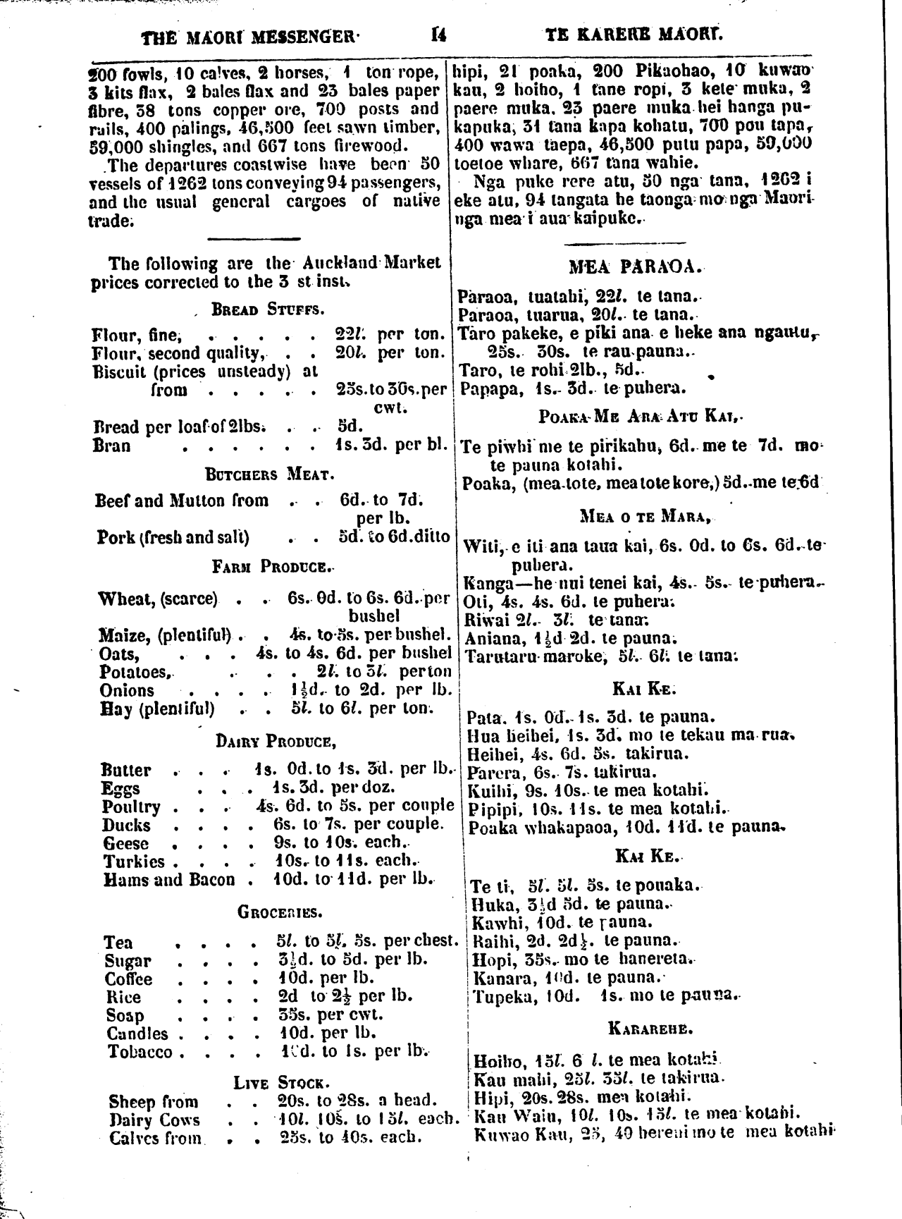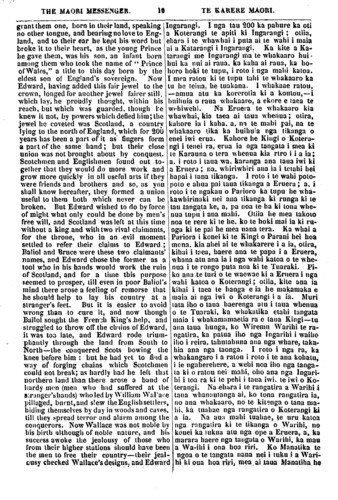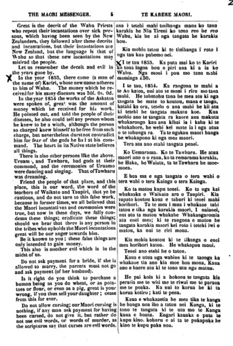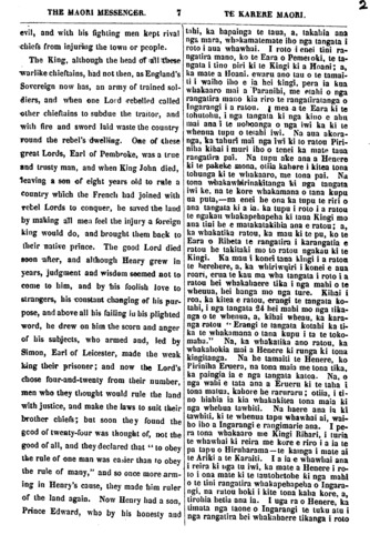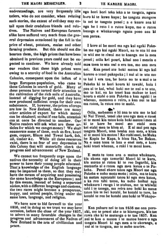 THE MAORl MESSENGER. 2 TE KARERE MAORI. understandings, are very frequently idle tatlers, who do not consider, when relating such stories, the extent of evil they may en-tail upon their credulous friends and rela-tives. The Natives and European farmers alike have suffered very much from the gen-eral depression occasioned by the fall in the price of wheat, potatoes, maize and oilier farming produce. But this should not dis-hearten them, the high prices that have been obtained in previous years could not be ex-pected to continue. We have already told our readers that these high prices were owing to a scarcity of food in the Australian Colonies, consequent upon the influx of a large European population, who came to these Colonies in search of gold. Many of these persons have turned their attention to the cultivation of the rich soils of Australia, instead of digging for gold, and they have now produced sufficient crops for their own subsistence. If, however, the prices of crops are low in New Zealand, there are many other articles of export for which money can be obtained; so that if one fails, attention can at once be directed to another. Our Native readers will ask what are these ar-ticles for which we can-get money? We shall enumerate some of them, such as flax, kauri gum, copper, Hinau and Towai bark, fish, oil, limber &c. While all these resources exist, there is no fear of any depression in this Colony that will materially check the progress and advancement of New Zealand. We cannot too frequently urge upon the natives the necessity of doing all in their power to have their young people educated. That a knowledge of the English language may be imparted to them, so that they may have the means of acquiring and possessing the same knowledge as the Europeans; and by this means, instead of being a separated nation, with a different language and customs, the two races might become a prosperous, happy, and united people, living under the same laws, language, and religion. We have now to bid farewell to the year i 856, and in doing so we trust we may have occasion, before the close of the year 1857, to advert to many favorable changes in the progress and advancement of the Natives of New Zealand in the arts of civilization and peace.nga hori hori teka teka a le tangata, ngutu huro ki le kawe kupu; be tangata mangere ia nei te tangata penei ; a e kuare ana ki nga he i roto i o ratou kupu, mo o ratou huanga e whakarongo ngutu pono aua ki aua parau. I kore ai be moni ma nga kai ngaki Pake-ha me nga kai ngaki Maori, na (e utu iti mo le witi me te riwai me te kaanga me ia mea penei ; otiia kei pouri, kihai ano i meatia e mau tonu te utu nui o era tau, mo ana mea nei. Kua penei atu hoki matou ki nga kai korero o tenei pukapuka ; i nui ai le utu mo le kai i era tau, he hono no te n mai o le Pakeha ki te keri koura ki tawahi, koia i pau ai le kai, whai hoki me te nui o te utu, mo le kai, na ko tenei kua mahue le keri koura a etahi o aua Pakeha a kua ngaki i le whenua, momona o reira, a kua nui le kai ma ratou, ia ratou ano le mahi Otiia, mehemea e iti ana te utu mo te kai ki Nui Tireni, tenei ake ano nga mea e ranei ai te moni kia tatou koia hoki matou i mea ai ki te kore he moni mo etahi mea kei etahi mea te kitea ai. E ui mai pea nga tangata Maori, tena heaha aua mea, e ki lea ai le moni kia matou ? Ko etahi enei. be Muka he Kapia he Kapa, h hinu Ika, he Rakau. Na e mau tonu le hua o enei mea, e kore hoki ienei whenua, e raki i te moni kore. E mata tu tonu ana o matou whakaaro, kia akona nga tamariki Maori ki le kura, kia matau ai ratou ki le reo Ingarihi, kia matauria ai e ratou nga mea katoa o te Pa-keha. Penei ekore tatou nga Maori me nga Pakeha e noho motu motu ; otira, ma te kura ka matau ngatatahi tatou ki nga mea katoa, a ka reo tahi tatou, ka noho huihui nga whakaaro i runga i te atahua, me te whiwhi tahi i le taonga, ma reira ano hoki ka mene tatou hie te iwi kotahi, he kotahi te ture, he kotahi te reo he kotahi ano hoki te Wakapo-no. Kua pahure nei le tau 1856 me ona poro-aki, me te penei ake o te hinengaro, kia tae rawa ake ki te mutunga o te tau 1857. Kua nui te koa o matou i te matou haere o nga tangata Maori ki nga mea o te akoranga, e nui ai le tangata, me te noho marire.