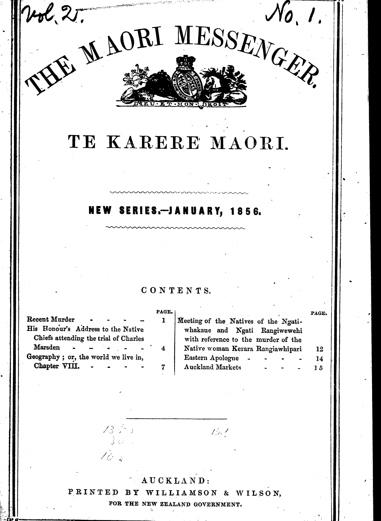 The Maori Messenger - Ko te Karere Maori 1855-1860: Volume 2, Number 1. January 1856 |