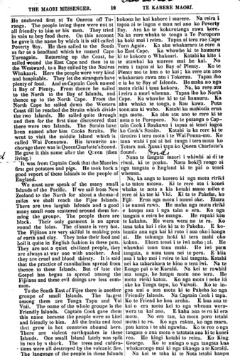THE MAORI MESSENGER. 10 TE KARERE MAORI. He anchored first at Te Oneroa off Tu- ranga. The people living there were not at all friendly to him or his men. They tried in vain to buy food there. On this account he gave it the name by which it is still called Poverty Bay. He then sailed to the South as far as a headland which he named Cape Turnagain. Returning up the Coast, he sailed around the East Cape and then in to the Westward, to a Bay called by the Natives Whakaari. Here the people were very kind and hospitable. They let the strangers have plenty of food. And so Captain Cook named it Bay of Plenty. From thence he sailed to the North to the Bay of Islands, and thence up to the North Cape. From the North Cape he sailed down the Western Coast till he reached the Straits which divide the two Islands. He sailed quite through and then for the first time discovered that there were two Islands. The Straits have been named after him Cooks Straits. He went to visit the middle Island which is called Wai Pounamu. His favourite an- chorage there was in Queen Charlotte's Sound. He gave it this name after the Queen (then living.) It was from Captain Cook that the Maories first got potatoes and pigs. He look back a good report of these Islands to the people of England. We must now speak of the many small Islands of the Pacific. If we sail from New Zealand to the North for about a thousand miles we shall reach the Fijee Islands. There are two largish Islands and a good many small ones scattered around them for- ming the groupe. The people there are black. Their only garment is an apron round the loins. The climate is very hot. The Fijiians are very skilful in making pots of earth and clay. They bake their food and boil it quite in English fashion in these pots. They are not a quiet civilized people, they are always at war one with another. And they are cruel and blood thirsty. It is said that the practice of cannibalism spread from thence to these Islands. But of late the Gospel has begun to spread among the Fijiians and these evil doings are less com- mon. To the South East of Fijee there is another groupe of small Islands. The largest among them are Tonga Tapu and Vai Vaii. The name of the whole groupe is the Friendly Islands. Captain Cook gave them this name because the people were so kind and friendly to him. All the fruits and food that grow in hot countries abound here. There are violent earthquakes in these Islands. One small Island lately was split in two by a shock. The trees and cultiva- tions were all destroyed by the volcanic fire. The language of the people in those Islands hokona he kai kahore i marere. Na reira i tapaa ai te ingoa e mau nei ano ko Poverty Bay. Ara ko te kokorutanga rawa kore, Na ka rere whaka te tonga a Te Poroporo ka hoki mai i reira. Tapaa ai tera rae Cape Turn Again. Ka ahu whakararo te rere a ko East Cape. Ka whawhe ki te hauauru ki te kokoru o Whakaari. Katahi ka kite i te atawhai ka marere mai he kai. No reira i tapaa ai ko Bay of Plenty. Ko te. Plenty mo te hua o te kai; ka rere atu ano. whakararo rawa atu i Tokerau. Tapaa iho e ia ko te Bay of Islands. He maha no nga motu ririki i taua kokoru. Na, ka rere atu i reira a muri whenua. Tapaa iho ko North Cape. Ka whawhe ki te tai hauauru. Ka ahu whaka te tonga, a Rau kawa. Puta tonu atu ki waho. Katahi ka mohiotia erua nga motu. Ka ahu atu ano te rere ki te nota a te Poroporo. No te putanga o Cap- tain Cook i Raukawa i tapaa ai tenei ingoa ko Cook's Straits. Katahi ia ka rere ki te tirotiro i tera motu i te Waipounamu. Ko tana wahi i pai ai hei tunga i tera motu. ko Totara nui. Nana i tapa ko Queen Charlotte's Sound. Nana te tangata maori i whiwhi ai ki te riwai. ki te poaka. Nana hoki i rongo ai nga tangata o England ki te pai o tenei whenua. Na, ka anga te korero ki nga motu ririki o to tatou moana. Ki te rere atu i konei whaka te nota a kia kotahi mano miles e rere ai ka tae ki Viti. Ki ta te Pakeha, ko Fijii. Erua nga motu i nunui ake. Ehara i te nunui rawa. He maha nga motu ririki e haupu aua i nga taha o era. Ko nga tangata o reira he mangu. He rapaki kau te kakahu. He wera wera no te ra. Ko tana taka kai i rite ki ta te Pakeha. E ko- huatia ana nga kai ki roto i ana oko i hanga ai. He tohunga hoki ki tera mahi oko kohua. Ehara tenei i te iwi noho ai. He whawhai tonu tana mahi. He iwi patu tangata, a mau tonu nei te pera. E kiia ana i take mai i reira te kai tangata. Katahi nei ka taharahara te kino o tera iwi. Na te Rongo pai o te Karaiti. Na kei te rawhiti ma tonga, he haupu motu ano tera. He motu ririki katoa. Ko nga motu i neke iti ake ko Tonga tapu, ko Vaivaii. Ko te in- goa nui o aua motu ki te Pakeha ko nga Friendly Islands. Na Captain Cook i tapa. Ko te Friend he hoa aroha. E hua ana te kai o era motu kei to nga whenua wera- wera tu kai ano. E kaha ana te ru ki era motu. No era tau, ka motu poro tetahi motu i te ru. Ko nga rakau, ko nga mara, pau katoa i te ahi ngawha. Ko te reo o nga tangata o aua motu e tatatata ana ki to konei reo. Ue kingi kotahi to reira. Ko King George. Ko te nuinga o nga tangata kua whakarongo mai ki nga tikanga a te Karaiti. Na kei te taha ki te Nota tetahi haupu