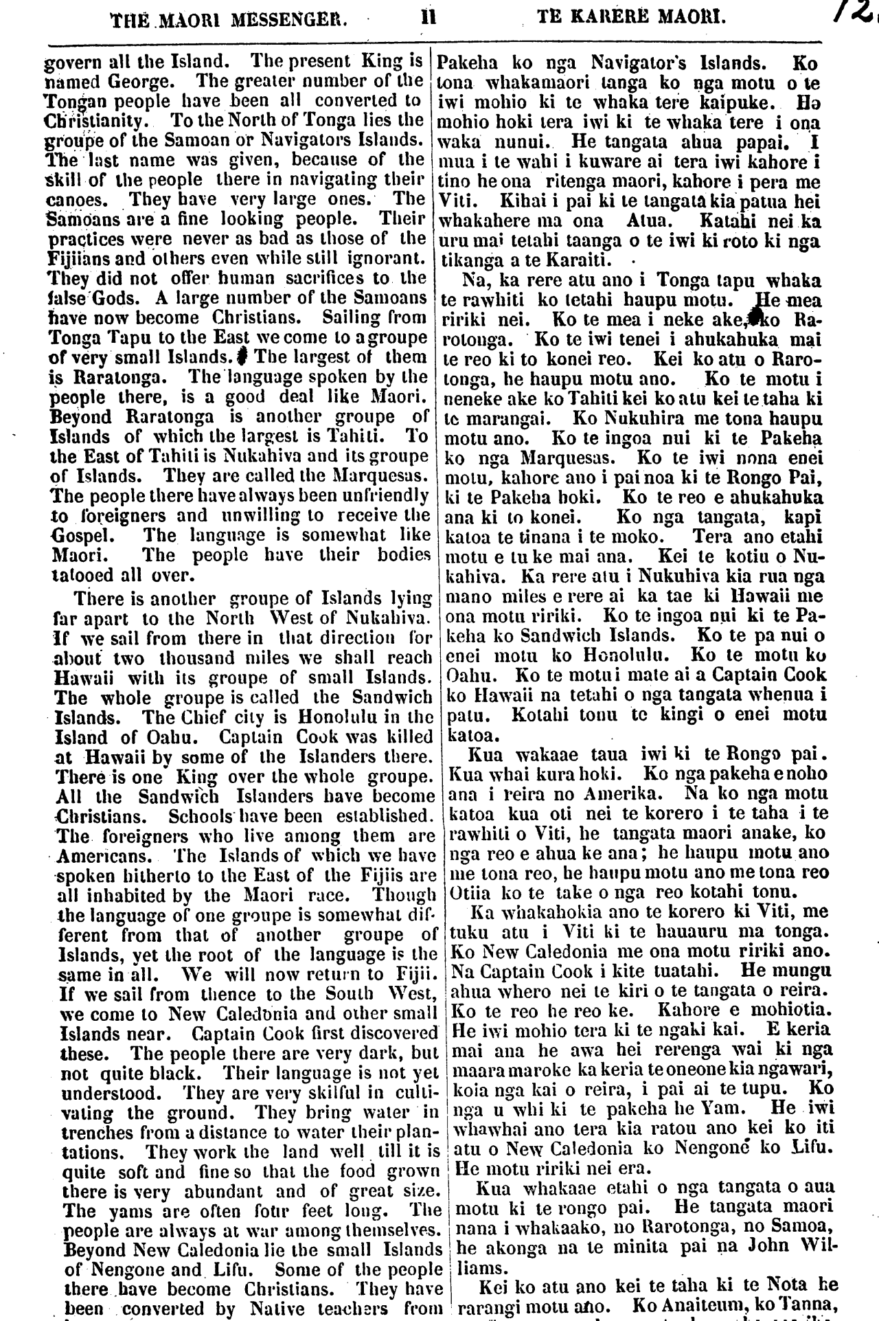THIS MAORI MESSENGER. 11 TE KARERE MAORI. govern all the Island. The present King is named George. The greater number of the Tongan people have been all convened to Ctiristianity. To the North of Tonga lies the groupe of the Samoan or Navigators Islands. The last name was given, because of the skill of the people there in navigating their canoes. They have very large ones. The Samoans are a fine looking people. Their practices were never as bad as those of the Fijiians and others even while still ignorant. They did not offer human sacrifices to the false Gods. A large number of the Samoans have now become Christians. Sailing from Tonga Tapu to the East we come to a groupe of very small Islands. The largest of them is Raratonga. The language spoken by the people there, is a good deal like Maori. Beyond Raratonga is another groupe of Islands of which the largest is Tahiti. To the East of Tahiti is Nukahiva and its groupe of Islands. They are called the Marquesas. The people there have always been unfriendly to foreigners and unwilling to receive the Gospel. The language is somewhat like Maori. The people have their bodies tatooed all over. There is another groupe of Islands lying far apart to the North West of Nukahiva. If we sail from there in that direction for about two thousand miles we shall reach Hawaii with its groupe of small Islands. The whole groupe is called the Sandwich Islands. The Chief city is Honolulu in the Island of Oahu. Captain Cook was killed at Hawaii by some of the Islanders there. There is one" King over the whole groupe. All the Sandwich Islanders have become Christians. Schools have been established. The foreigners who live among them are Americans. The Islands of which we have spoken hitherto to the East of the Fijiis are all inhabited by the Maori race. Though the language of one groupe is somewhat dif- ferent from that of another groupe of Islands, yet the root of the language is the same in all. We will now return to Fijii. If we sail from thence to the South West, we come to New Caledonia and other small Islands near. Captain Cook first discovered these. The people there are very dark, but not quite black. Their language is not yet understood. They are very skilful in culti- vating the ground. They bring water in trenches from a distance to water their plan- tations. They work the land well till it is quite soft and fine so that the food grown there is very abundant and of great size. The yams are often four feet long. The people are always at war among themselves. Beyond New Caledonia lie the small Islands of Nengone and Lifu. Some of the people there, have become Christians. They have been converted by Native teachers from Pakeha ko nga Navigator's Islands. Ko tona whakamaori tanga ko nga motu o te iwi mohio ki te whaka tere kaipuke. He mohio hoki tera iwi ki te whaka tere i ona waka nunui. He tangata ahua papai. I mua i te wahi i kuware ai tera iwi kahore i tino he ona ritenga maori, kahore i pera me Viti. Kihai i pai ki te tangata kia patua hei whakahere ma ona Atua. Katahi nei ka uru mai tetahi taanga o te iwi ki roto ki nga tikanga a te Karaiti. Na, ka rere atu ano i Tonga tapu whaka te rawhiti ko tetahi haupu motu. He mea ririki nei. Ko te mea i neke ake, ko Ra- rotonga. Ko te iwi tenei i ahukahuka mai te reo ki to konei reo. Kei ko atu o Raro- tonga, he haupu motu ano. Ko te motu i neneke ake ko Tahiti kei ko atu kei te taha ki te marangai. Ko Nukuhira me tona haupu motu ano. Ko te ingoa nui ki te Pakeha ko nga Marquesas. Ko te iwi nona enei motu, kahore ano i pai noa ki te Rongo Pai, ki te Pakeha hoki. Ko te reo e ahukahuka ana ki to konei. Ko nga tangata, kapi katoa te tinana i te moko. Tera ano etahi motu e tu ke mai ana. Kei te kotiu o Nu- kahiva. Ka rere atu i Nukuhiva kia ruanga mano miles e rere ai ka tae ki Hawaii me ona motu ririki. Ko te ingoa nui ki te Pa- keha ko Sandwich Islands. Ko te pa nui o enei motu ko Honolulu. Ko te motu ko Oahu. Ko te momi male ai a Captain Cook ko Hawaii na tetahi o nga tangata whenua i patu. Kotahi tonu te kingi o enei motu katoa. Kua wakaae taua iwi ki te Rongo pai. Kua whai kura hoki. Ko nga pakeha e noho ana i reira no Amerika. Na ko nga motu katoa kua oti nei te korero i te taha i te rawhiti o Viti, he tangata maori anake, ko nga reo e ahua ke ana; he haupu motu ano me tona reo, he haupu motu ano me tona reo Otiia ko te take o nga reo kotahi tonu. Ka whakahokia ano te korero ki Viti, me tuku atu i Viti ki te hauauru ma tonga. Ko New Caledonia me ona motu ririki ano. Na Captain Cook i kite tuatahi. He munga ahua whero nei te kiri o te tangata o reira. Ko te reo he reo ke. Kahore e mohiotia. He iwi mohio tera ki te ngaki kai. E keria mai ana he awa hei rerenga wai ki nga maara maroke ka keria te oneone kia ngawari, koia nga kai o reira, i pai ai te tupu. Ko nga u whi ki te pakeha he Yam. He iwi whawhai ano tera kia ratou ano kei ko iti atu o New Caledonia ko Nengone ko Lifu. He motu ririki nei era. Kua whakaae etahi o nga tangata o aua motu ki te rongo pai. He tangata maori nana i whakaako, no Rarotonga, no Samoa, he akonga na te minita pai na John Wil- liams. Kei ko atu ano kei te taha ki te Nota he rarangi motu ano. Ko Anaiteum, ko Tanna,