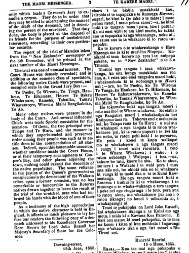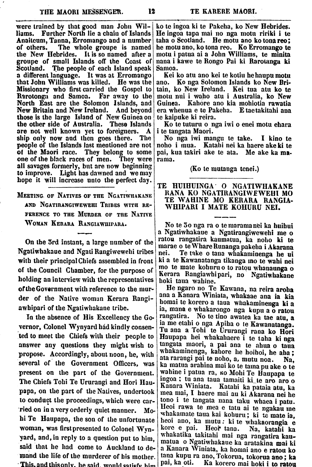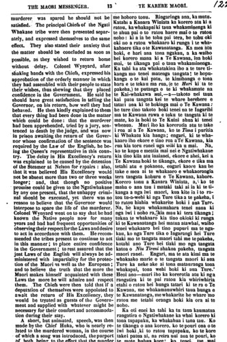 THE MAORI MESSENGER. 12 TE KARERE MAORI. were trained by that good man John Wil- liams. Further North lie a chain of Islands Anaiteum, Tanna, Erromango and a number of others. The whole groupe is named the New Hebrides. It is so named after a groupe of small Islands off the Coast of Scotland. The people of each Island speak a different language. It was at Erromango that John Williams was killed. He was the Missionary who first carried the Gospel to Rarotonga and Samoa. Far away to the North East are the Solomon Islands, and New Britain and New Ireland. And beyond those is the large Island of New Guinea on the other side of Australia. These Islands are not well known yet to foreigners. A ship only now and then goes there. The people of the Islands last mentioned are not of the Maori race. They belong to some one of the black races of men. They were all savages formerly, but are now beginning to improve. Light has dawned and we may hope it will increase unto the perfect day. MEETING OF NATIVES OF THE NGATIWHAKAUE AND NGATIRANGIWEWEHI TRIBES WITH RE- FERENCE TO THE MURDER OF THE NATIVE WOMAN KERARA RANGIAWHIPARA. On the 3rd instant, a large number of the Ngatiwhakaue and Ngati Rangiwewehi tribes with their principal Chiefs assembled in front of the Council Chamber, for the purpose of holding an interview with the representatives of the Government with reference to the mur- der of the Native woman Kerara Rangi- awhipari of the Ngatiwhakaue tribe. In the absence of His Excellency the Go- vernor. Colonel Wynyard had kindly consen- ted to meet the Chiefs with their people to answer any questions they might wish to propose. Accordingly, about noon, he, with several of the Government Officers, was present on the part of the Government. The Chiefs Tohi Te Ururangi and Hori Hau- papa, on the part of the Natives, undertook to conduct the proceedings, which were car- ried on in a very orderly quiet manner. Mo- hi Te Haupapa, the son of the unfortunate woman, was first presented to Colonel Wyn- yard, and, in reply to a question put to him, said that he had come to Auckland to de- mand the life of the murderer of his mother. This. and this only he said would satisfy him ko te ingoa ki te Pakeha, ko New Hebrides. He ingoa tapa mai no nga motu ririki i te taha o Scotland. He motu ano ko tona reo; he motu ano, ko tona reo. Ko Erromango te motu i patua ai a John Williams, te minita nana i kawe te Rongo Pai ki Rarotonga ki Samoa. Kei ko atu ano kei te kotiu he haupu motu ano. Ko nga Solomon Islands ko New Bri- tain, ko New Ireland. Kei tua atu ko te motu nui i waho atu i Australia, ko New Guinea. Kahore ano kia mohiotia rawatia era whenua e te Pakeha. E tae takitahi ana te kaipuke ki reira. Ko te tuturu o nga iwi o enei motu ehara i te tangata Maori. No nga iwi mangu te take. I kino te noho i mua. Katahi nei ka haere ake ki te pai, kua takiri ake te ata. Me ake ka ma- rama. (Ko Ie mutanga tenei.) TE HUIHUINGA O NGATIWHAKAUE KANA KO NGATIRANGIWEWEHI MO TE WAHINE MO KERARA RANGIA- WHIPARI I MATE KOHURU NEI. No te 3 o nga ra o te marama nei ka huihui a Ngatiwhakaue a Ngatirangiwewehi me o ratou rangatira kaumatua, ka noho ki te marae o te Whare Runanga pakeha i Akarana nei. Te take o tana whakaminenga he ui ki a te Kawanatanga tikanga mo te wahi nei mo te male kohuru o to ratou whanaunga o Kerara Rangiawhipari, no Ngatiwhakaue hoki taua wahine. He ngaro no Te Kawana, na reira aroha ana a Kanara Winiata, whakaae ana ia kia homai te korero a taua whakaminenga ki a ia, mana e whakarongo nga kupu a o ratou rangatira. No te tino awatea ka tae atu, a ia me etahi o nga Apiha o te Kawanatanga. Tu ana a Tohi te Ururangi rana ko Hori Haupapa hei whakahaere i te taha ki nga tangata maori, a pai ana te ahua o taua whakaminenga, kahore he hoihoi, he aha; ata rarangi pai te noho, a, mutu noa. Na, ka matua arahina mai ko te tama pu ake o te wahine i patua ra, KO Mohi Te Haupapa te ingoa; tu ana taua tamaiti ki te aro aro o Kanara Winiata. Katahi ka pataia atu, ka mea mai, I haere mai au ki Akarana nei he tono i te tangata nana taku whaea i patu. Heoi rawa te mea e tatu ai te ngakau me whakamate taua kai kohuru; ki te mate ia, heoi ano, ka mutu: ki te whakaorangia e kore e pai. Heoi tana. Na, katahi ka whakatika takitahi mai nga rangatira kau- matua o Ngatiwhakaue ka aratakina mai ki a Kanara Winiata, ka homai ano e ratou ko tana kupu ra ano, Tokorua, tokorua ano; ka pai. ka oti. Ka korero mai hoki i to ratou,