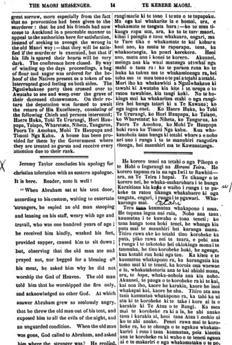 THE MAORI MESSENGER. 14 TE KARERE MAORI. great sorrow, more especially from the fact that no provocation had been given to the murderer: that be and bis friends had now come to Auckland in a peaceable manner to appeal to the authorities here for satisfaction, instead of seeking to avenge the wrong in ihe old Maori way: that they will be satis- fied if the murderer is executed, but that if his life is spared their hearts will be very dark. The conference here closed. By way of winding up the days proceedings, a bag of flour and sugar was ordered for the be- hoof of the Natives present as a token of un- interrupted good feeling on both sides. The Ngatiwhakaue party then crossed over to Awataha to see and weep over the grave of their deceased clanswoman. On their re- turn the deputation was formed to await the return of His Excellency, consisting of the following Chiefs and persons interested; Haere Huka, Tohi Te Ururangi, Hori Hau- papa, Taiapo, Wharetutu, Niheta, Tangaroa, Paora Te Amohau, Mohi Te Haupapa and Timoti Nga Kahu. A house has been pro- vided for them by the Government where they are treated as guests and receive every attention due to their rank. Jeremy Taylor concludes his apology for christian toleration with an eastern apologue. It is here. Reader, note it well! " When Abraham sat at his lent door, according to his custom, waiting to entertain "strangers, be espied an old man stooping and leaning on his staff, weary with age and travail, who was one hundred years of age; he received him kindly, washed his feet, provided supper, caused him to sit down; but, observing that the old man ate and prayed not, nor begged for a blessing on his meat, he asked him why he did not worship the God of Heaven. The old man told him that he worshipped the fire only, and acknowledged no other God. At which answer Abraham grew so zealously angry, that he threw the old man out of his lent, and exposed him to all the evils of the night, and an unguarded condition. When the old man was gone, God called to Abraham, and asked him where the stranger was? He replied rangi marie ki te tono i te utu o te tupapaku. Ma nga kai whakarite ia e homai, ara, e whakamate te tangata hara;—ko to mua ti- kanga rapu utu, ara, ko to te ture ma o ri, kihai i paingia e tona whakaaro, engari, ma te Ture tika e whakamate te kai kohuru heoi ano, ka mutu te rapurapu, tena, ka whakaorangia, ka pouri kerekere. Heoi ano, mutu ana i konei te korero. Akuanei, meinga ana kia whai mutunga atawhai ngu mahi o taua ra: ko te paraoa raua ko te huka ka tukua ma te whakaminenga ra, hei tohu mo te mau tonu o te pai a tetahi a tetahi. Muri iho ka whakawhiti a Ngatiwhakaue ki tawahi ki Awataha kia kite i te urupa o to ratou tuwahine, kia tangi koki. No te ho- kinga mai ka whakaritea etahi o nga rangi- tira hei hunga tatari ki a Te Kawana; ko nga ingoa enei. Ko Haere Huka, ko Tohi Te Ururangi, ko Hori Haupapa, ko Taiapo, ko Wharetutu ko Niheta, ko Tangaroa, ko Paora Te Amohau, ko Mohi Te Haupapa hoki raua ko Timoti Nga kahu. Kua wha- kanohoia tana hunga ki tetahi whare a e noho nei ano i runga i to te manuhiri rangatira ritenga, hei manuhiri ma te Kawanatanga. He korero tenei na tetahi o nga Pihopa o te Hahi o Ingarangi na Heremi Teira. He korero tupuna ra ia na nga Iwi i te Rawhiti— ara, na Te Teira i hapai. Te tikanga o te korero nei, he whaka-maharahara i ie hunga Karaitiana kia kana e waiho i runga i te pa- keke ta ratou ukanga whakahaere ki nga tangata, engari, i runga i te ngawari. Wha- karongo mai. Tera taua kaumatua whakapono i mua. He tupuna ingoa nui raia, Noho ana taua kaumatua i te kuwaha o tona teneti; ko tana hanga tonu hoki tenei, he whanga kia puta mai te manuhiri hei karanga mana. Titiro rawa ake ko tetahi tino koroheke ka puta, piko rawa nei te tuara, e pehi ana i runga i te tokotoko hei okiokinga mona i te taumaha, he tino koroheke hoki, he ngenge. kua kotahi rau hoki nga tau. Ka kitea e te kaumatua whakapono ra, ka karangatia kia tomo mai ki te teneti, ka horoia ona waewae e ia, whakatakotoria ana te kai ahiahi mana, ara, te hapa, whaka-nohoia ana kia noho. Akuanei, te panga o te koroheke ra ki te kai, kai noa iho, kaore he karakia, kaore he inoi whakapai kai, kaore he aha. Titiro atu ana taua kaumatua whakapono ra, ka tahi ka ui atu ki te koroheke ki te take i kore ai ia e karakia ki Te Atua o te Rangi. Ka mea mai te koroheke ra ki a ia, he ahi anake tana i karakia ai, heoi tana Atua i mohio ai ko te ahi anake. Penei rawa mai te koro- heke ra, ko te ohonga o te ngakau whakata- kariri i roto i taua kaumatua, peia kinotia ana te koroheke ra ki waho o te teneti ngaua ai e te makariri e nga whakamataku o te po