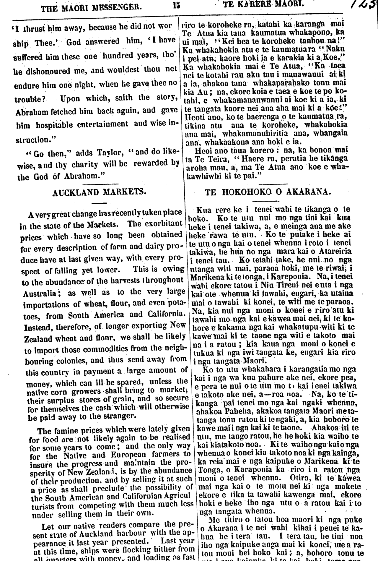 THIS MAORl MESSENGER. TE KARERE MAORI. I thrust him away, because be did not wor- ship Thee.' God answered him,' I have suffered him these one hundred years, tho' he dishonoured me, and wouldest thou not endure him one night, when he gave thee no trouble? Upon which, saith the story, Abraham fetched him back again, and gave him hospitable entertainment and wise in- struction." " Go then," adds Taylor, " and do like- wise, and thy charity will be rewarded by the God of Abraham." AUCKLAND MARKETS. A very great change has recently taken place in the state of the Markets. The exorbitant prices which have so long been obtained for every description of farm and dairy pro- duce have at last given way, with every pro- spect of falling yet lower. This is owing to the abundance of the harvests throughout Australia; as well as to the very large importations of wheat, flour, and even pota- toes, from South America and California. Instead, therefore, of longer exporting New Zealand wheat and flour, we shall be likely to import those commodities from the neigh- bouring colonies, and thus send away from this country in payment a large amount of money, which can ill be spared, unless the native corn growers shall bring to market, their surplus stores of grain, and so secure for themselves the cash which will otherwise be paid away to the stranger. The famine prices which were lately given for food are not likely again to be realised for some years to come; and the only way for the Native and European farmers to insure the progress and maintain the pro- sperity of New Zealand, is by the abundance of their production, and by selling it at such a price as shall preclude the possibility of the South American and Californian Agricul- turists from competing with them much less under selling them in their own. Let our native readers compare the pre- sent state of Auckland harbour with the ap- pearance it last year presented. Last year at this lime, ships were flocking hither from all quarters with money and loading as fast riro te koroheke ra, katahi ka karanga mai Te Atua kia taua kaumatua whakapono, ka ui mai, " Kei hea te koroheke tauhou na!" Ka whakahokia atu e te kaumatua ra "Naku i pei atu, kaore hoki ia e karakia ki a Koe." Ka whakahokia mai e Te Atua, "Ka taea nei te kotahi rau aku tau i manawanui ai ki a ia, ahakoa tana whakaparahako tonu mai kia Au; na, ekore koia e taea e koe te po ko- tahi, e whakamanawanui ai koe ki a ia, ki te tangata kaore nei ana aha mai ki a koe!" Heoti ano, ko te haerenga o te kaumatua, ra, tikina atu ana te koroheke. whakahokia ana mai, whakamanuhiritia ana, whangaia ana, whakaakona ana hoki e ia. Heoi ano taua korero: na, ka honoa mai ta Te Teira, "Haere ra, peratia he tikanga a roha mau, a, ma Te Atua ano koe e wha- kawhiwhi ki te pai." TE HOKOHOKO O AKARANA. Kua rere ke i tenei wahi te tikanga o (e hoko. Ko te utu nui mo nga tini kai kua heke i tenei takiwa, a, e meinga ana me ake heke rawa te utu. Ko te putake i heke ai te utu o nga kai o tenei whenua i roto i tenei takiwa, he hua no nga mara kai o Atareiria i tenei tau. Ko tetahi take, he nui no nga manga witi mai, paraoa hoki, me te Tiwai, i Marikena ki te tonga. i Kareponia. Na, i tenei wahi ekore tatou i Niu Tireni nei e uta i nga kai ote whenua ki tawahi, engari, ka utaina mai o tawahi ki konei, te witi me te paraoa. Na, kia nui nga moni o konei e riro atu ki tawahi mo nga kai e kawea mai nei, ki te ka- hore e kakama nga kai whakatupu witi ki te kawe mai ki te taone nga witi e takoto mai na i a ratou; kia kaua nga moni o konei e tukua ki nga iwi tangata ke, engari kia riro inga tangata-Maori. Ko to utu whakahara karangatia mo nga kai i nga wa kua pahure ake nei, ekore pea, e pera te nui o te utu mo te kai i enei takiwa e takoto ake nei, a—roa noa. Na, ko te ti- kanga pai tenei mo nga kai ngaki whenua, ahakoa Pakeha, ahakoa tangata Maori me ta- tanga tonu ratou ki te ngaki, a, kia hohoro te kawe mai i nga kai ki te taone. Ahakoa iti te utu, me tango ratou, he he hoki kia waiho te kai kiatakoto noa. Kite waiho nga kai o nga whenua o konei kia takoto noa ki nga kainga, ka reia mai e nga kaipuke o Marikena ki te Tonga, o Karaponia ka riro i a ratou nga moni o tenei whenua. O tira, ki te kawea mai nga kai o te motu nei ki nga makete ekore e tika ta tawahi kawenga mai, ekore hoki e heke iho nga utu o a ratou kai i to nga tangata whenua. Me titiro o tatou hoa maori ki nga puke o Akarana i te nei wahi kihai i penei te ka- hua he i tera tau. I tera tau, he tini noa iho nga kaipuke anga mai ki konei, me a ra- tou moni hei hoko kai; a, hohoro tonu te